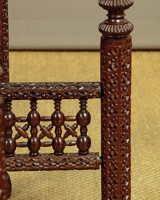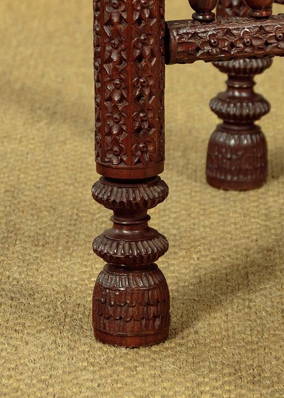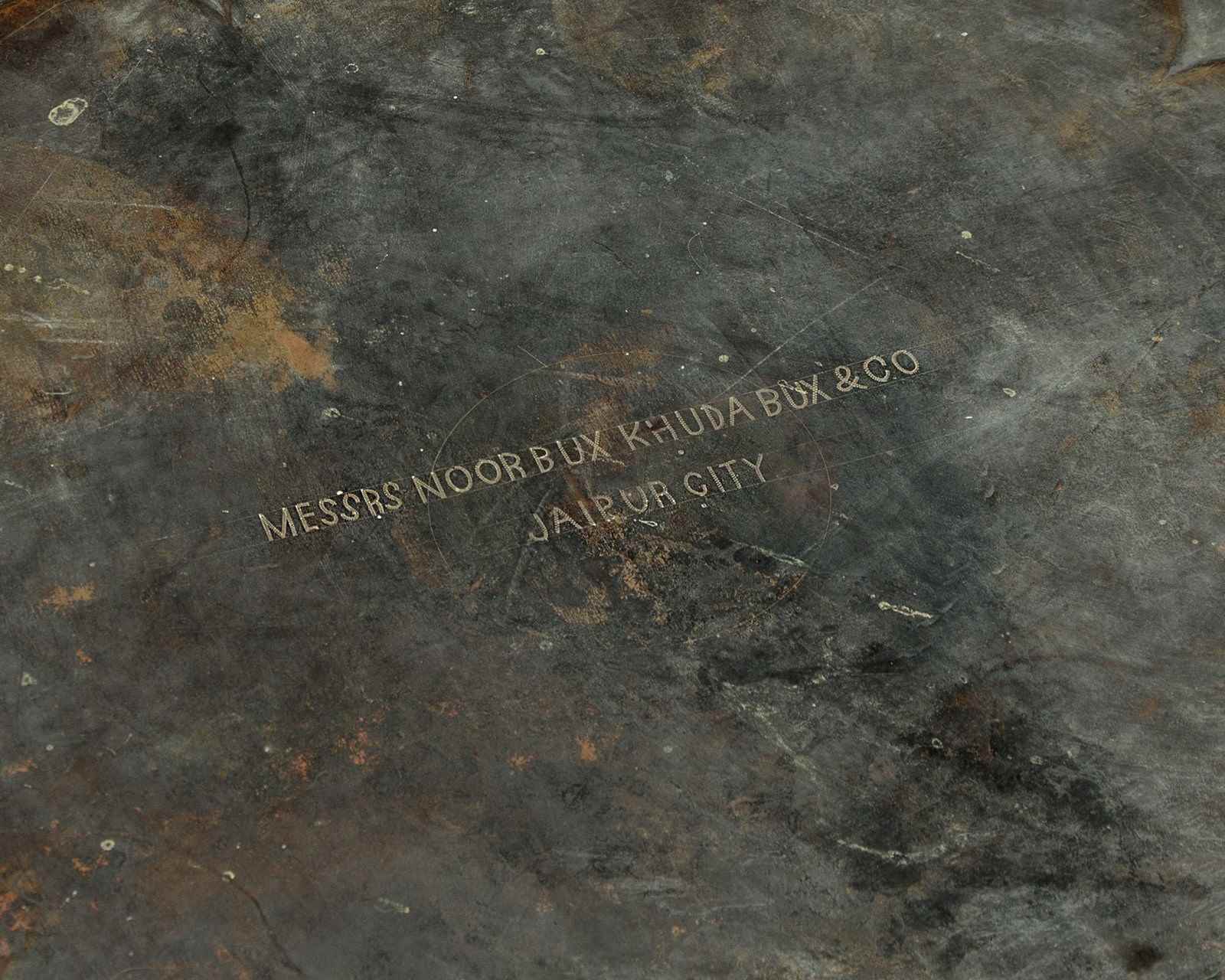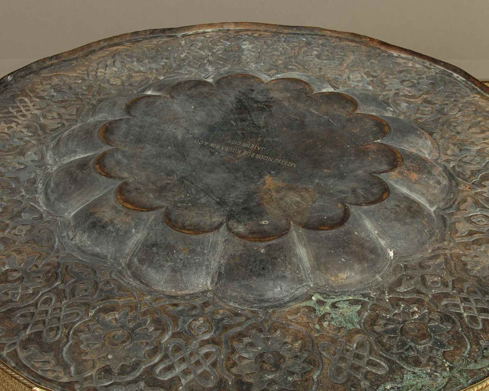 Remarkable large Indian brass table by Messrs Noor Bux Khuda Bux & Co. of Jaipur c.1900. By far the biggest such table we have ever come across, measuring four feet in diameter. Brass tray top with a 14 lobed 2" deep recess at the centre surround by a broad repoussé work border with the dense raised pattern against a dimpled ground. With a rope twist patterned edge and large engraved maker's inscription on the underside. The top sits loose on a carved hardwood base (diameter 34") with turned elements and mashrabiya detail to the stretchers. Excellent condition, cleaned and waxed in our workshops.