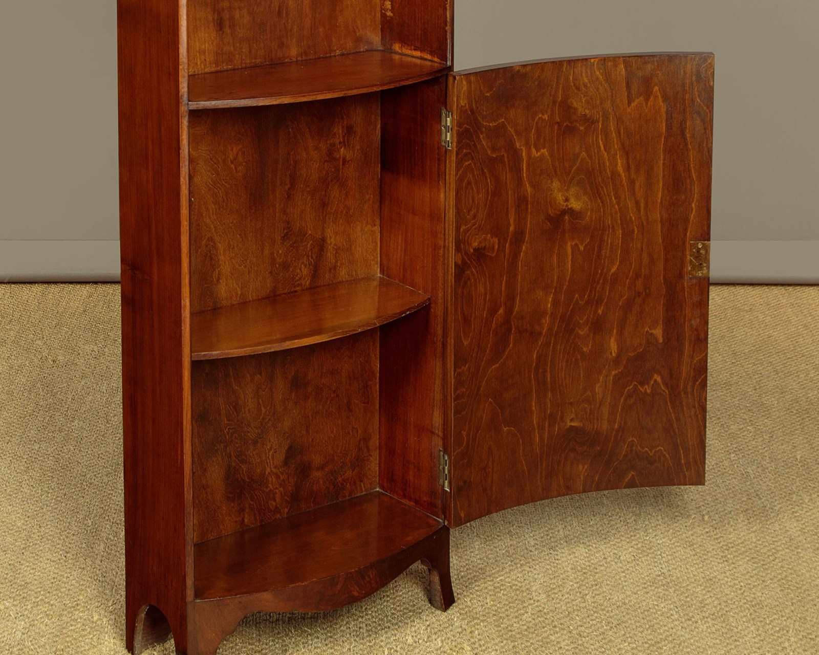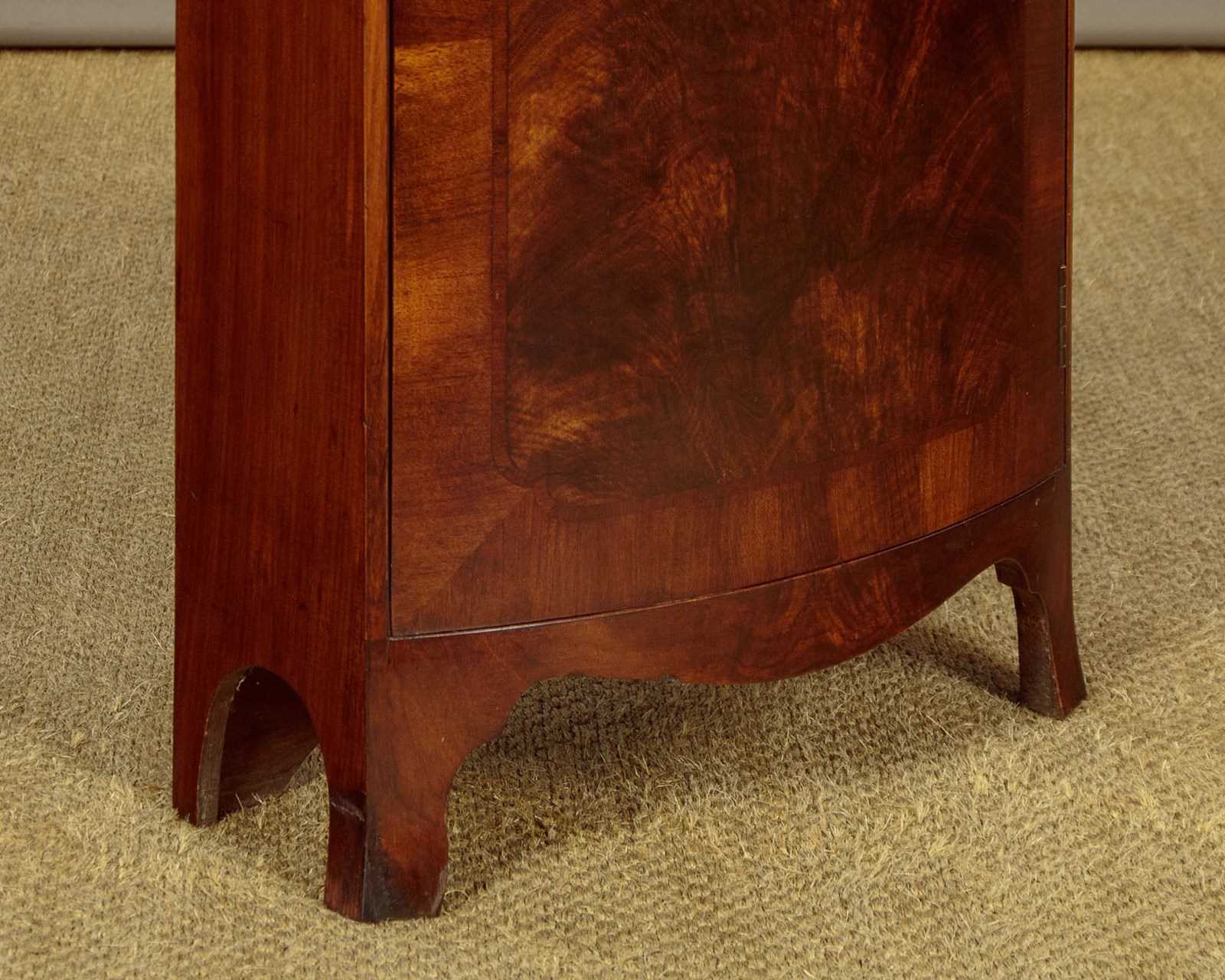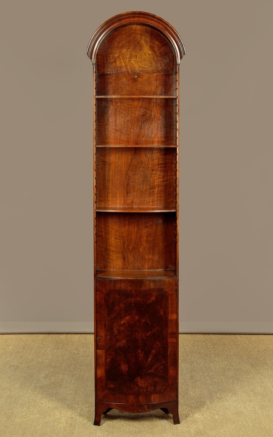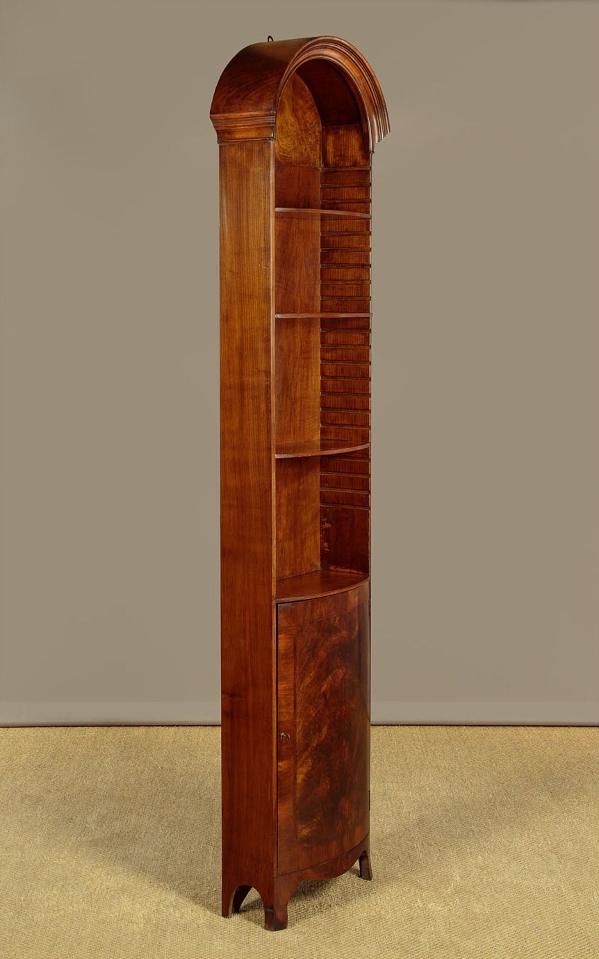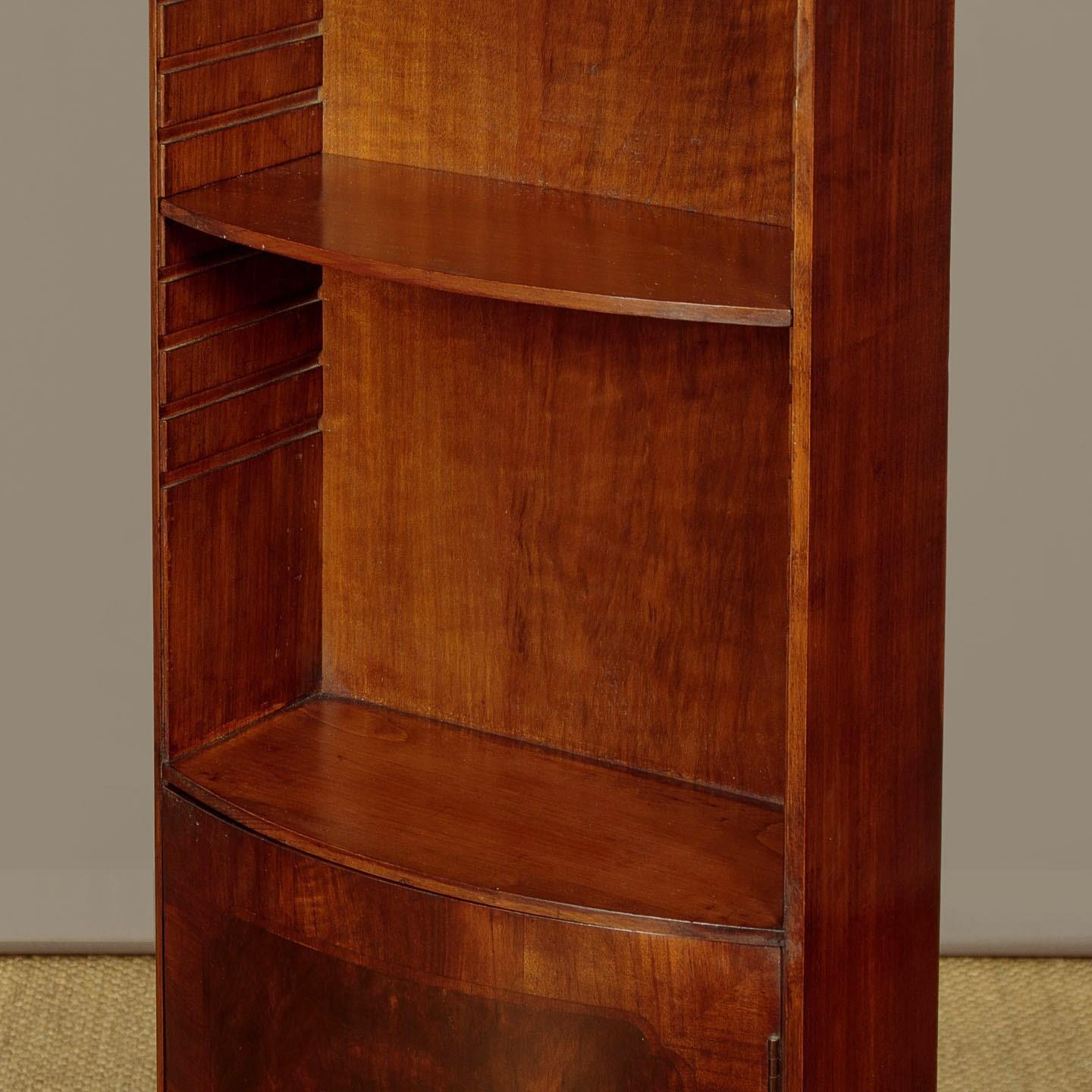 Elegant early 20th.c. mahogany bow front 'pencil' bookcase c.1930. Just 19" wide, arched top with moulded cornice. Over four shelves (max depth 7½"), three of which are adjustable, plus a useful cupboard in the base with a single shelf inside. Well figured mahogany veneers to the inside of the back and to the door panel with also has a crossbanded and inlaid border. Solid mahogany sides. Shaped apron and legs . Excellent condition, cleaned and polished in our workshops. Key supplied.
