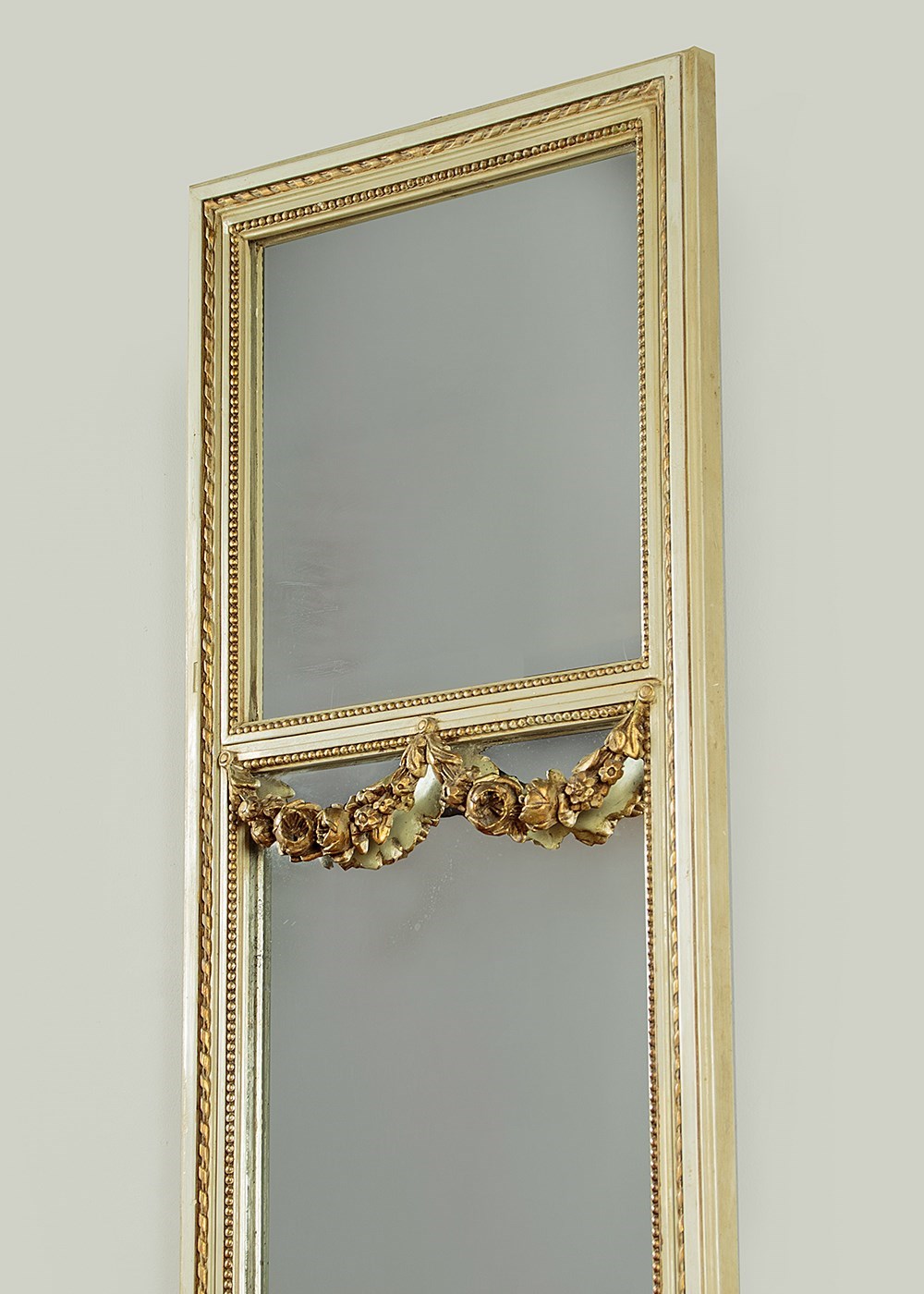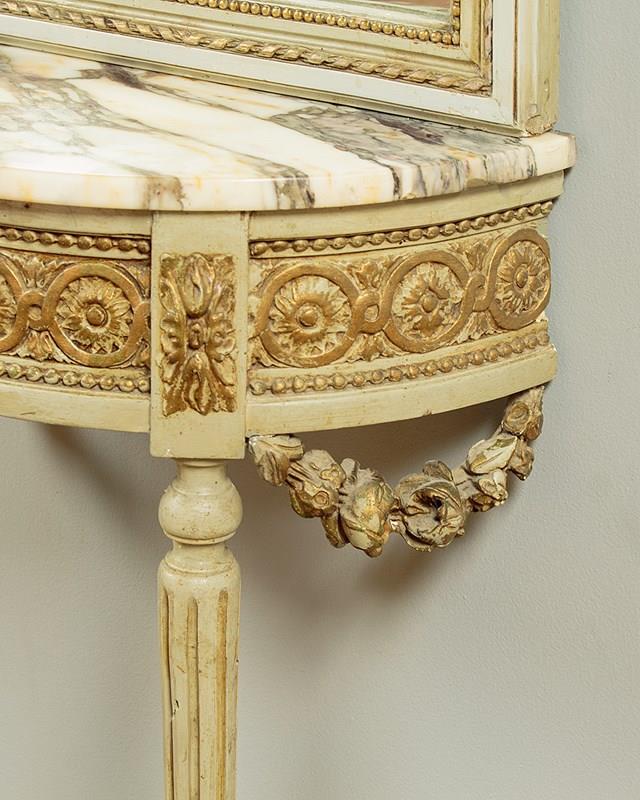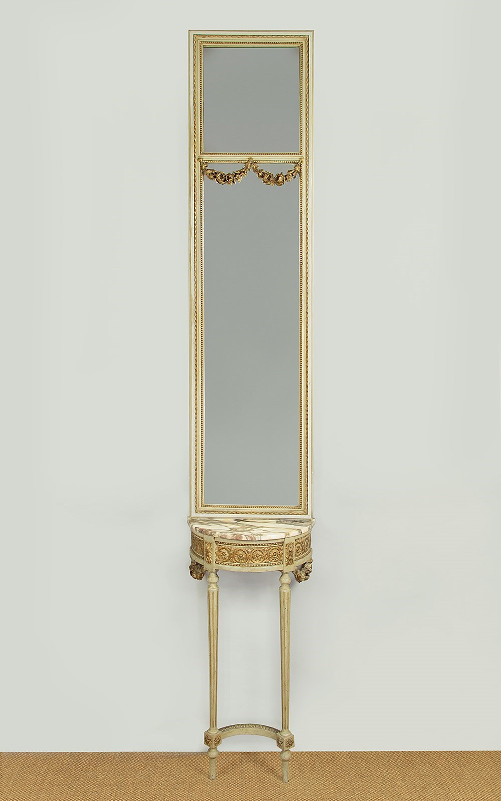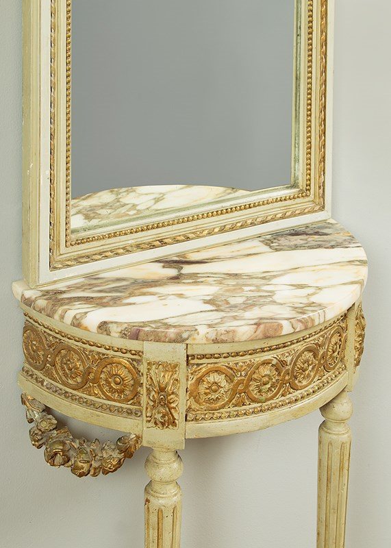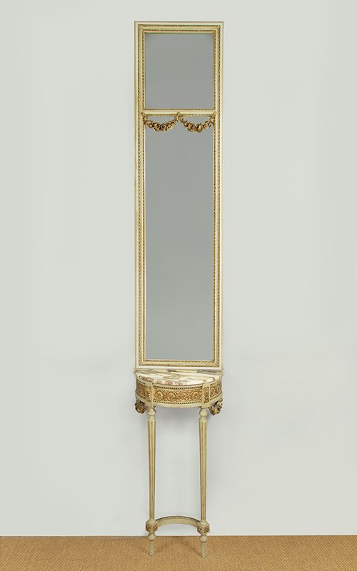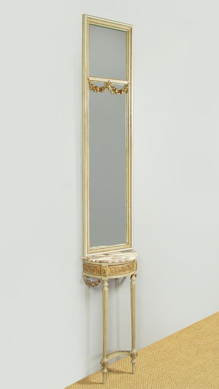 Unusually tall and narrow console table and mirror c.1930. Slim mirror with two plates within a carved frame painted a pale green/grey with gilded detail and featuring carved wooden floral swags across the top of the lower plate. The mirror stands on a half moon shaped marble top console table (just 16½" wide) painted to match and with a guilloche carved frieze, tapering turned and reeded legs joined with a turned stretcher and with carved floral swags to the sides. Some spots of tarnish to the mirror plate, otherwise good condition, cleaned and waxed in our workshops.