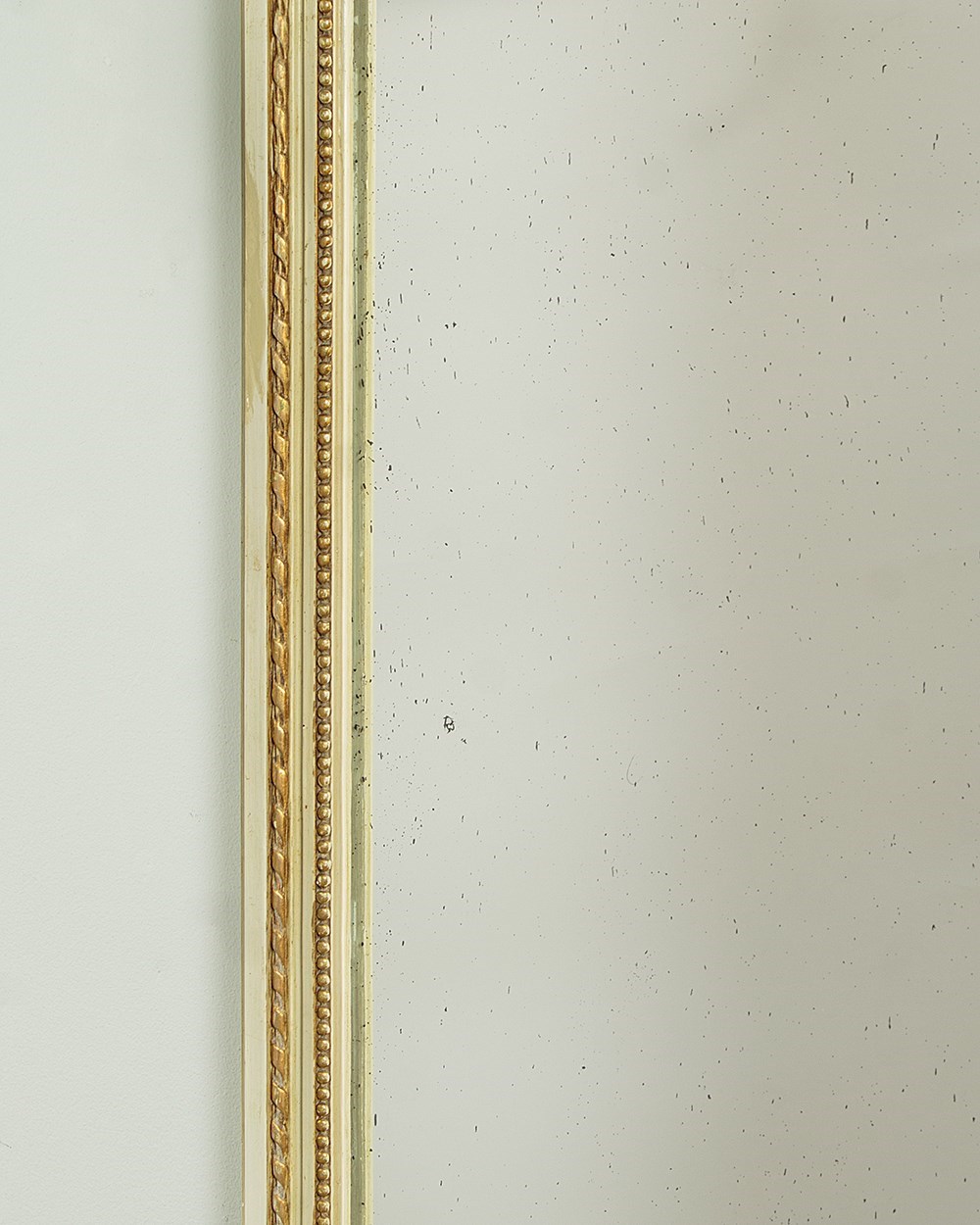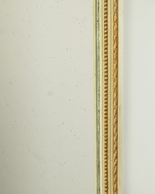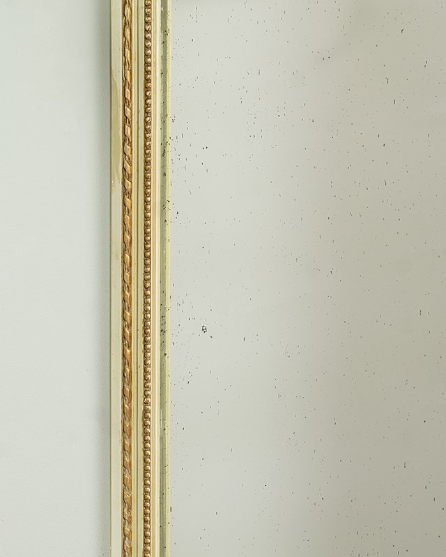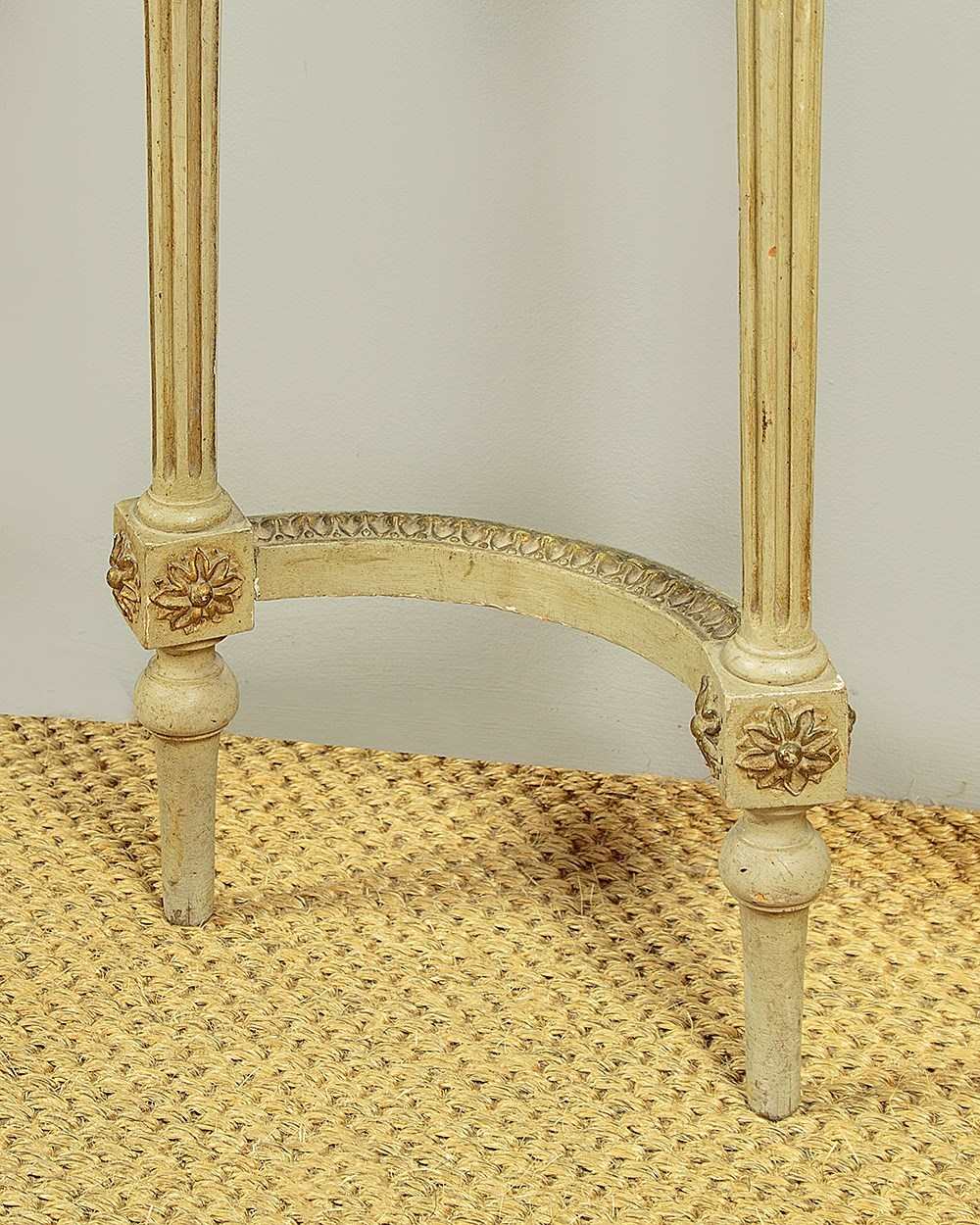 Unusually tall and narrow console table and mirror c.1930. Slim mirror with two plates within a carved frame painted a pale green/grey with gilded detail and featuring carved wooden floral swags across the top of the lower plate. The mirror stands on a half moon shaped marble top console table (just 16½" wide) painted to match and with a guilloche carved frieze, tapering turned and reeded legs joined with a turned stretcher and with carved floral swags to the sides. Some spots of tarnish to the mirror plate, otherwise good condition, cleaned and waxed in our workshops.
