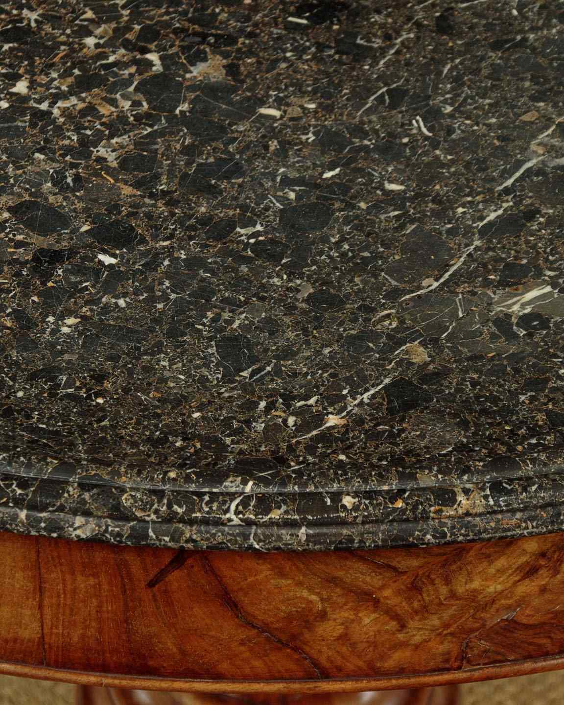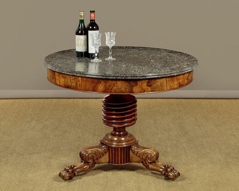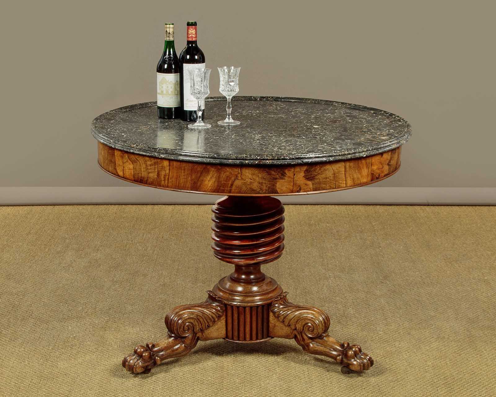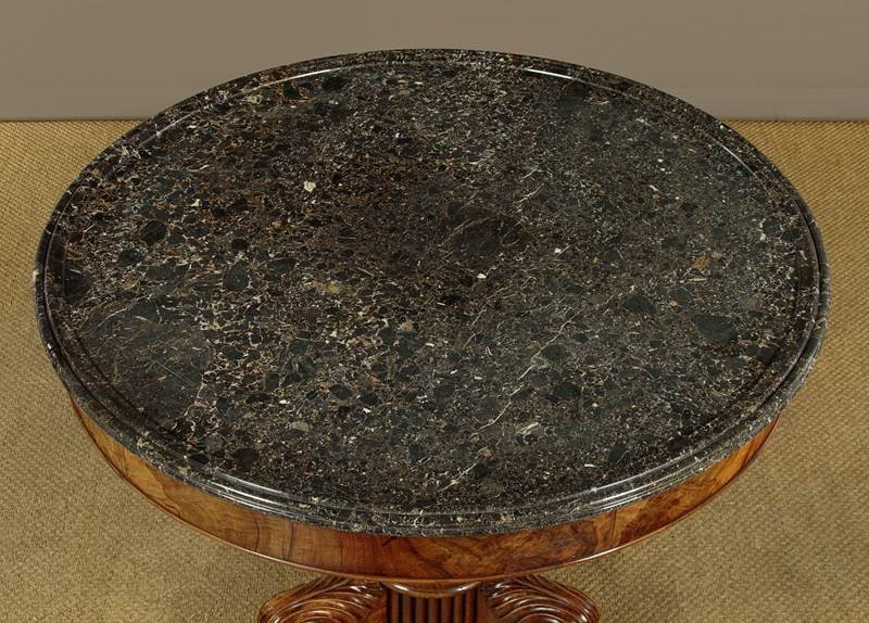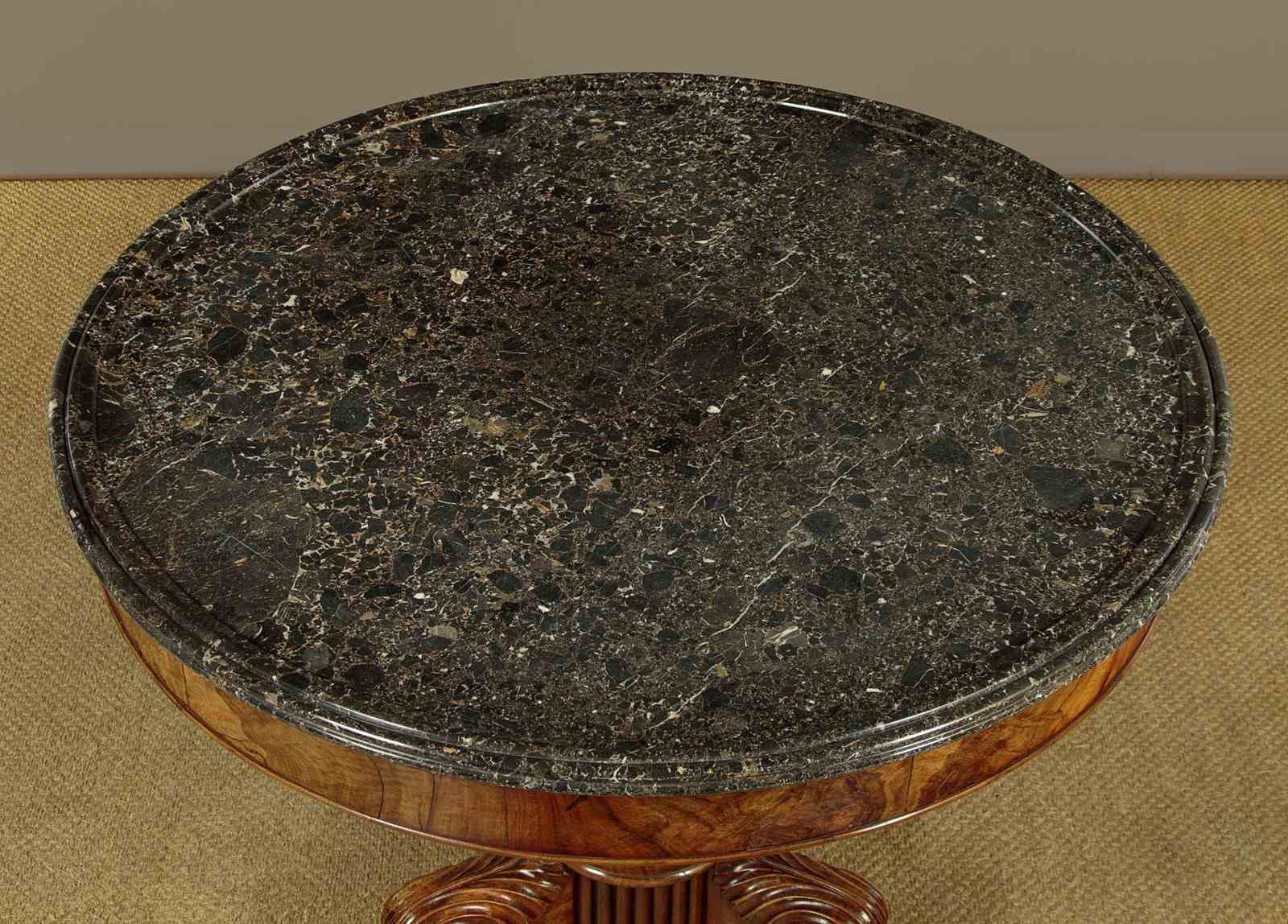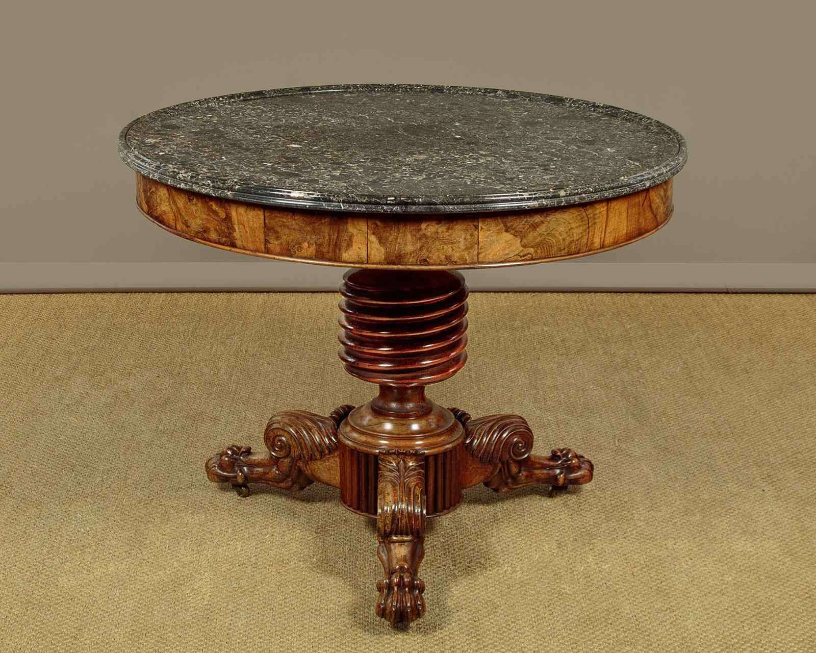 Superb early 19th.c. French marble top gueridon or centre table c.1840. Original 38½″ diameter top in well figured grey marble, the edge moulded with a border of concentric rings designed to stop spilt liquids from running over the sides. Highly figured walnut veneered apron with an applied moulding around the bottom edge. Very unusual corkscrew carved column over splendid Empire style tripod legs carved with scrolling acanthus leaves and large claw feet. With the original wooden wheeled castors below. Excellent colour and condition, cleaned and waxed in our workshops.