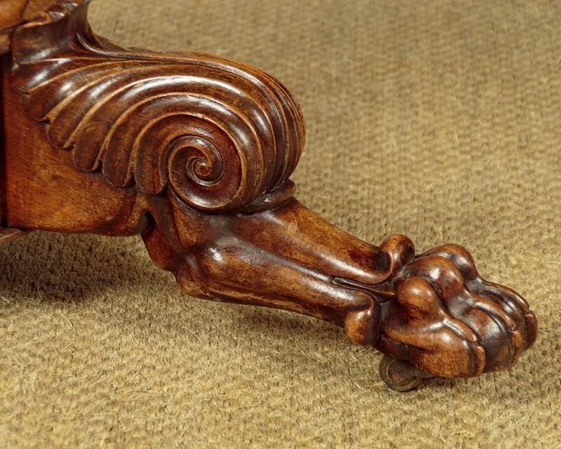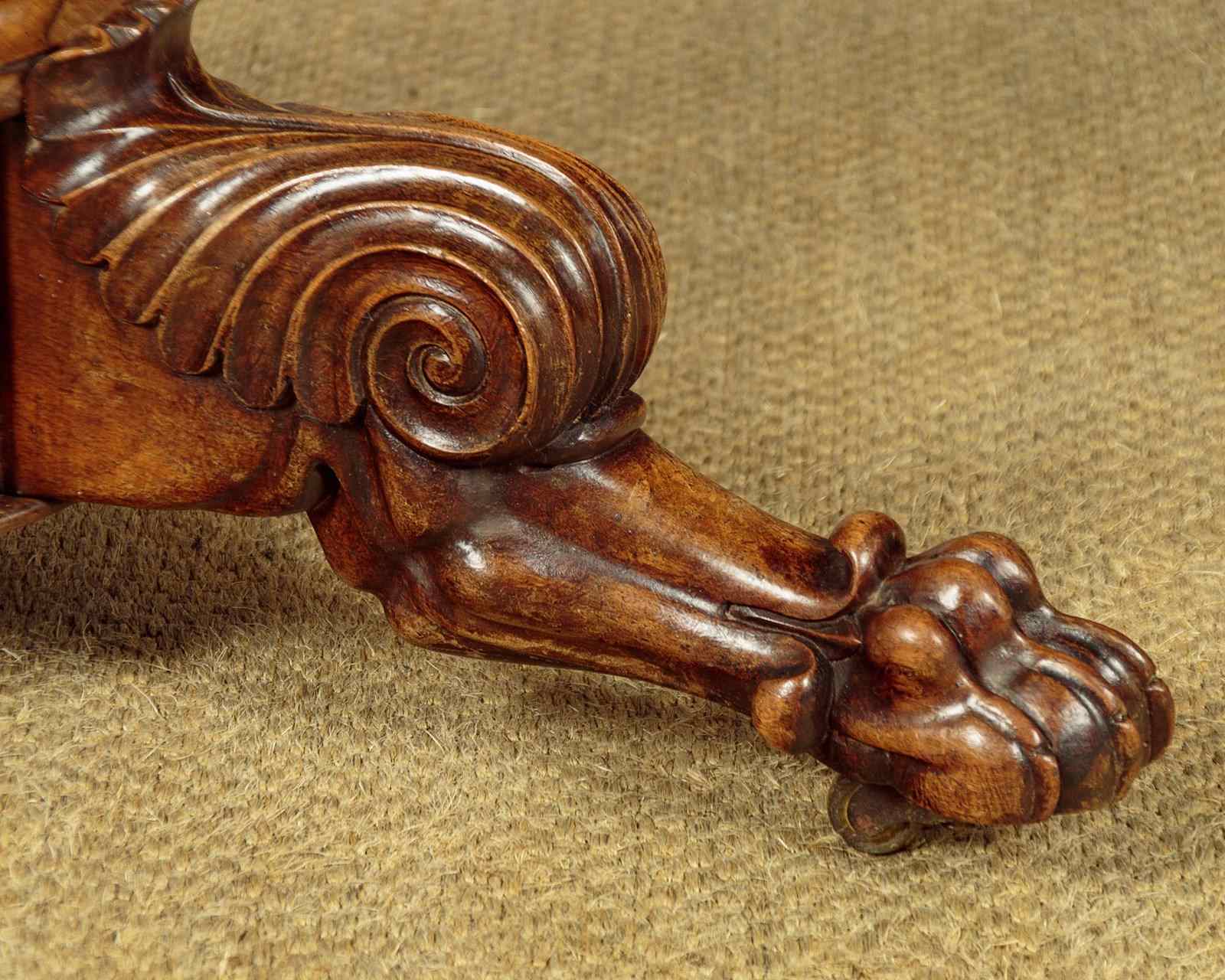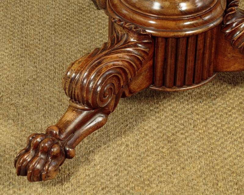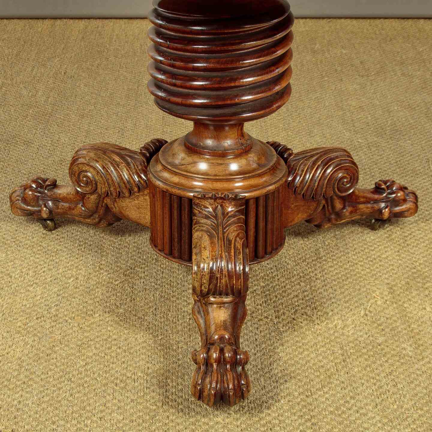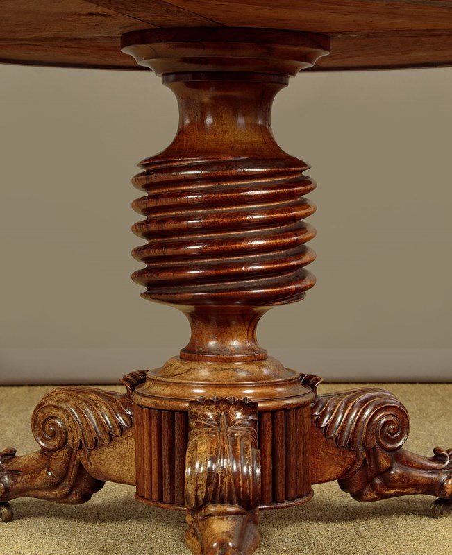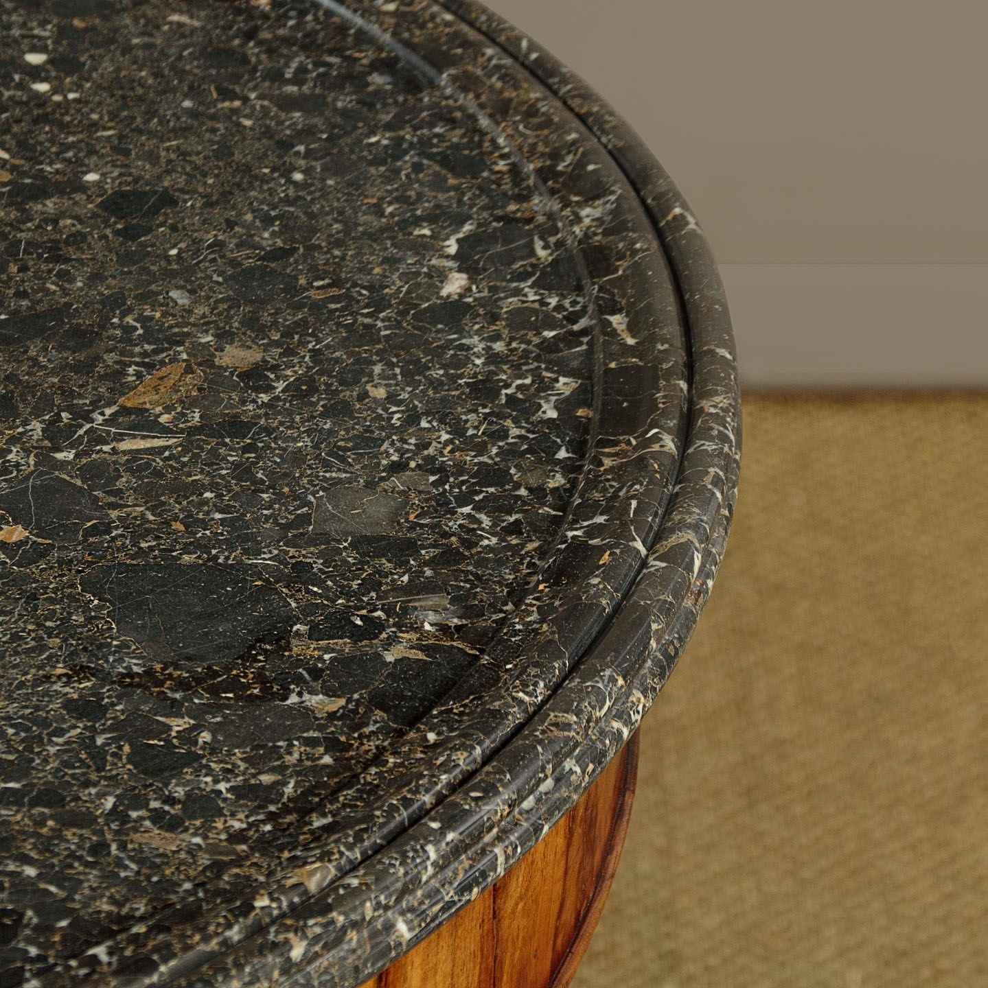 Superb early 19th.c. French marble top gueridon or centre table c.1840. Original 38½″ diameter top in well figured grey marble, the edge moulded with a border of concentric rings designed to stop spilt liquids from running over the sides. Highly figured walnut veneered apron with an applied moulding around the bottom edge. Very unusual corkscrew carved column over splendid Empire style tripod legs carved with scrolling acanthus leaves and large claw feet. With the original wooden wheeled castors below. Excellent colour and condition, cleaned and waxed in our workshops.