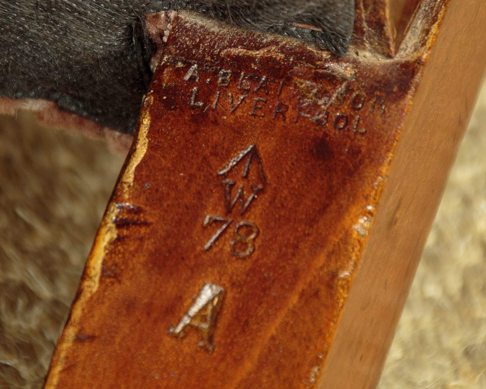 Splendid walnut sofa by the quality English cabinet makers A. Blain of Liverpool c.1870. 6'6" long with a raked and button upholstered backrest and curving and padded arms over a deep sprung seat. Exposed walnut frame and crisp turned arm supports. Turned front legs and raised on white ceramic castors. Stamped for A.Blain Liverpool on the rear right hand leg. Note also the arrowhead and date stamp suggesting it was once crown, government or military property. Very good condition with serviceable upholstery.