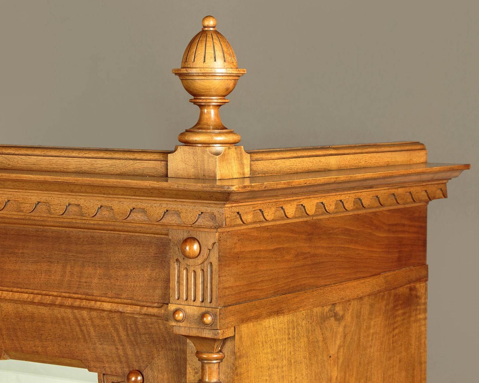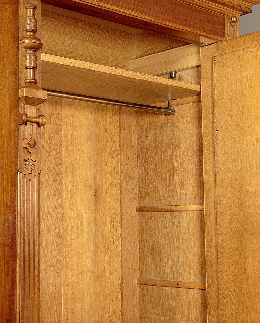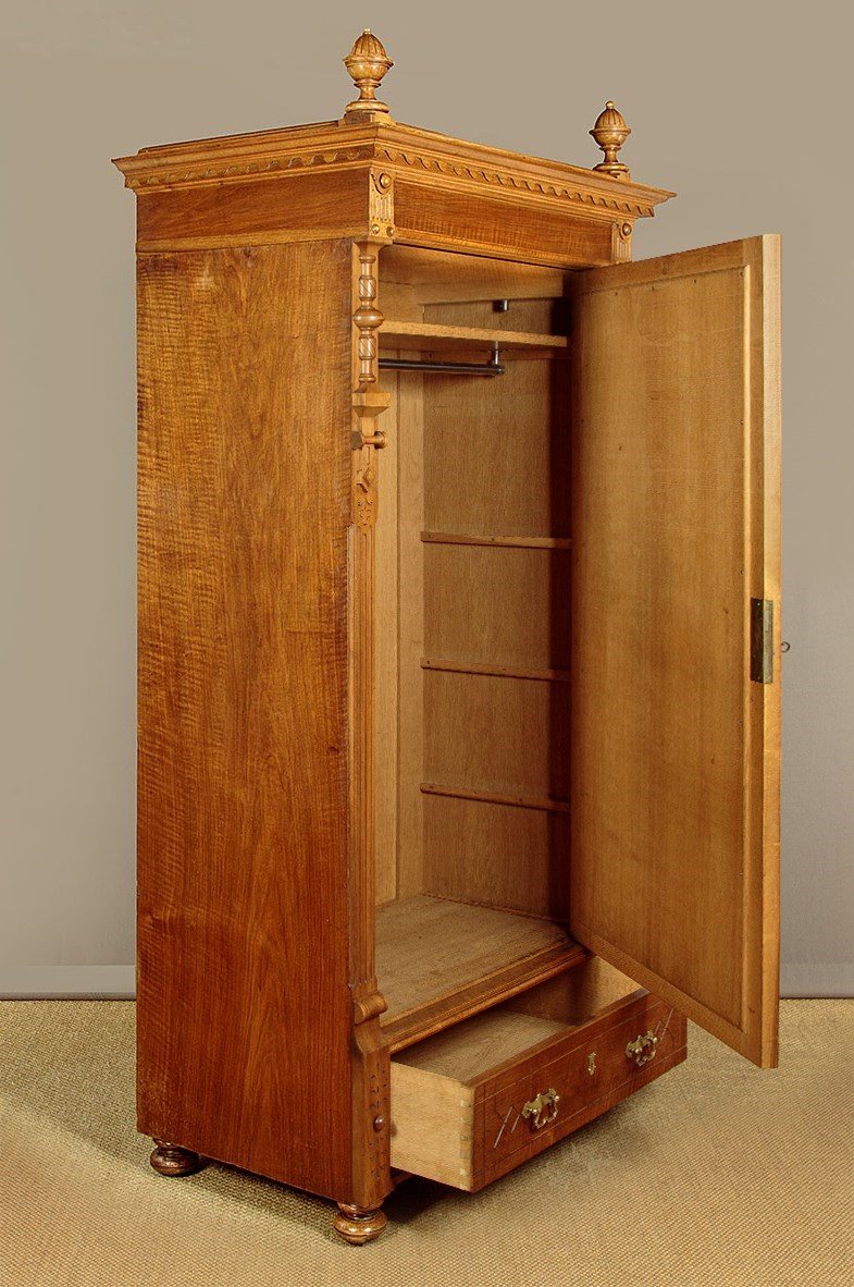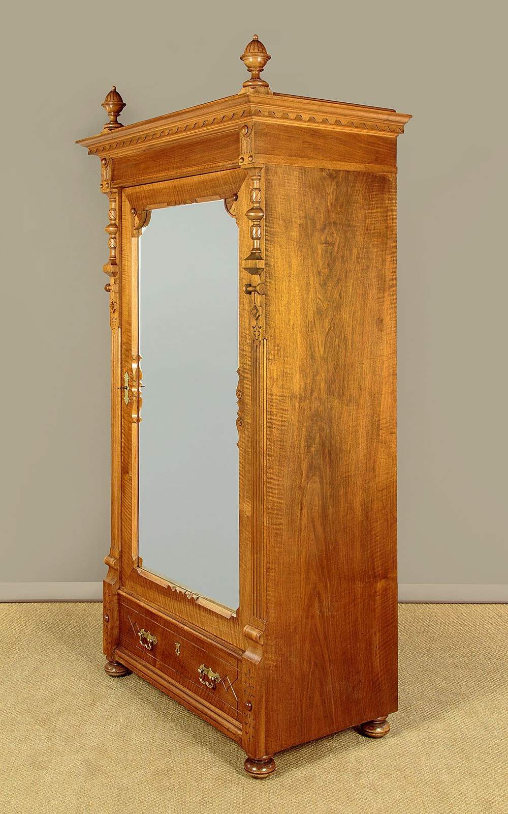 Very smart French walnut wardrobe or armoire c.1920. Single door wardrobe with a full length dressing mirror to the door, fitted inside with a hanging rail and a single shelf (internal depth 17½"), over a useful drawer in the base. Flared cornice with a carved frieze and topped with a splendid pair of large turned and carved finials (easily removable). Crisp carved detail to the pilasters flanking the door. Fan shaped decoration at the top corners of the mirror, bevelled edge to the glass and the chamfered and shaped detail to the inner edge of the surrounding frame. Further carved detail to the drawer front, good quality brass handles and escutcheon. Note also the quality lock to the wardrobe door. Raised on turned bun feet front and rear. Superb quality with oak lined interior and drawer. Excellent colour and condition, cleaned and waxed in our workshops. Key supplied.