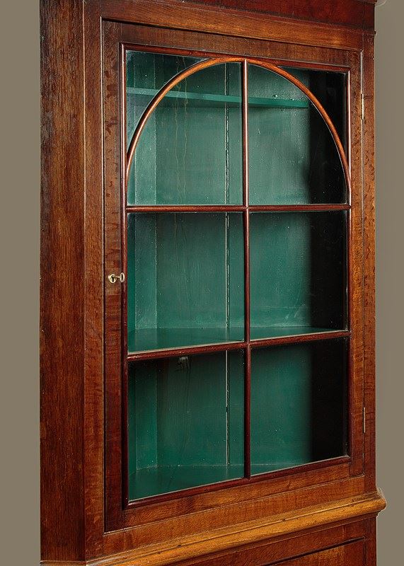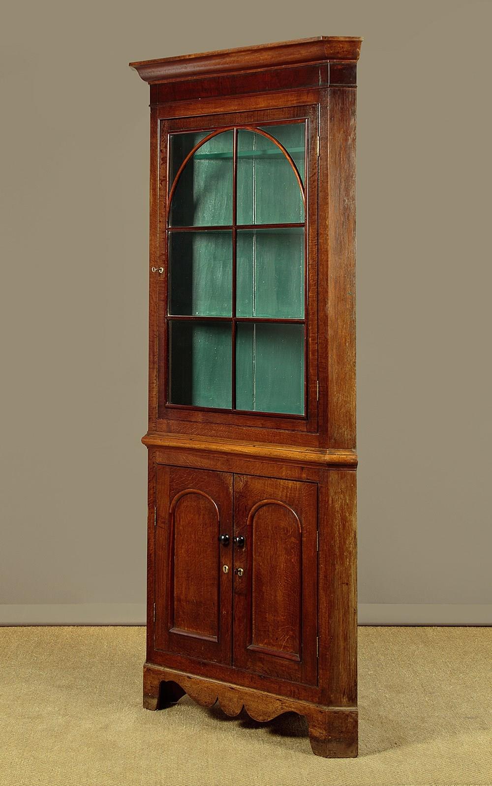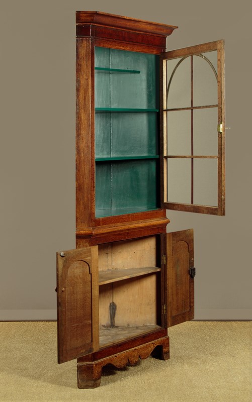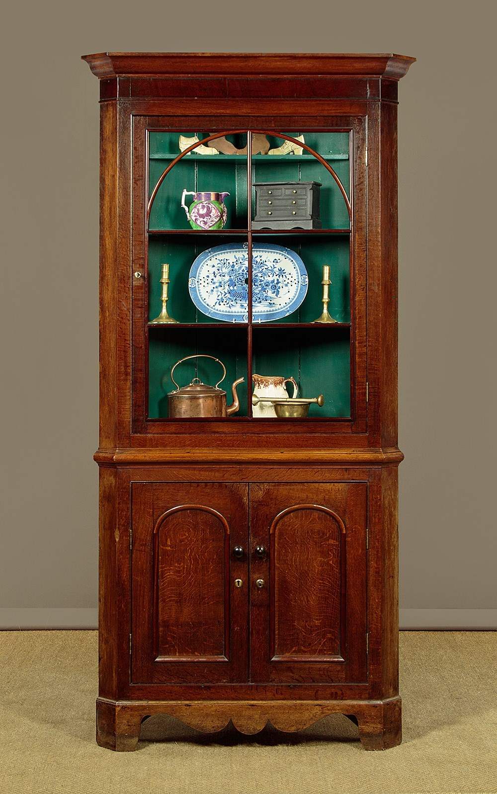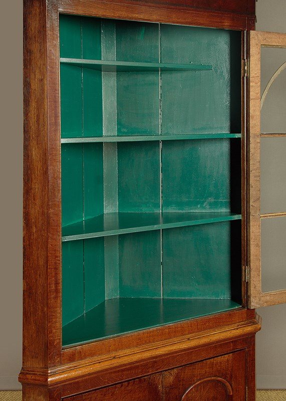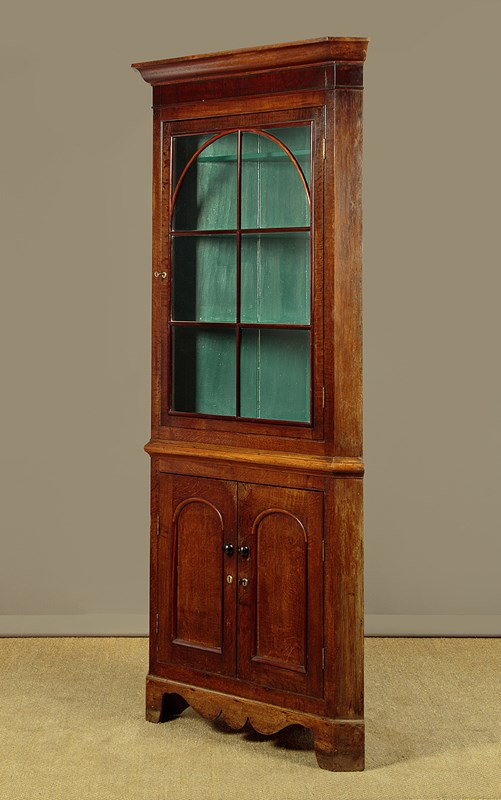 Early 19th.c. full length Welsh oak corner cupboard c.1820. Built as single piece with a glazed top, freshly painted a good Georgian green inside, with two shelves (max depth 13″) in line with the horizontal glazing bars, plus a small half depth shelf above. Over a blind two door cupboard base with a single shelf. Broad moulded cornice over a mahogany veneered frieze, arched glazing bars and arched panels to the doors in the base. Ogee waist moulding and particularly attractive shaped apron between the front feet. Very good colour and condition, cleaned and waxed in our workshops. Keys supplied.