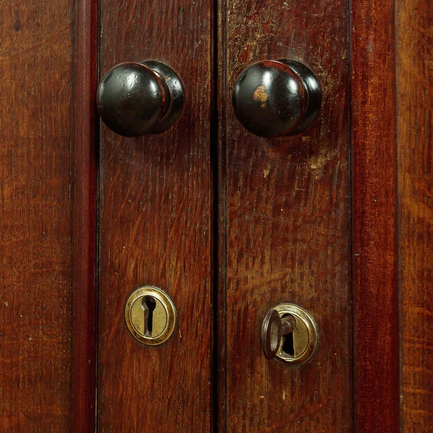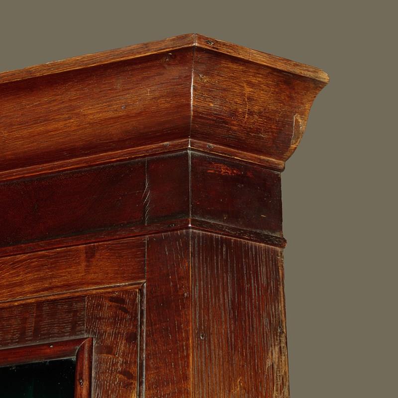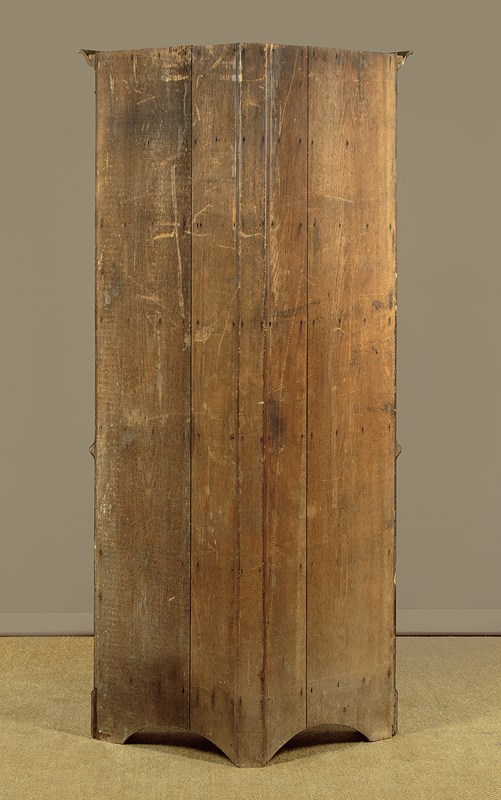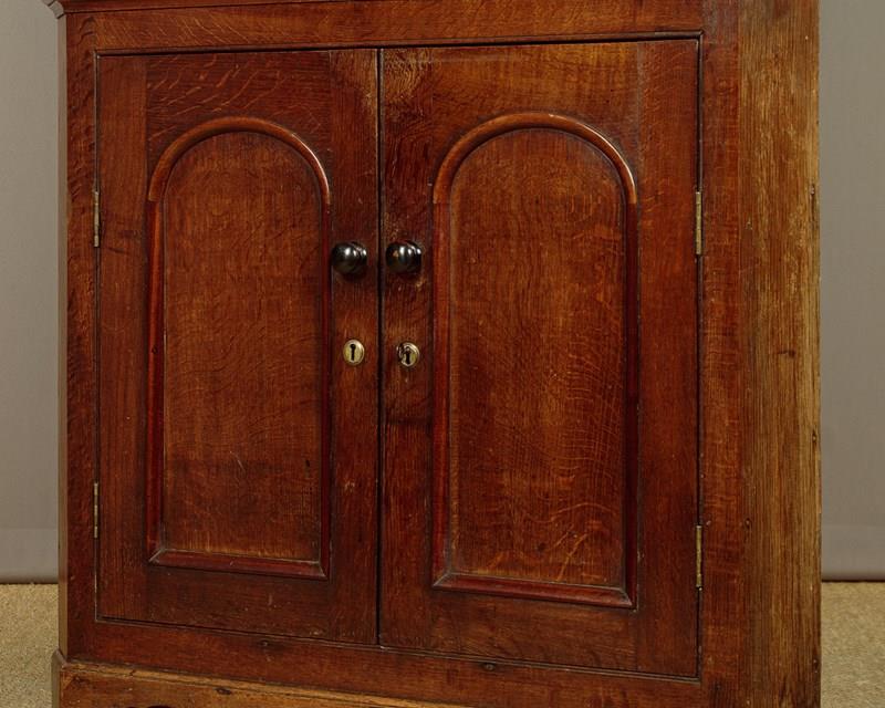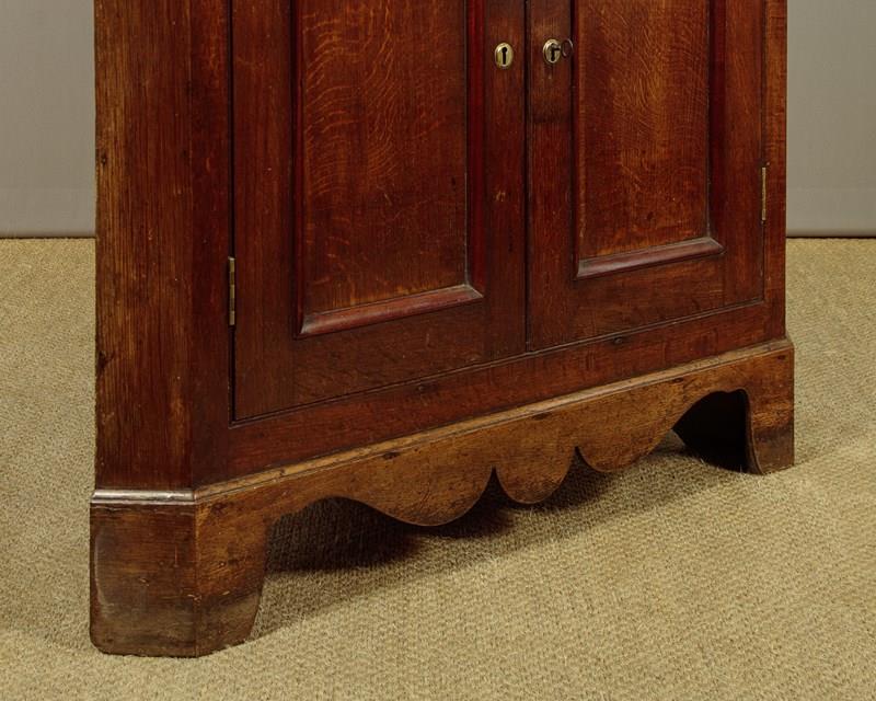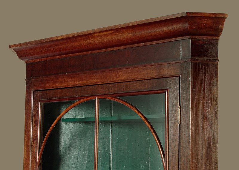 Early 19th.c. full length Welsh oak corner cupboard c.1820. Built as single piece with a glazed top, freshly painted a good Georgian green inside, with two shelves (max depth 13″) in line with the horizontal glazing bars, plus a small half depth shelf above. Over a blind two door cupboard base with a single shelf. Broad moulded cornice over a mahogany veneered frieze, arched glazing bars and arched panels to the doors in the base. Ogee waist moulding and particularly attractive shaped apron between the front feet. Very good colour and condition, cleaned and waxed in our workshops. Keys supplied.