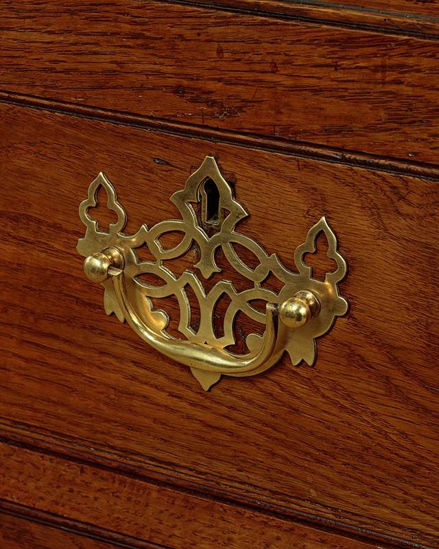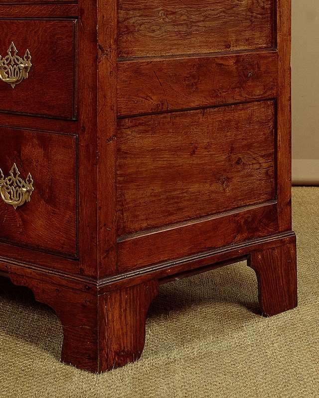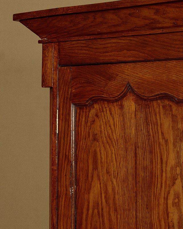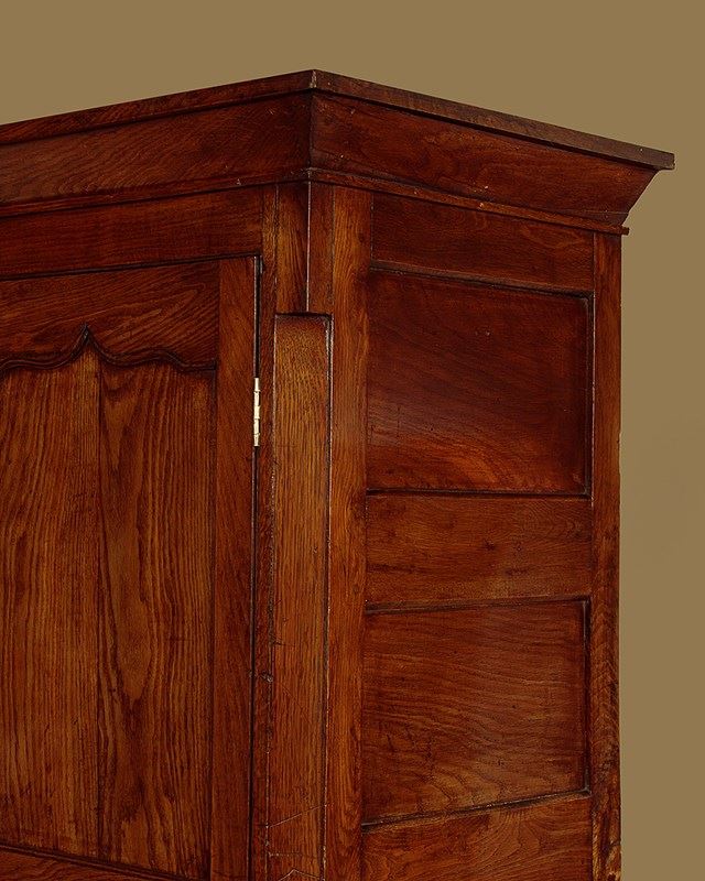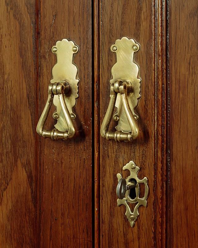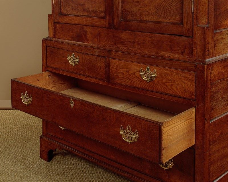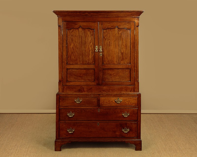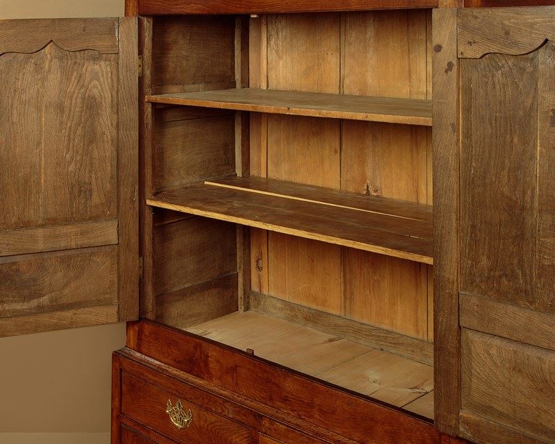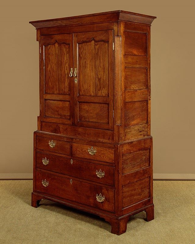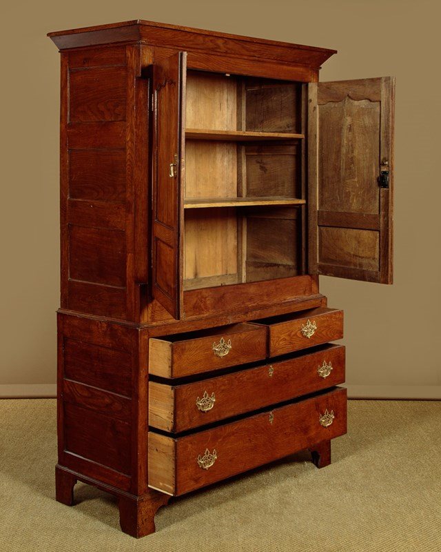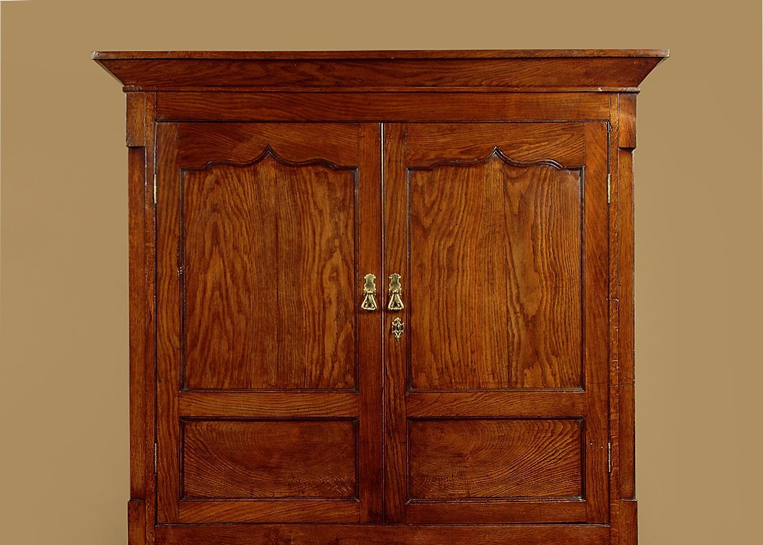 Late 18th.c. Welsh oak kitchen cupboard or press c.1790. In two pieces with a two door cupboard top fitted with two shelves inside (depth 18″). On a base with two short and two long drawers of graduated height. Particularly attractive ogee arch top door panels with moulded detail to the surround. Note how the pronounced grain of the timber on the door panels is arranged symmetrically. Simple flared cornice echoed in the canted pilasters flanking the doors. Georgian pattern brass handles with pierced back plates. Oak panelled sides, moulded trim around the base and raised on shaped bracket feet to the front and sides. Excellent colour and condition, cleaned and waxed in our workshops. Cupboard door key supplied.