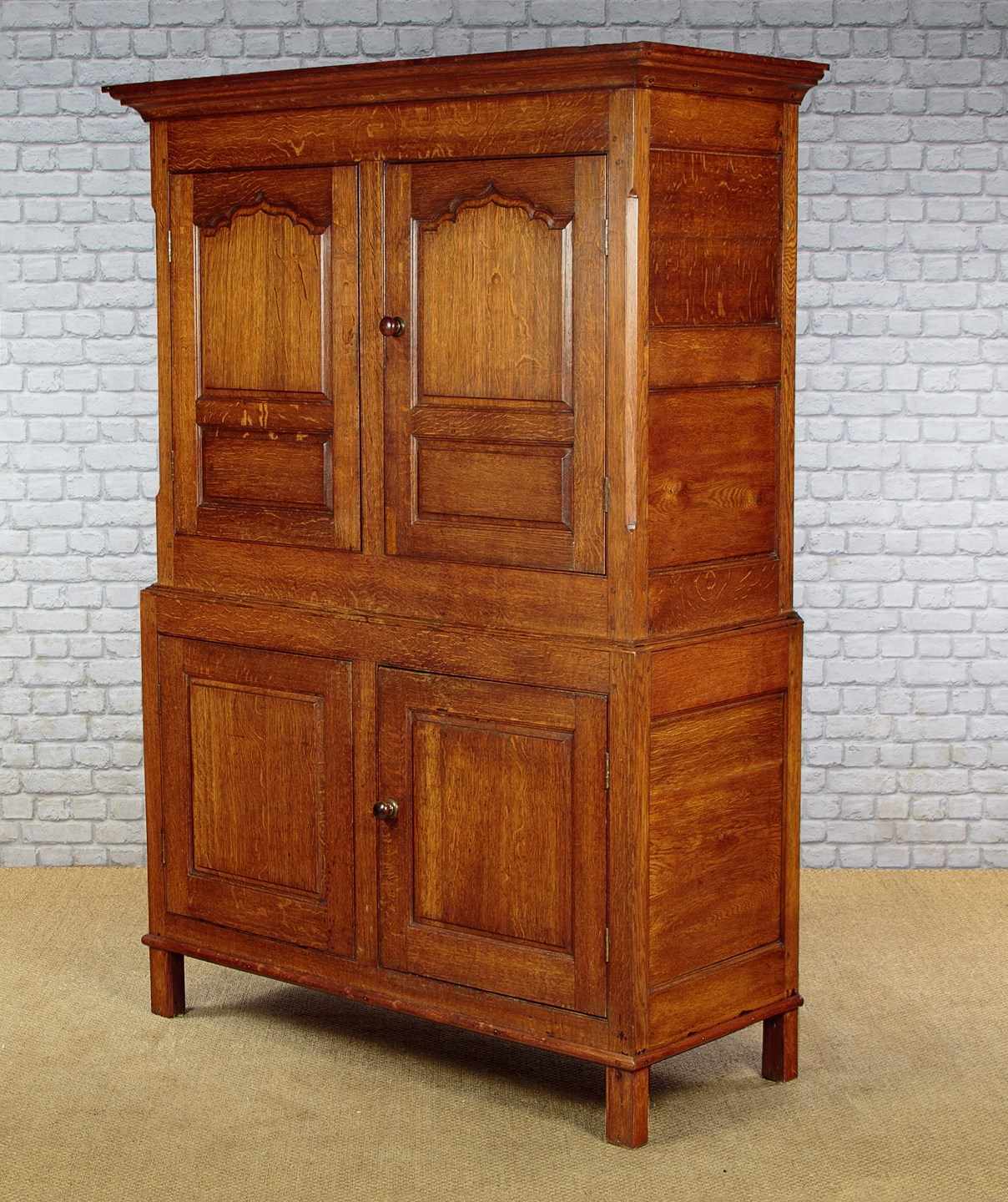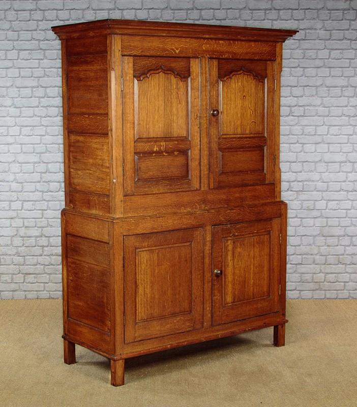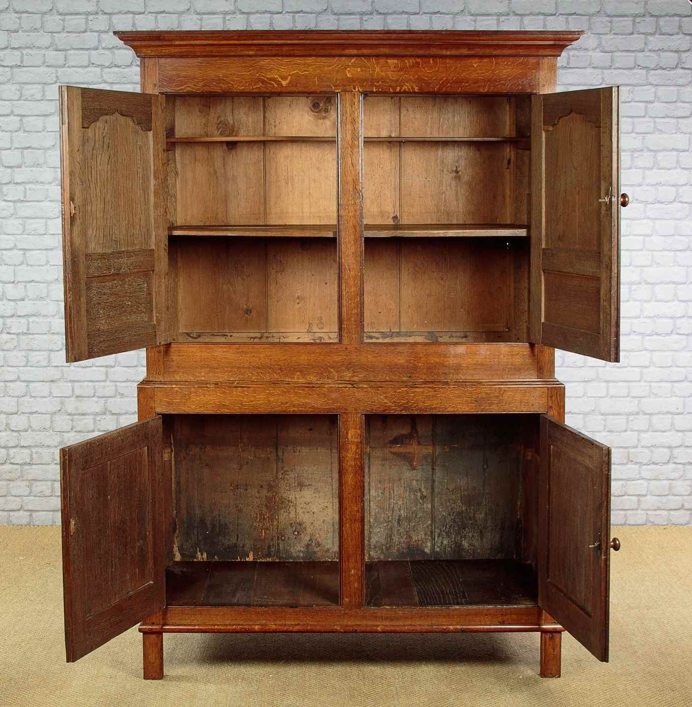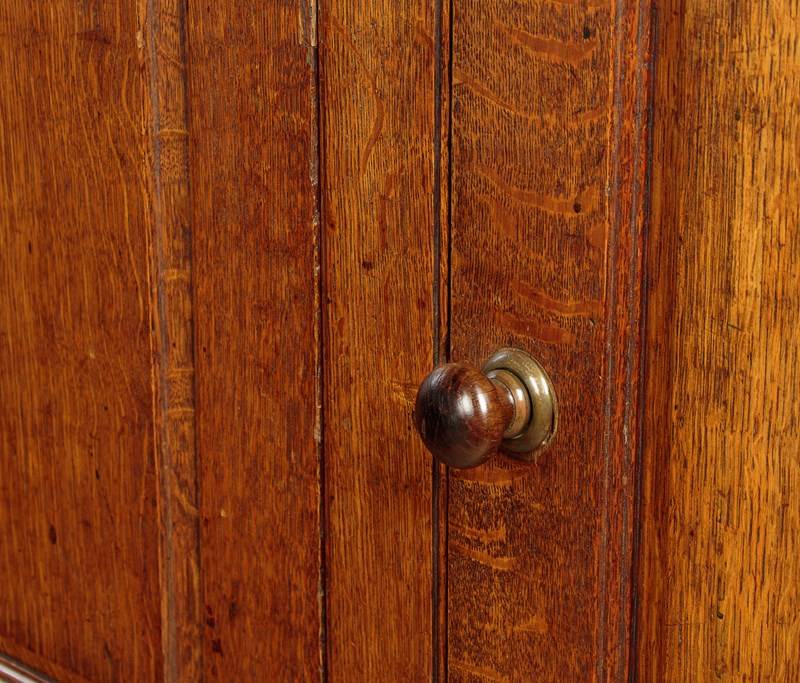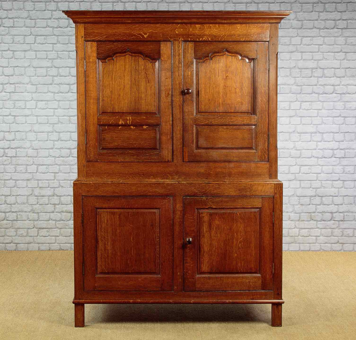 Very useful early 19th.c. Welsh oak kitchen cupboard c.1810. In two pieces, the upper section fitted with one full depth (17½") shelf plus a shallower shelf above, over a slightly deeper cupboard base (internal depth 19"). Moulded cornice over lovely ogee arch shaped raised and fielded panels to the upper doors. Square lower panels, also raised and fielded and with moulded surround. Wooden knobs, ogee moulding at waist, and a simple thumb moulding around the base. Raised on the original long stiles. Oak panelled sides, deal back boards. With a repair to the bottom left hand corner of the right hand upper door. Otherwise very good colour and condition, cleaned and waxed in our workshops.