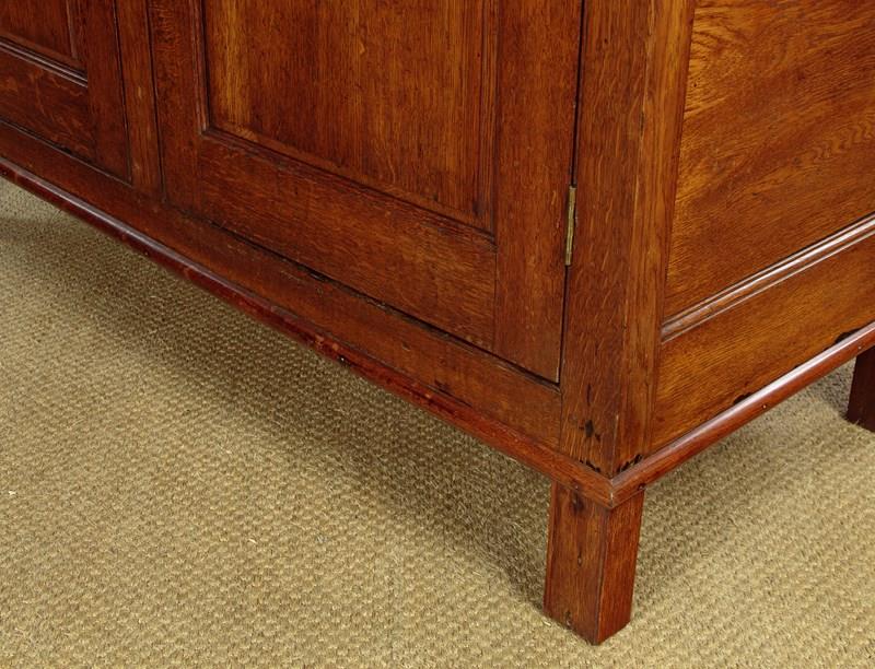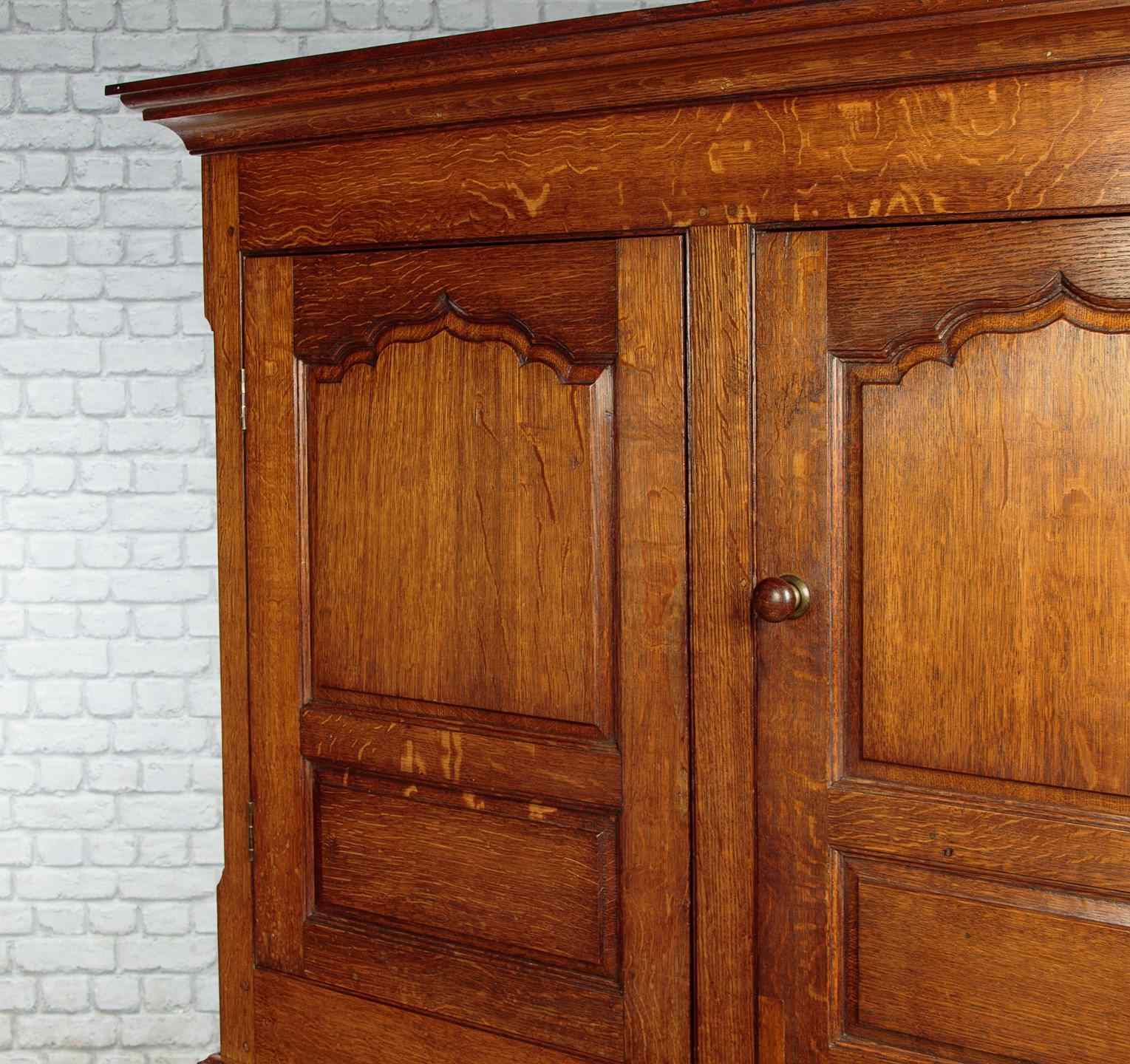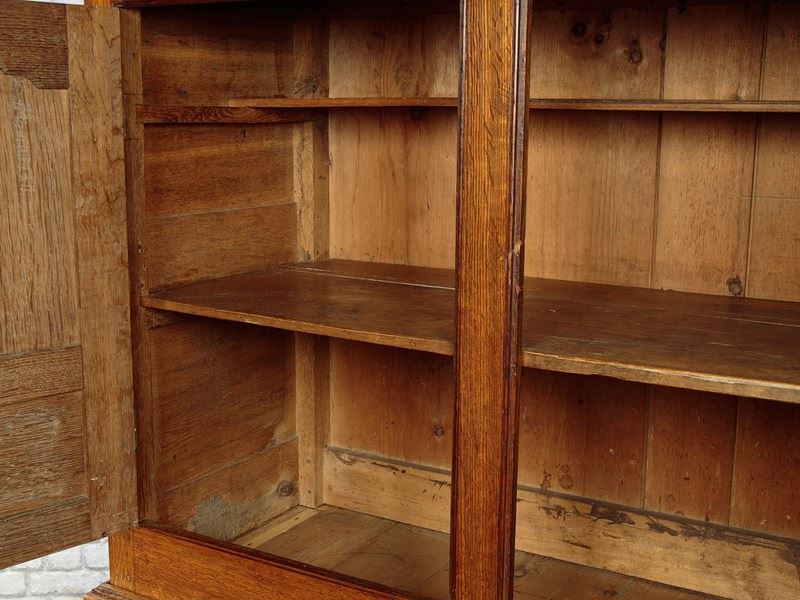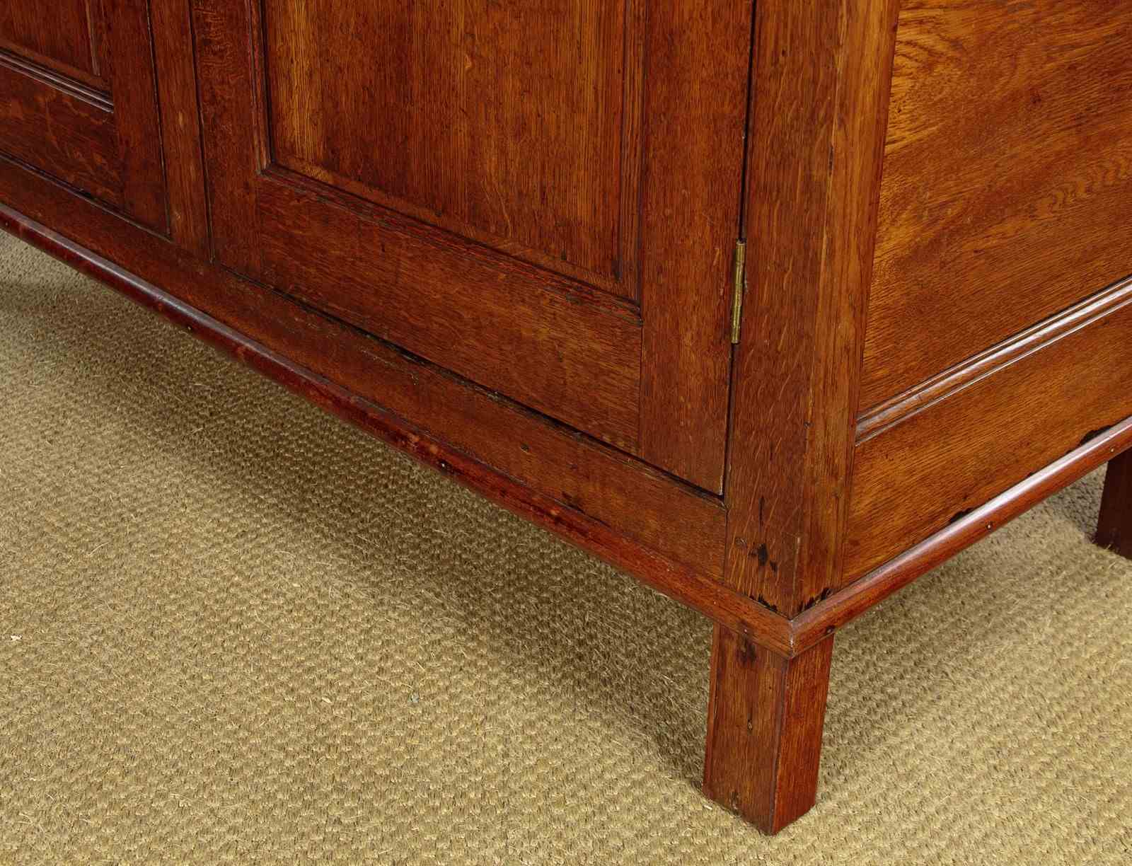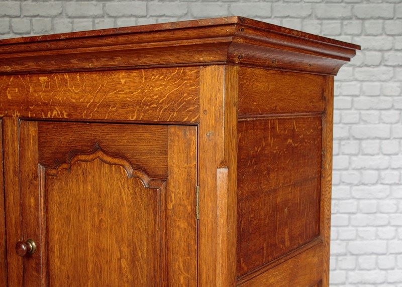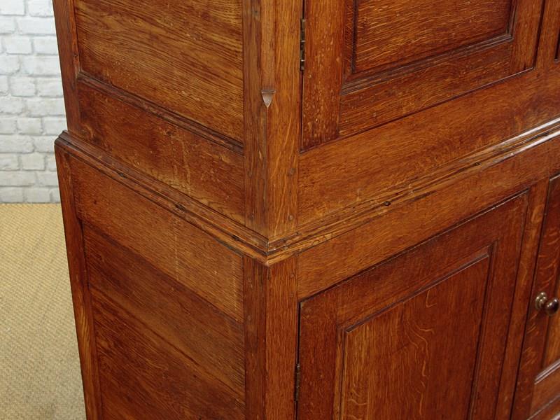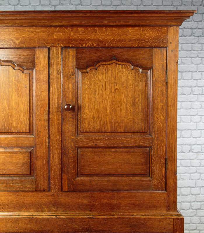 Very useful early 19th.c. Welsh oak kitchen cupboard c.1810. In two pieces, the upper section fitted with one full depth (17½") shelf plus a shallower shelf above, over a slightly deeper cupboard base (internal depth 19"). Moulded cornice over lovely ogee arch shaped raised and fielded panels to the upper doors. Square lower panels, also raised and fielded and with moulded surround. Wooden knobs, ogee moulding at waist, and a simple thumb moulding around the base. Raised on the original long stiles. Oak panelled sides, deal back boards. With a repair to the bottom left hand corner of the right hand upper door. Otherwise very good colour and condition, cleaned and waxed in our workshops.