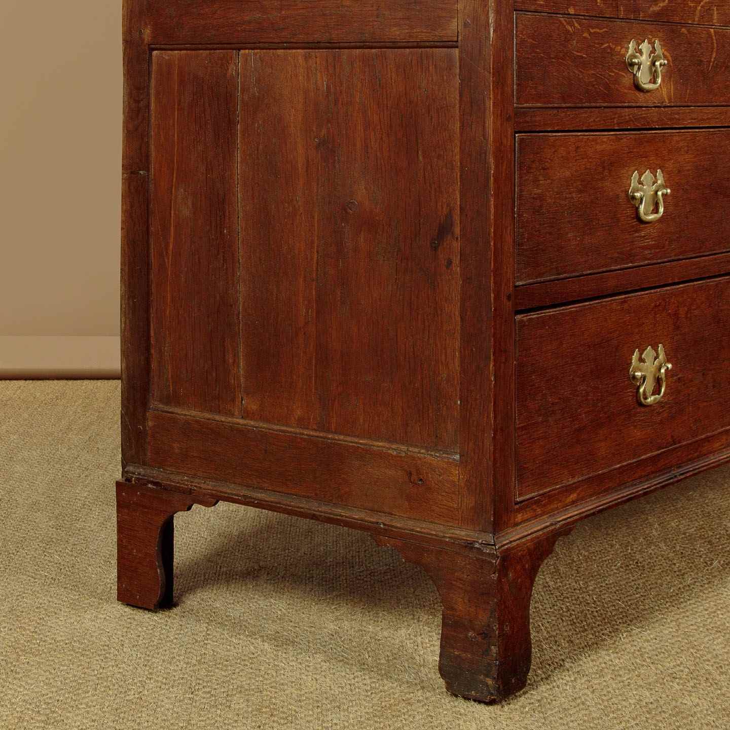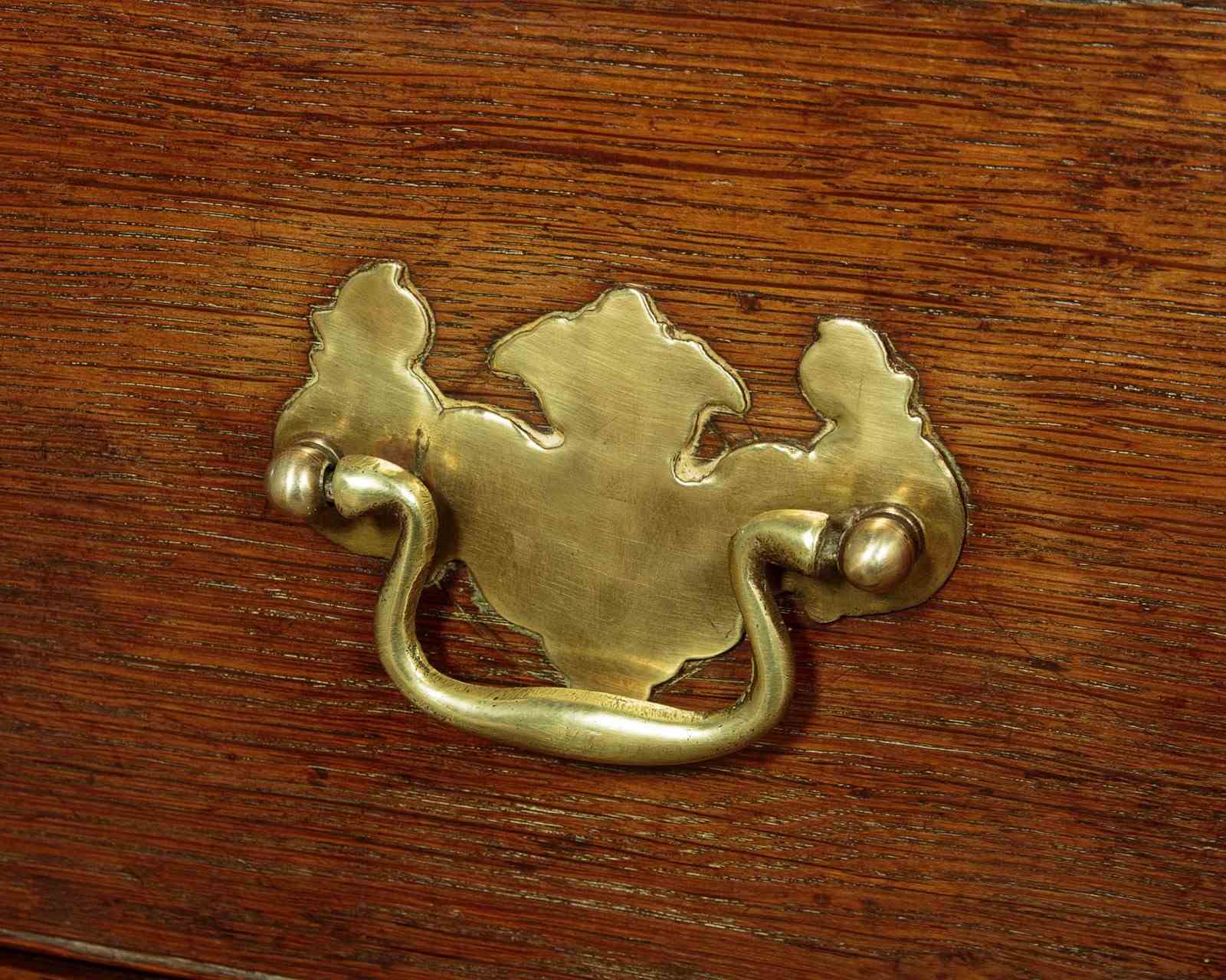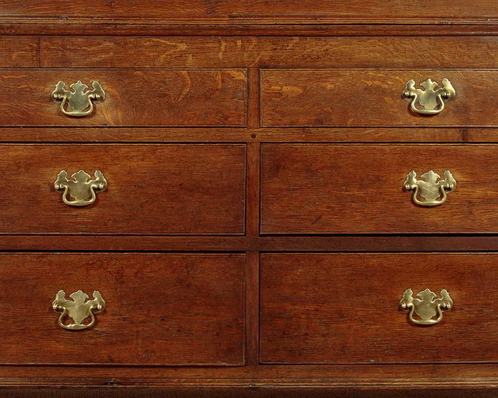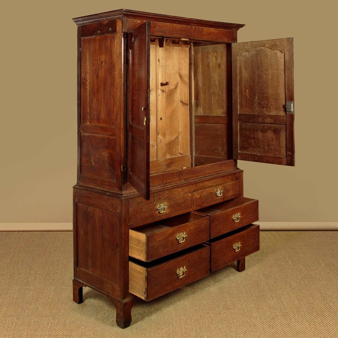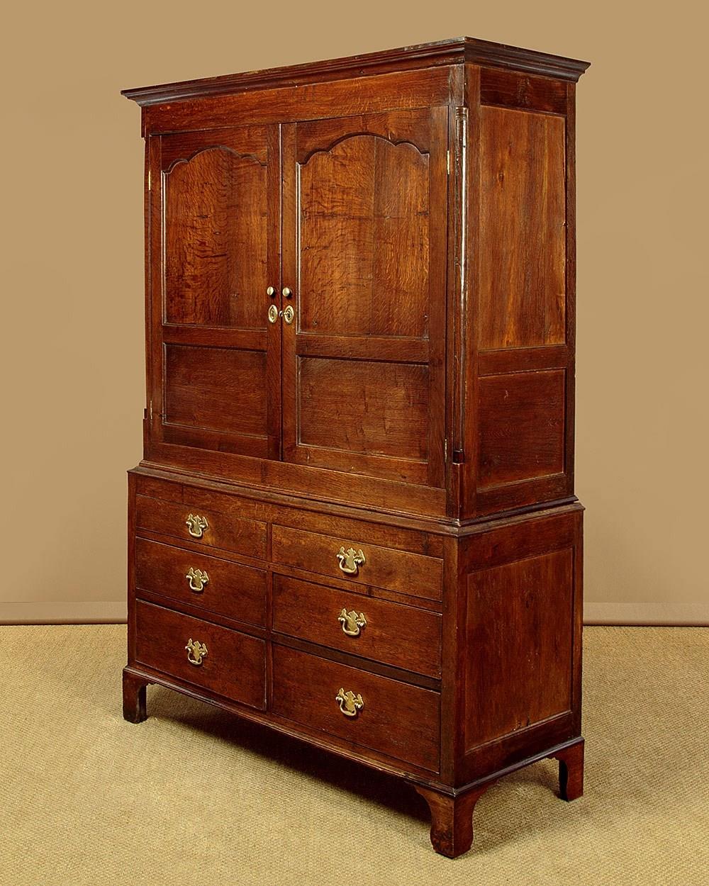Early 19th.c. North Wales oak cloak or tack cupboard c.1810. Two door cupboard top (internal depth 17") fitted inside with 9 original wooden hooks plus a later brass hanging rail. Separate base with four drawers of graduated height (the top row of drawers are dummy fronts allowing extra hanging length inside the top). Moulded cornice over attractively shaped arched panelled doors, flanked with quarter columns at the front corners. Scratch carved detail to the drawer fronts with good brass handles swan neck handles with Georgian pattern backplates. Moulded trim at the waist and around the base. Raised on tall bracket feet. Oak panelled sides. Deal drawer linings and back panels. Excellent colour and condition, cleaned and waxed in our workshops. Key supplied.