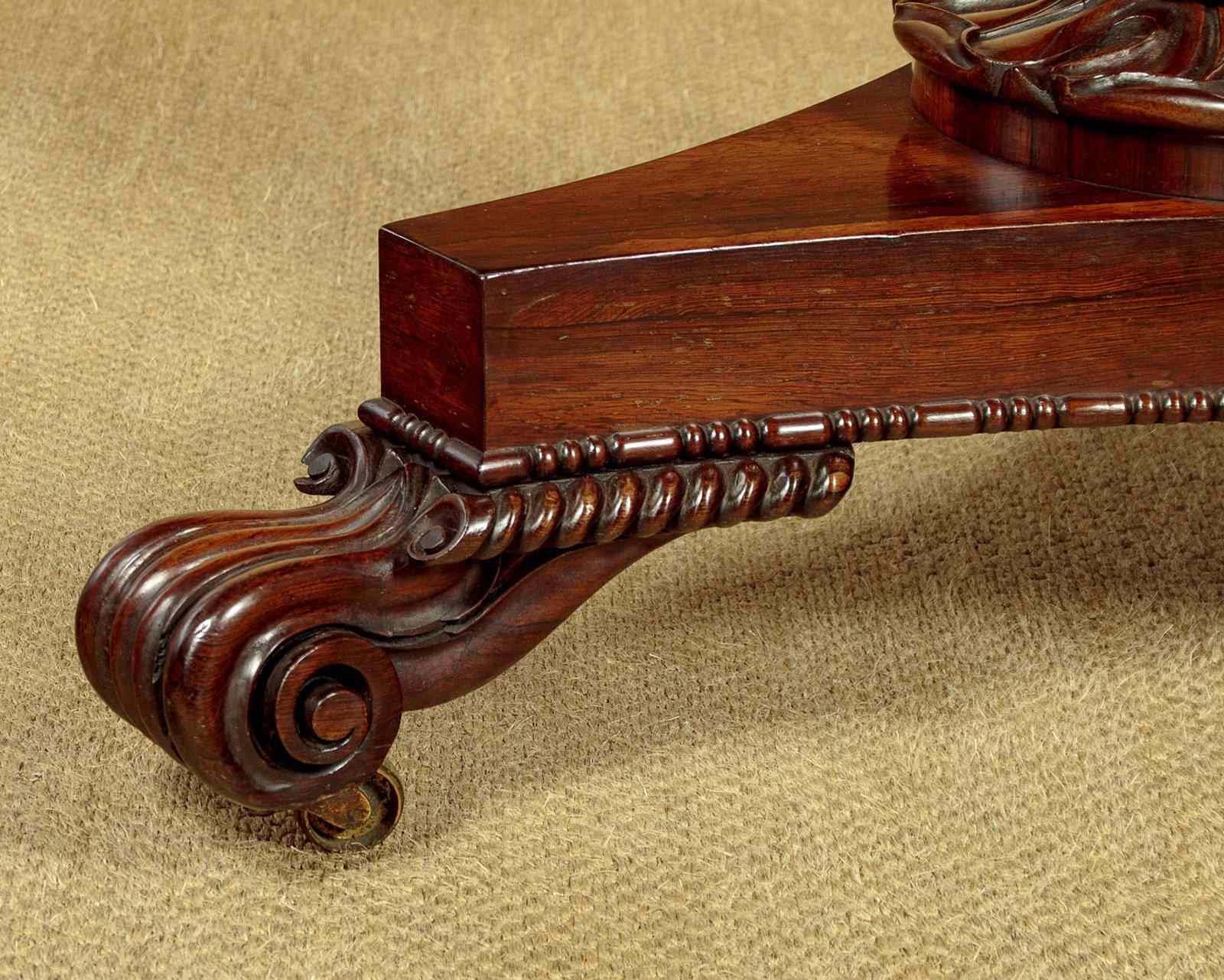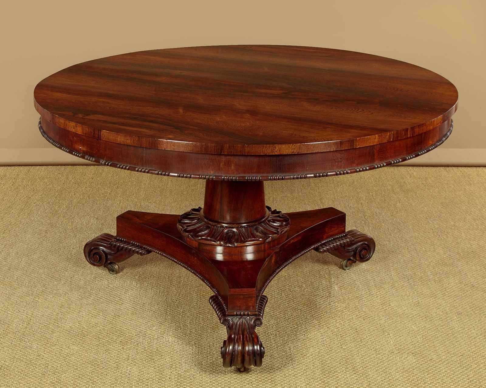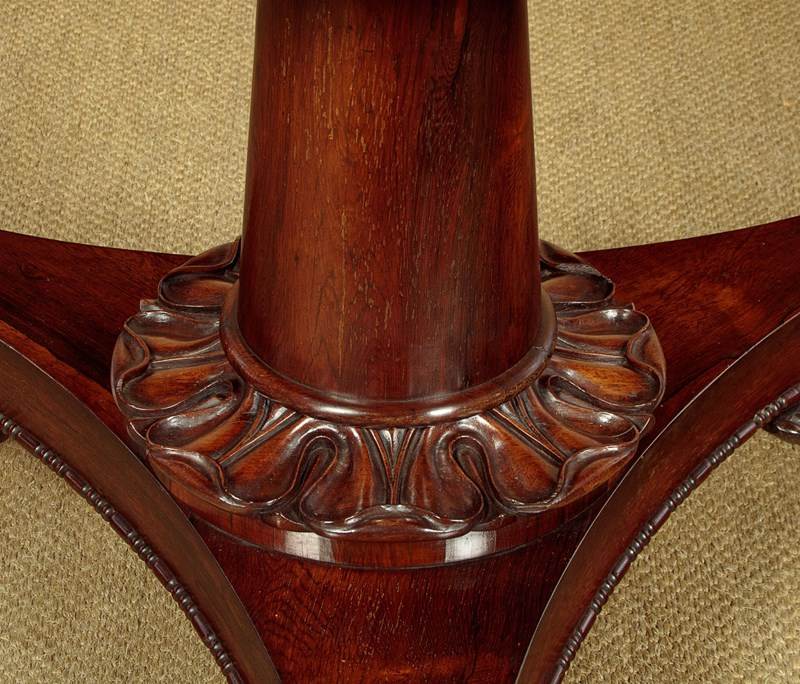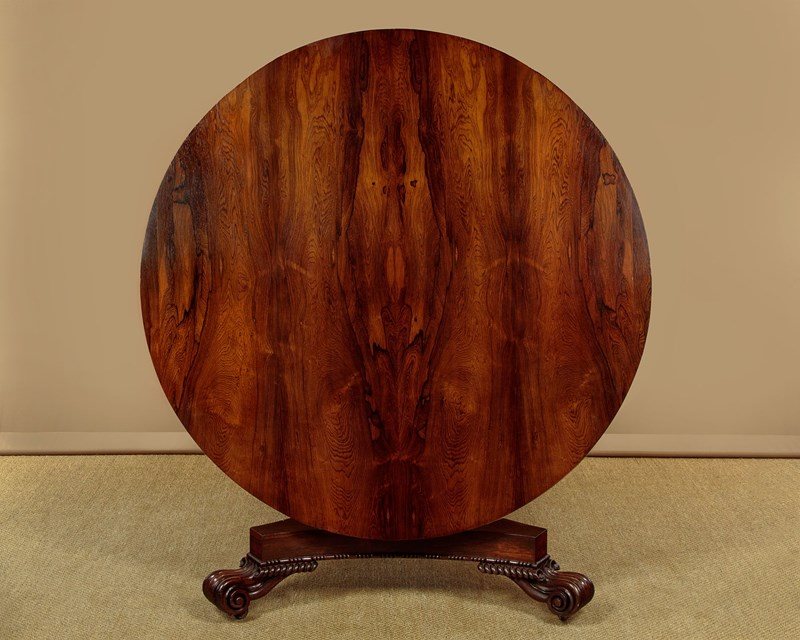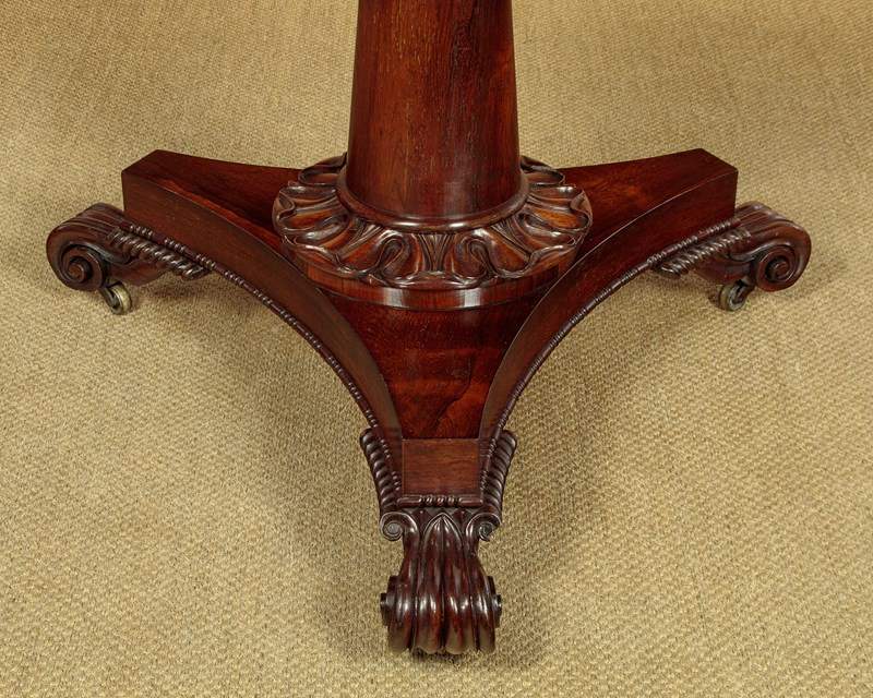 Superb William IV rosewood breakfast dining table c.1835. A comfortable six seater with a 52" diameter top veneered in beautifully figured rosewood laid in a symmetrical pattern on solid mahogany groundwork. Crossbanded edge and a crossbanded apron below with a carved moulding to the bottom edge. On a tapering column with a broad carved collar at the base, over a tricorn plinth veneered to match and with the same carved moulding as the apron. Raised on beautifully carved scrolling feet with the original brass castors below. Top can be tipped to vertical when not in use, locking into place with the original brass catch. Excellent colour and condition, repolished in our workshops. Dismantles for transport.