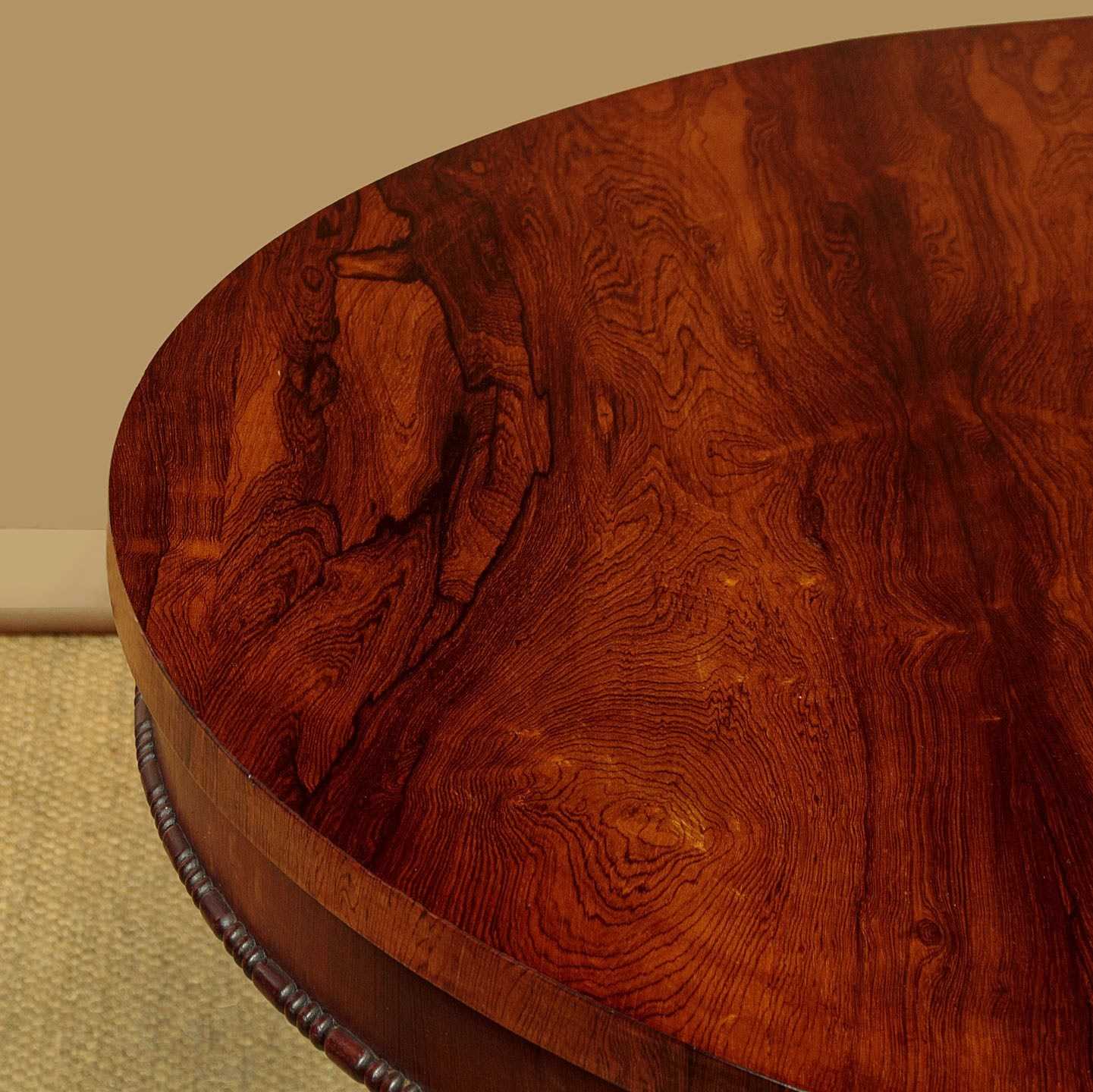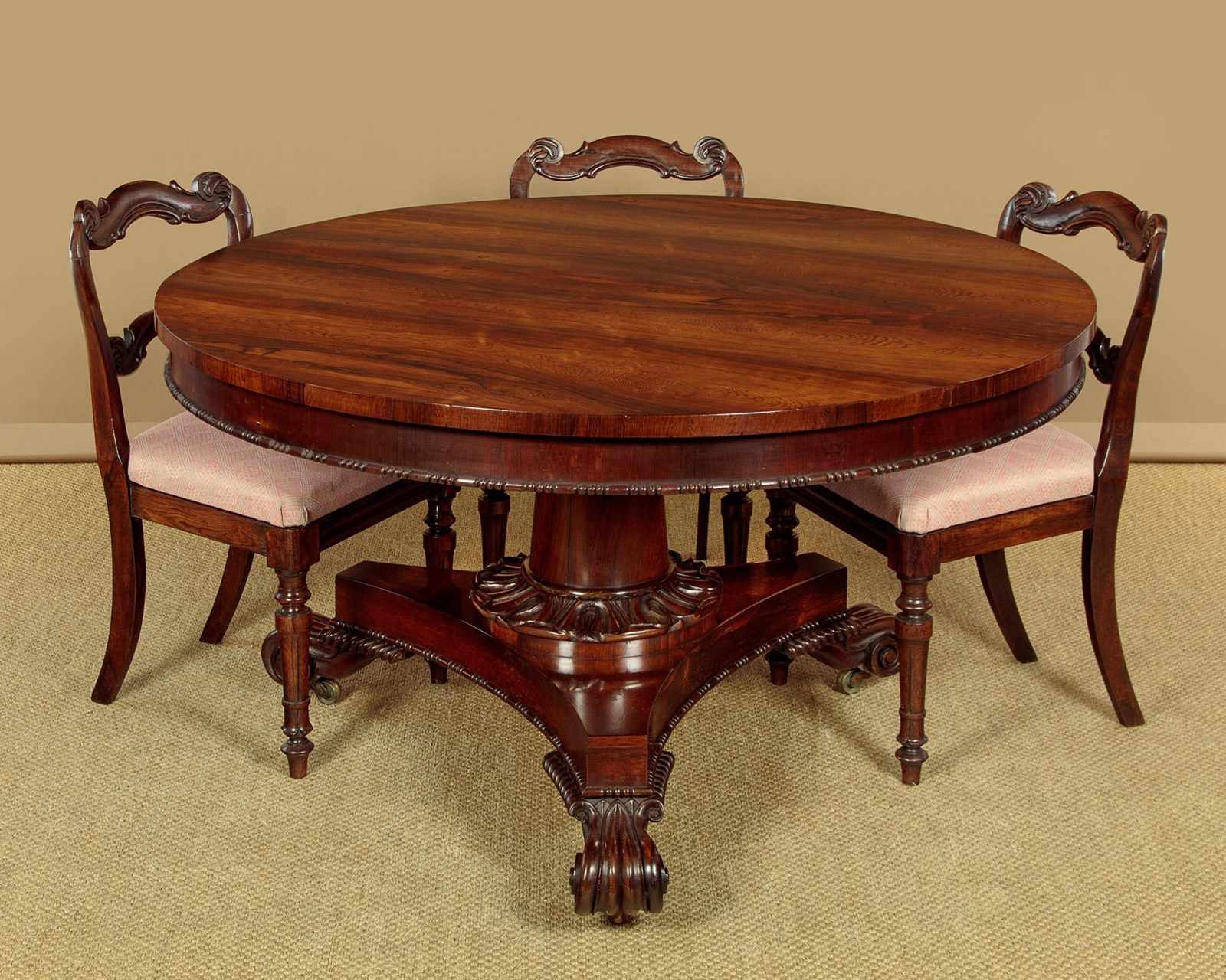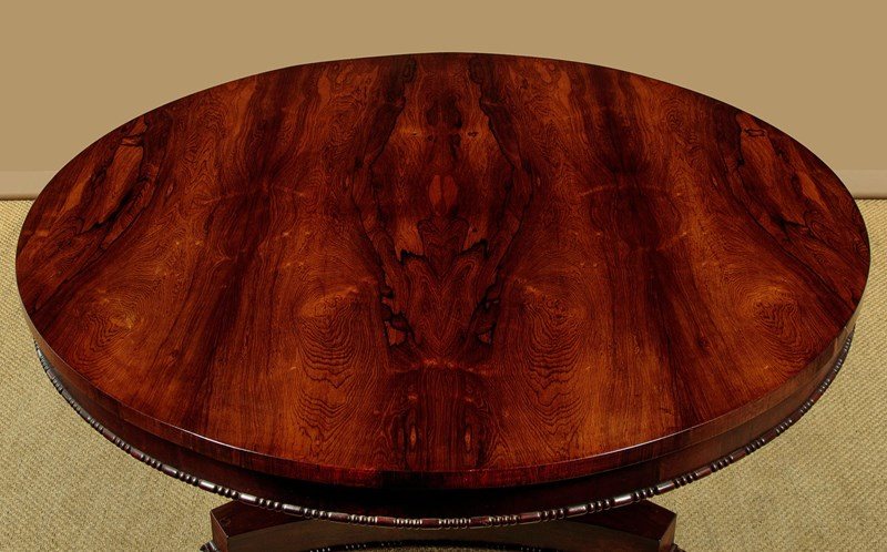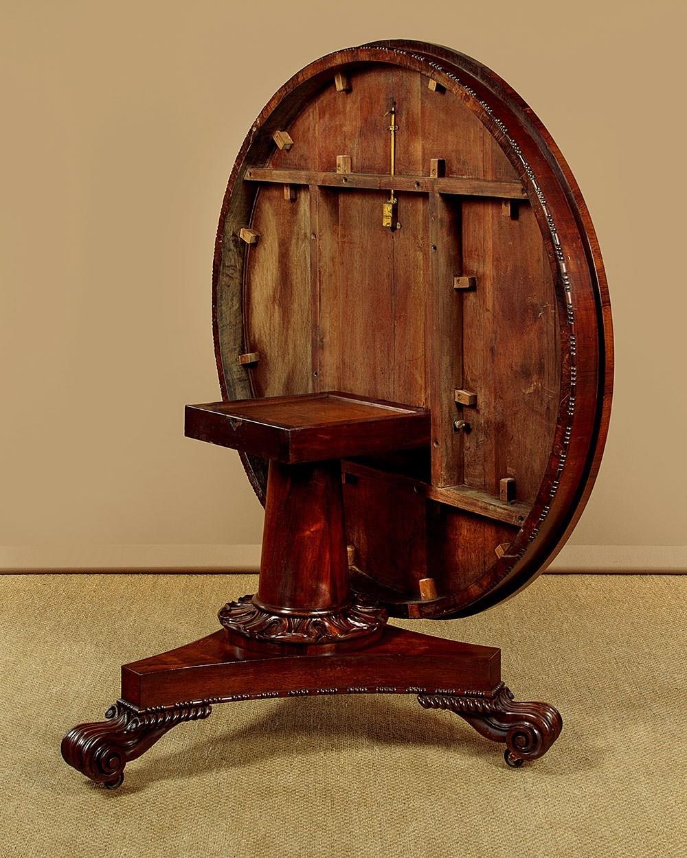 Superb William IV rosewood breakfast dining table c.1835. A comfortable six seater with a 52" diameter top veneered in beautifully figured rosewood laid in a symmetrical pattern on solid mahogany groundwork. Crossbanded edge and a crossbanded apron below with a carved moulding to the bottom edge. On a tapering column with a broad carved collar at the base, over a tricorn plinth veneered to match and with the same carved moulding as the apron. Raised on beautifully carved scrolling feet with the original brass castors below. Top can be tipped to vertical when not in use, locking into place with the original brass catch. Excellent colour and condition, repolished in our workshops. Dismantles for transport.