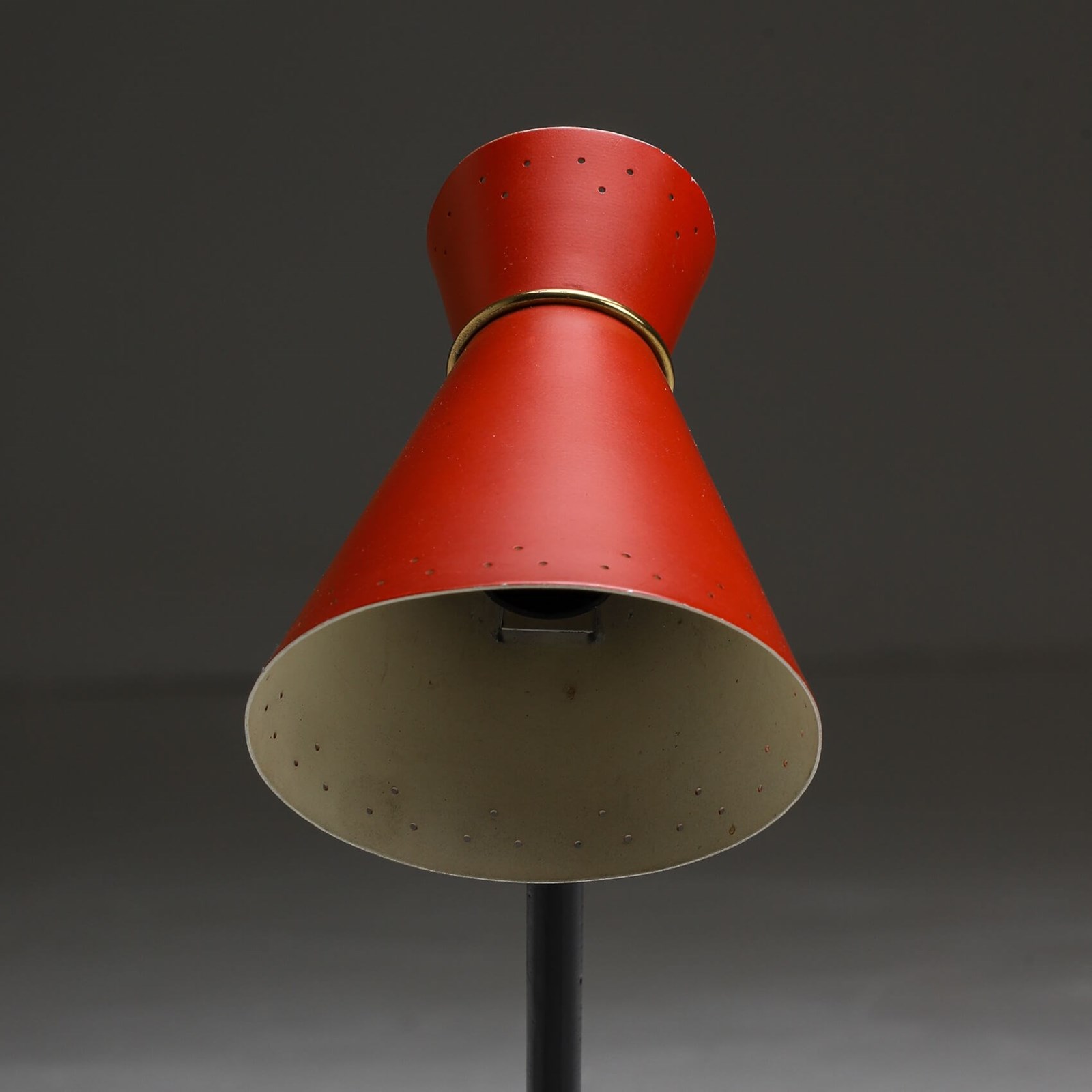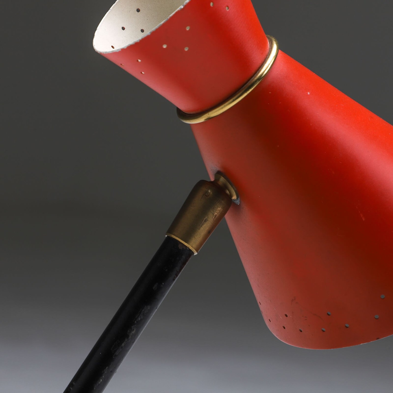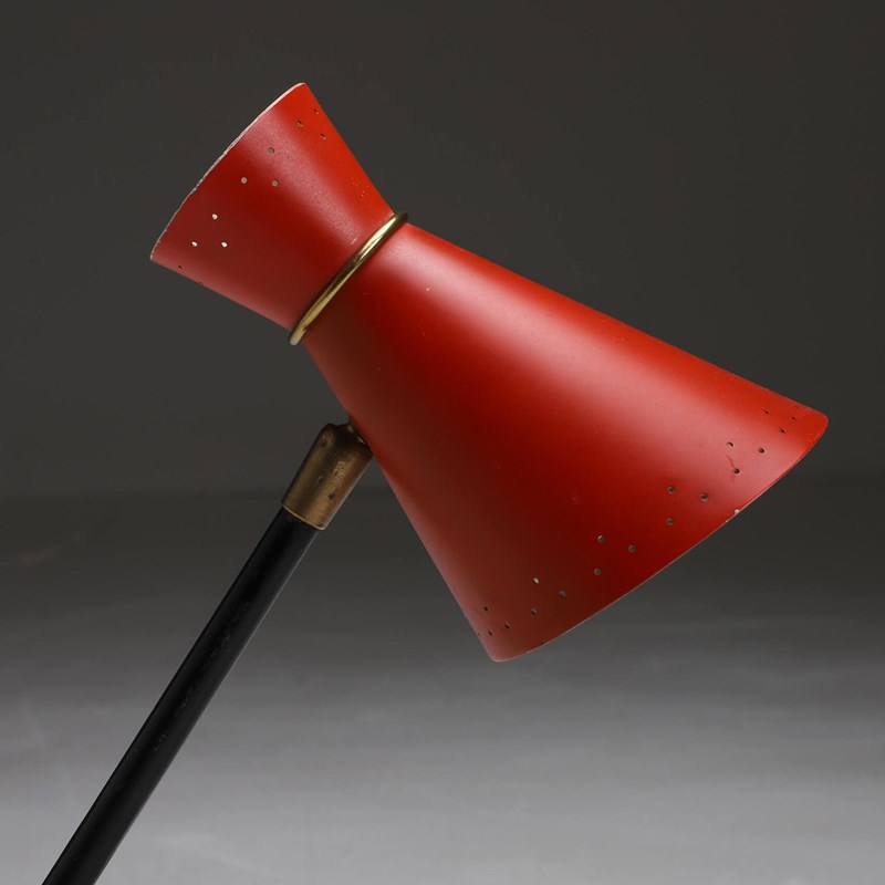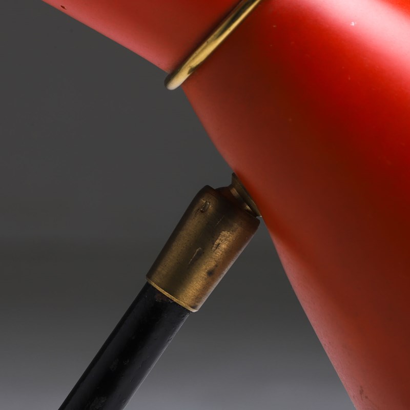 Bright red lacquered spun aluminium shade, brass articulated joint & slender black frame.