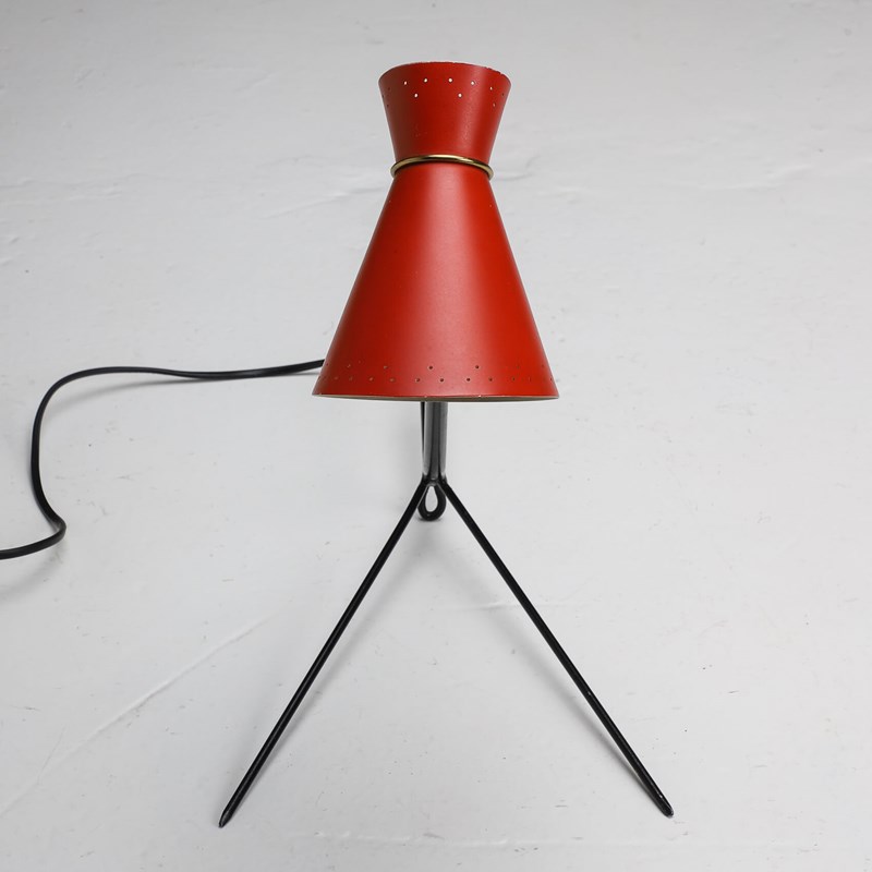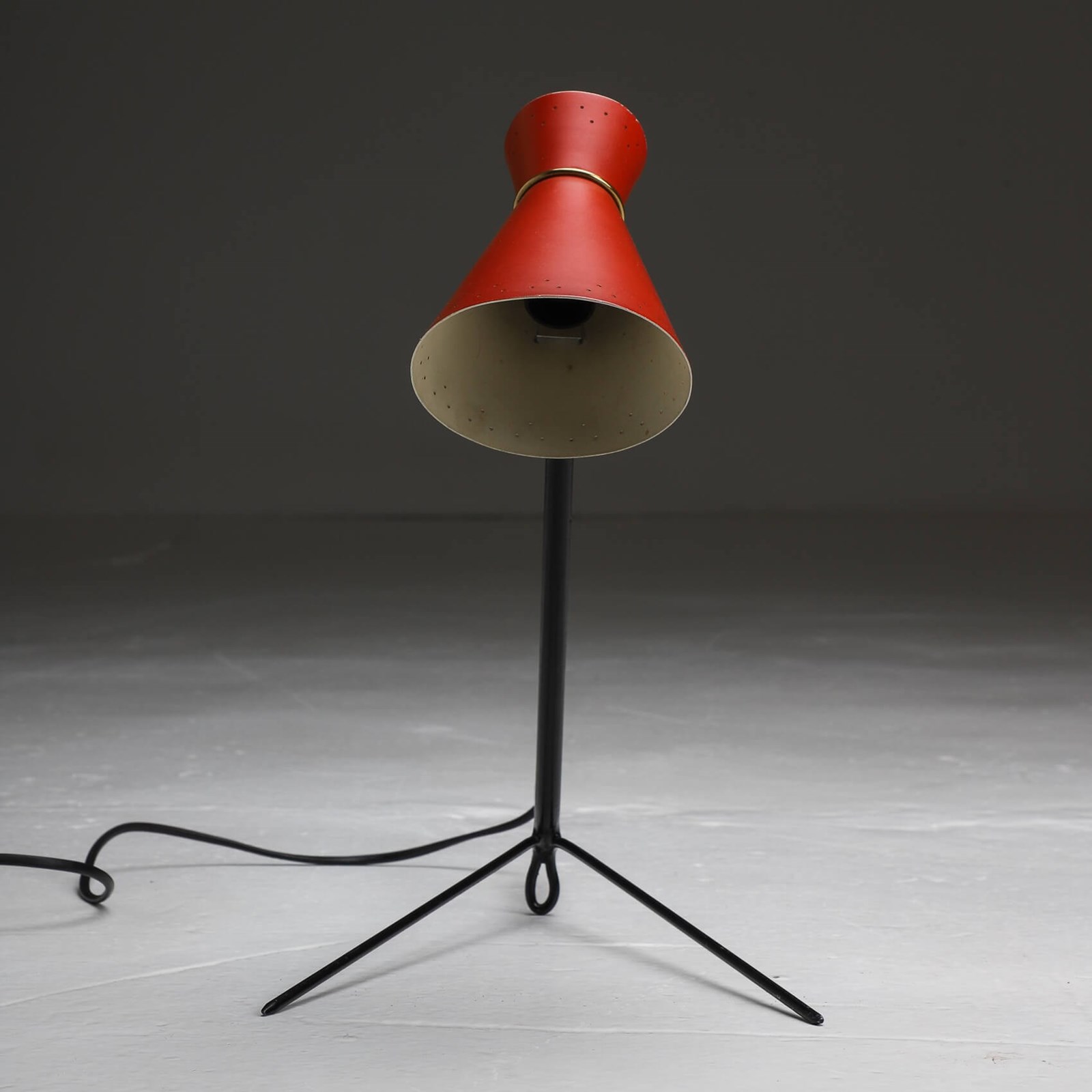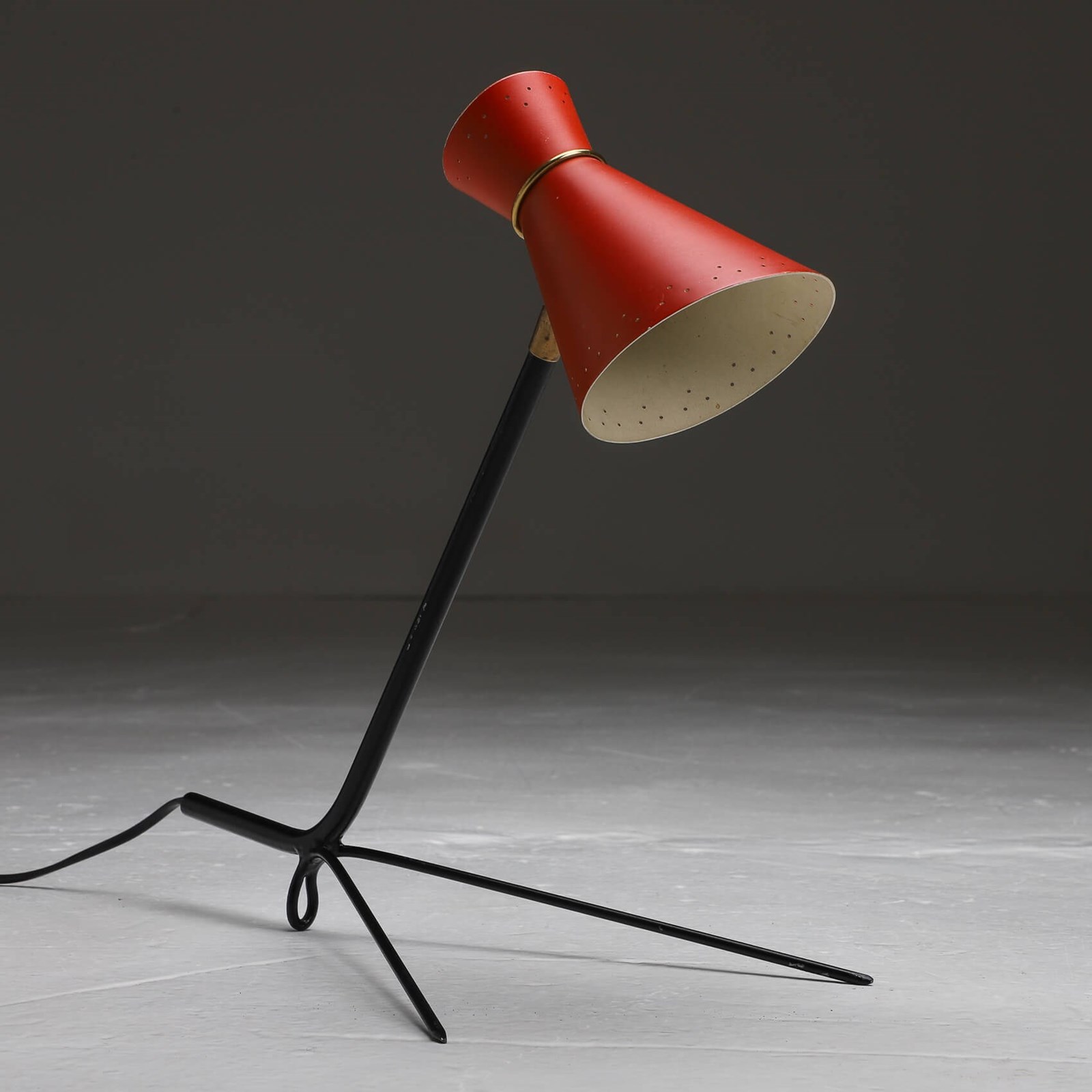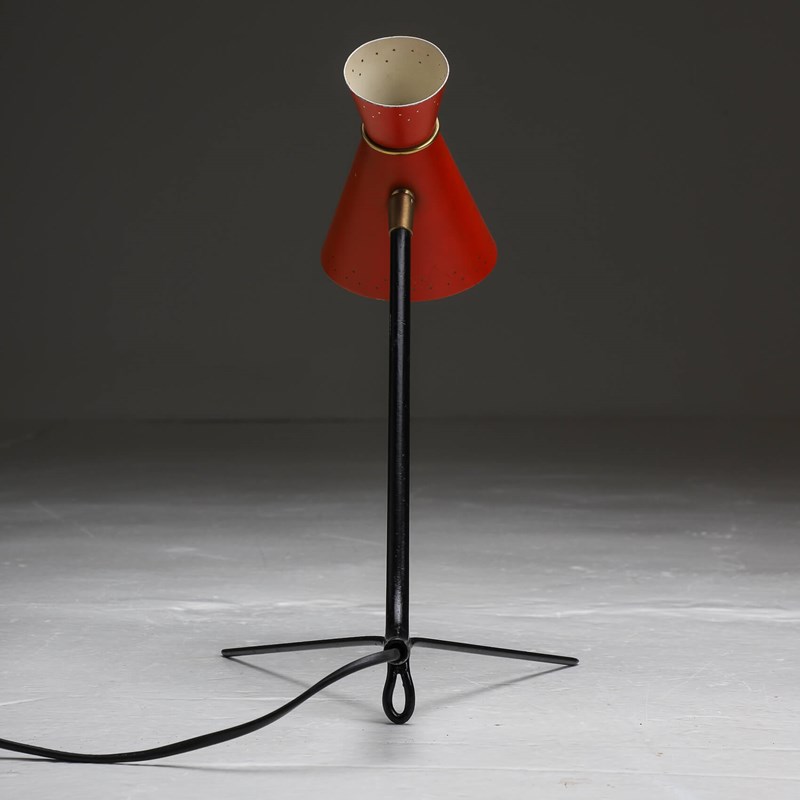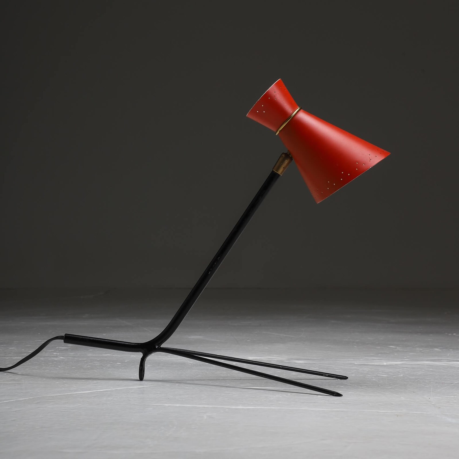 Bright red lacquered spun aluminium shade, brass articulated joint & slender black frame.