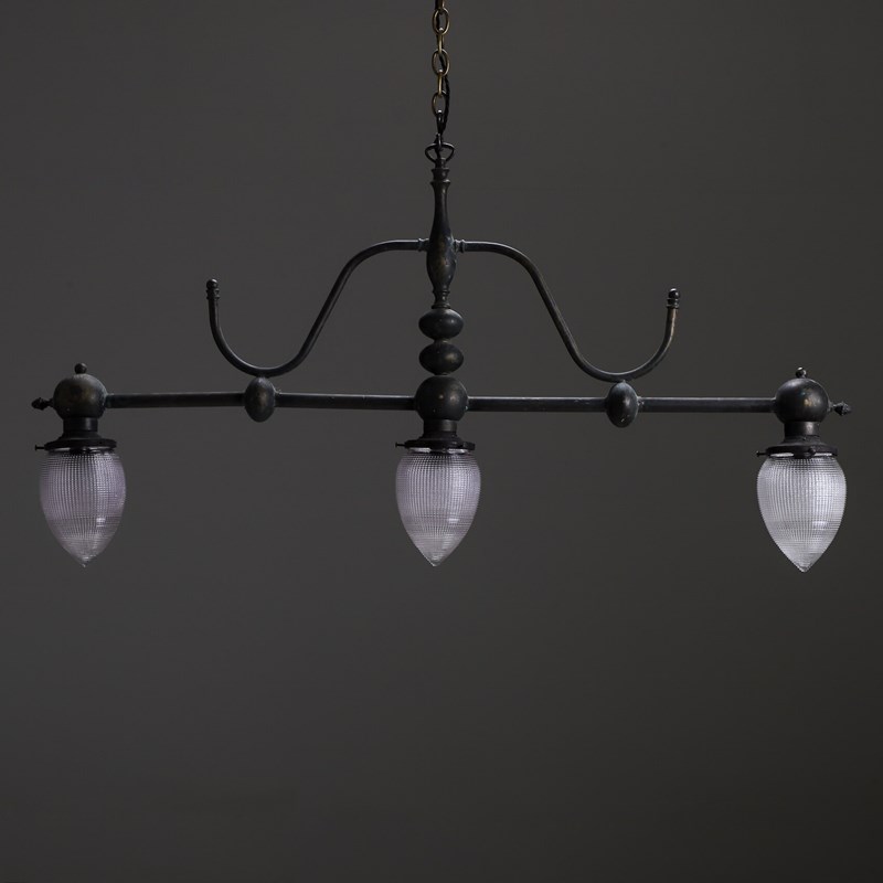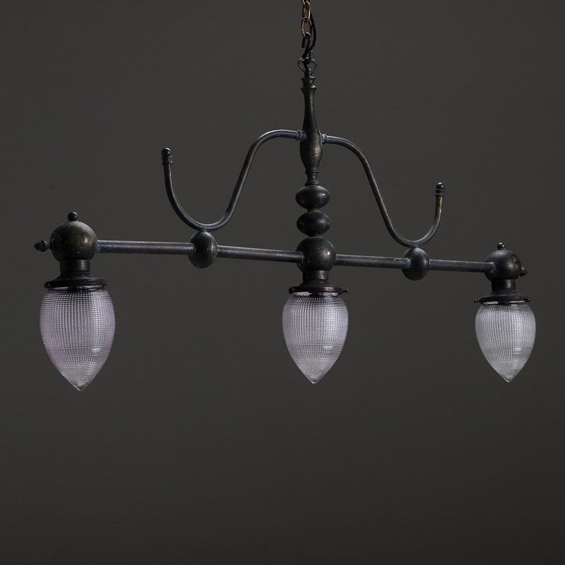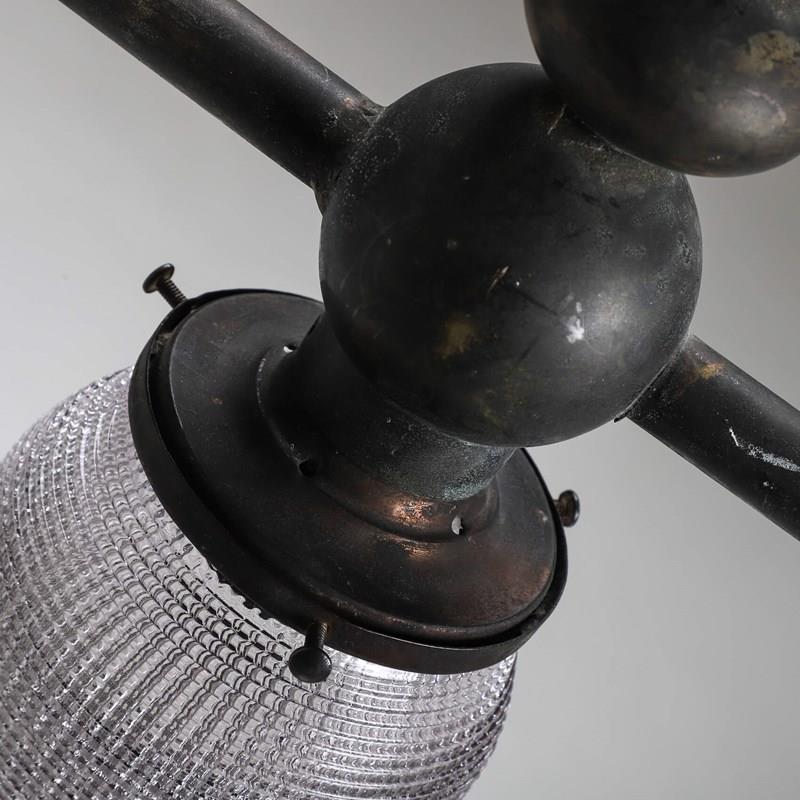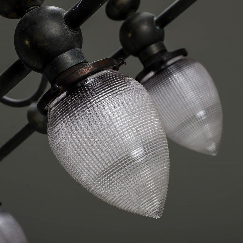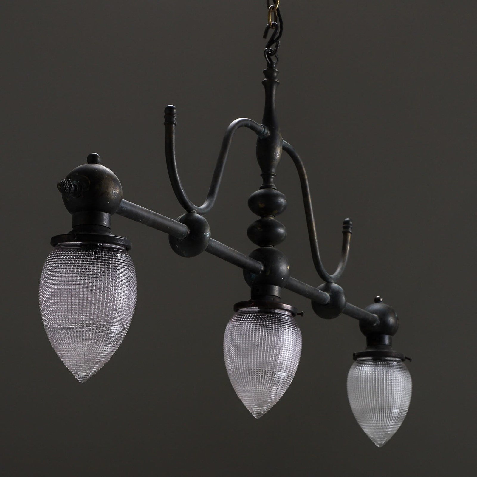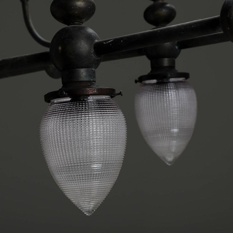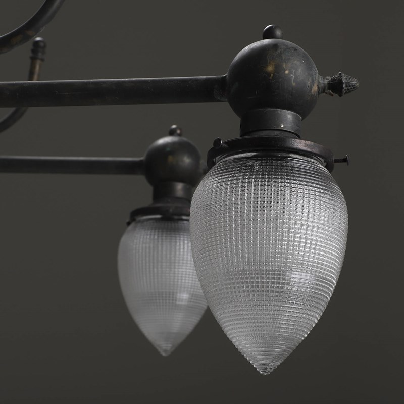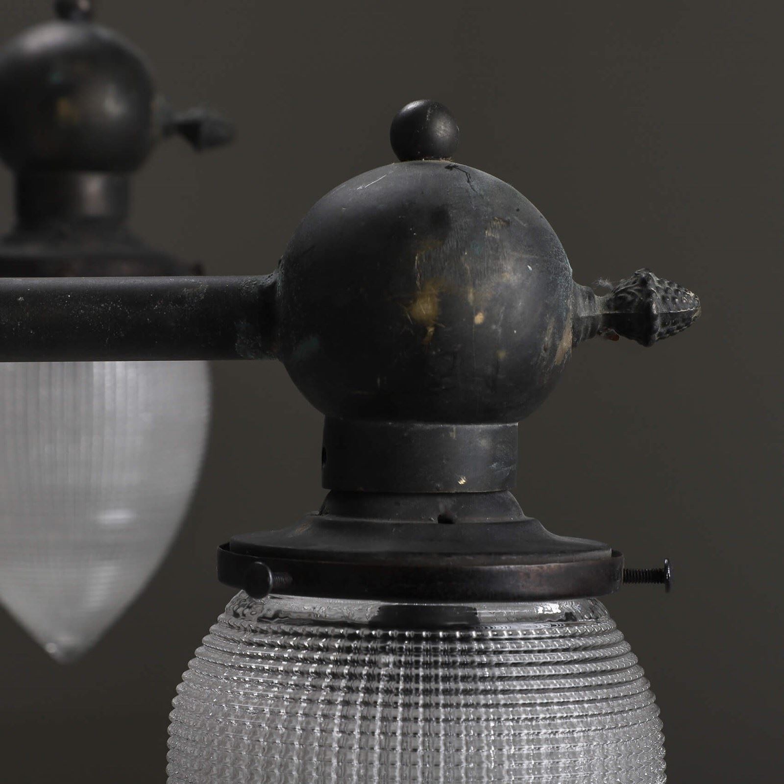 A rare and highly sought-after pair of original Holophane electroliers, each presented in untouched condition with a beautifully aged, time-worn patina. Each fitting features three rare acorn-shaped Holophane prismatic glass shades.