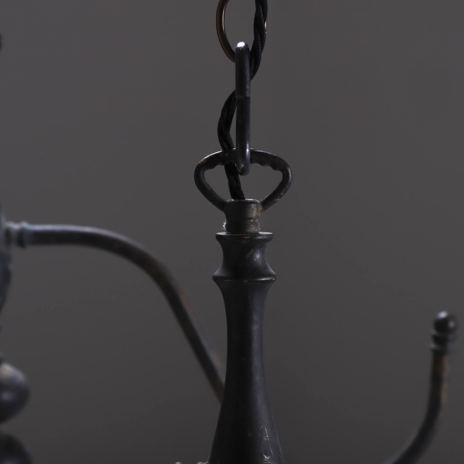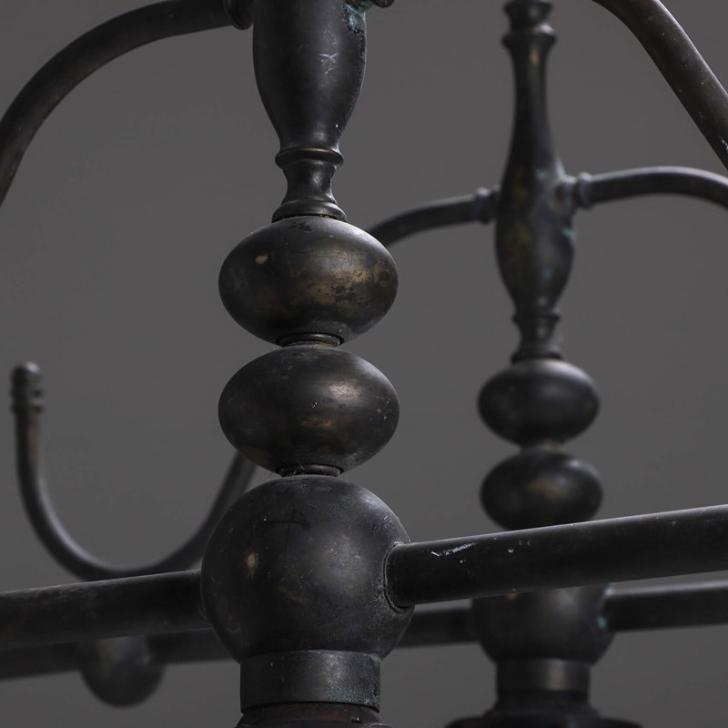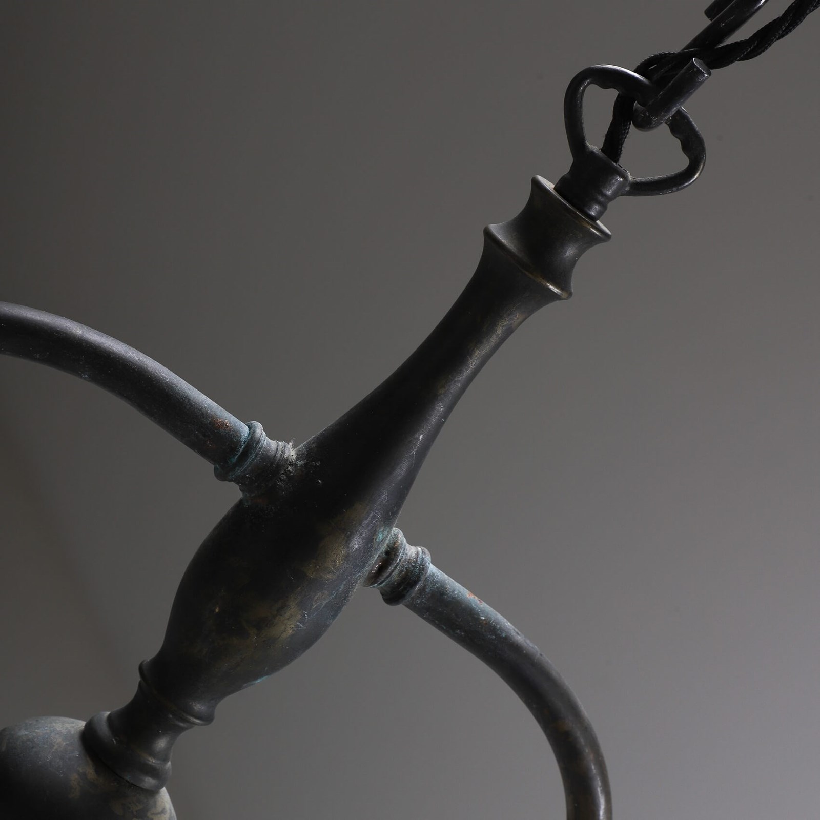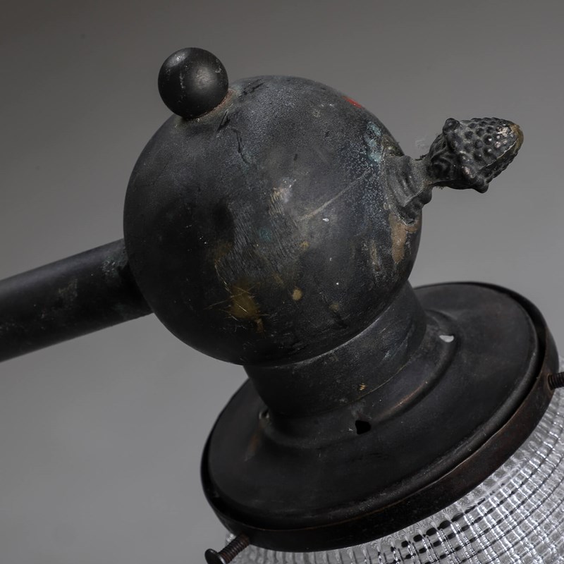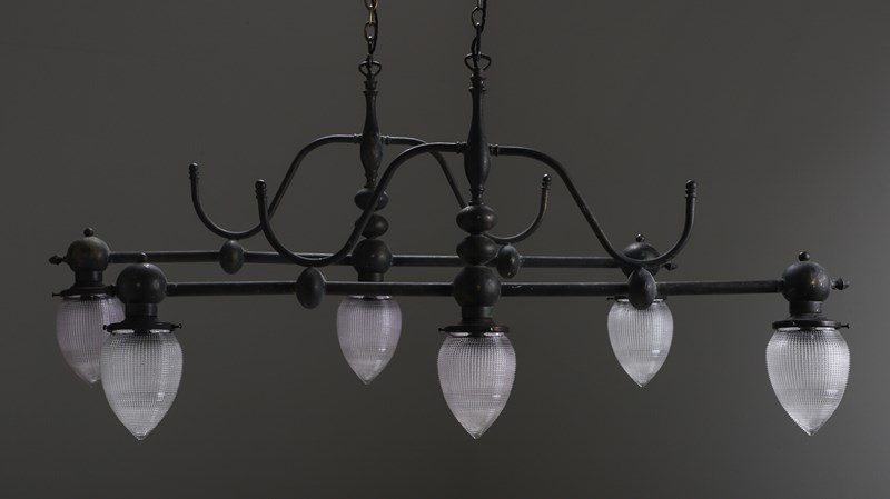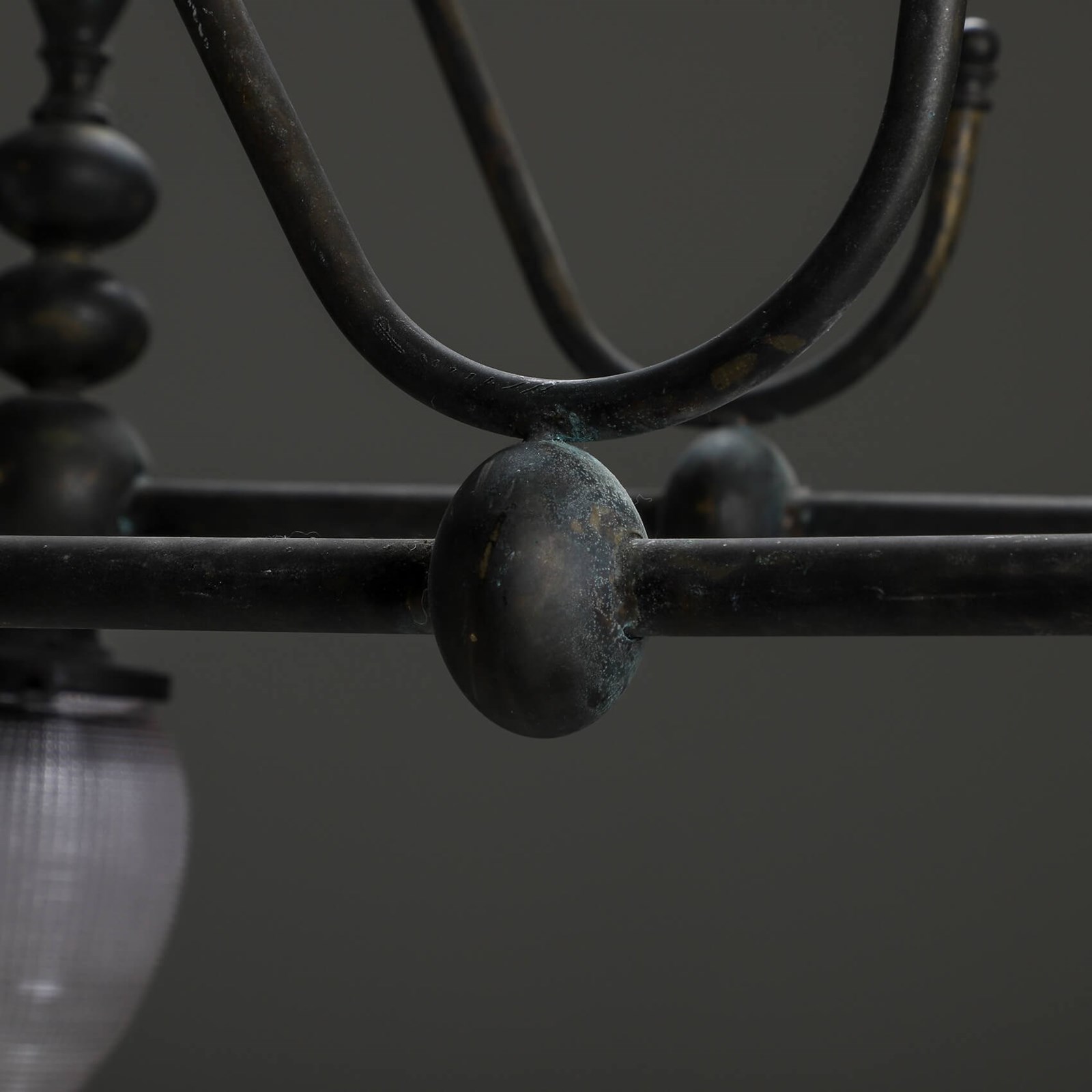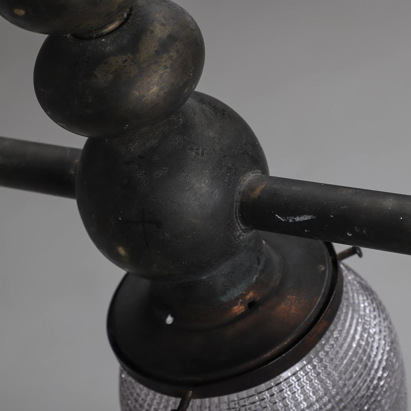 A rare and highly sought-after pair of original Holophane electroliers, each presented in untouched condition with a beautifully aged, time-worn patina. Each fitting features three rare acorn-shaped Holophane prismatic glass shades.