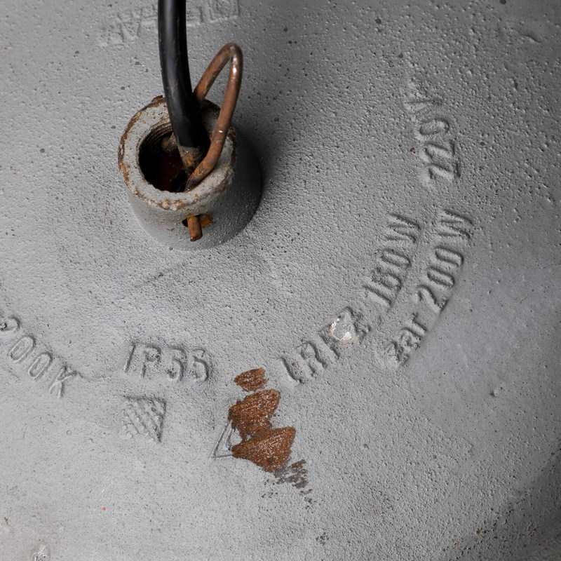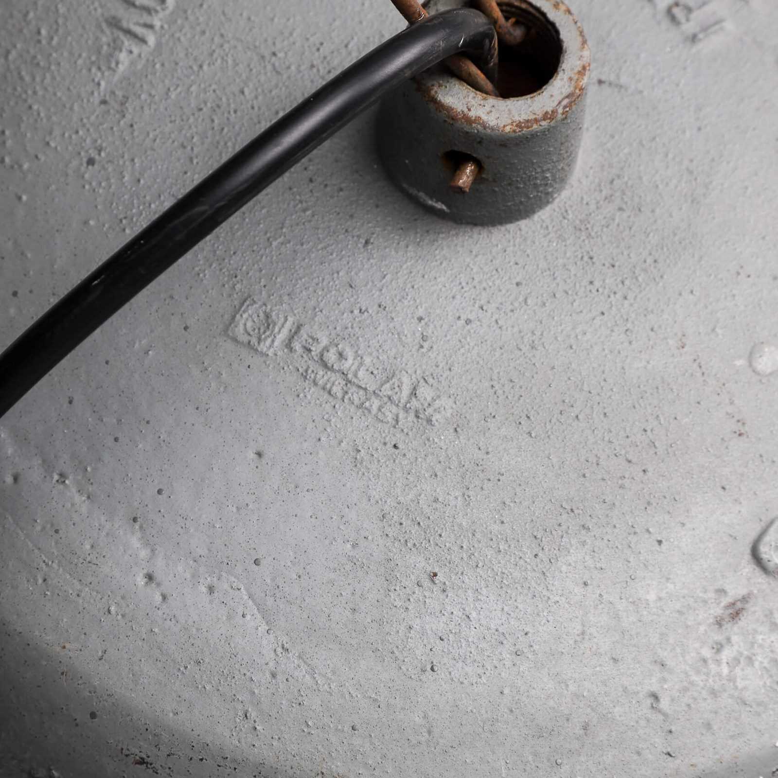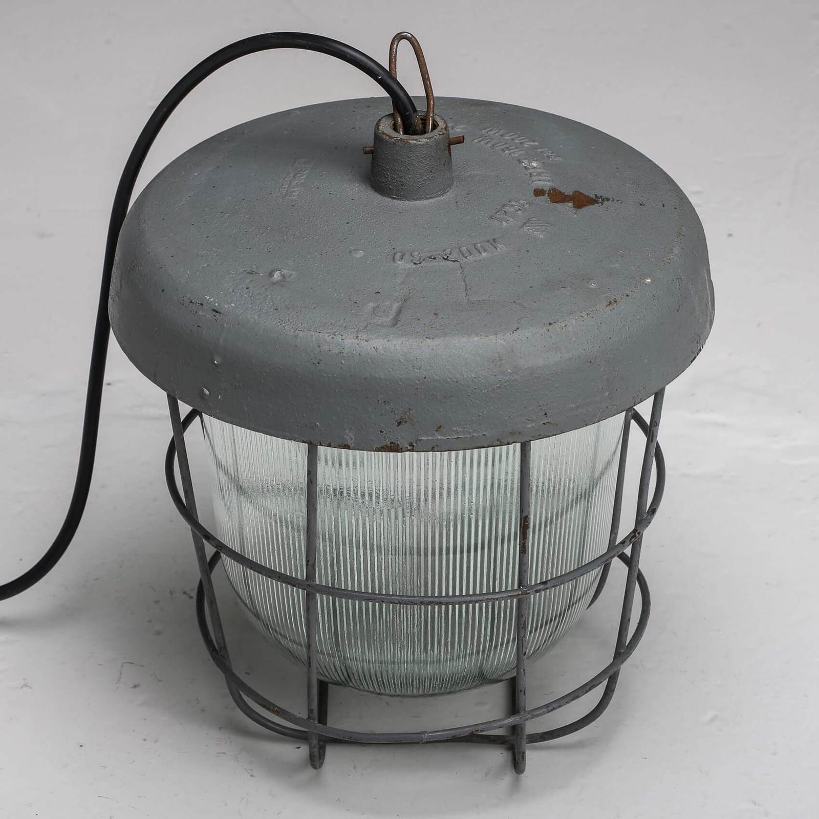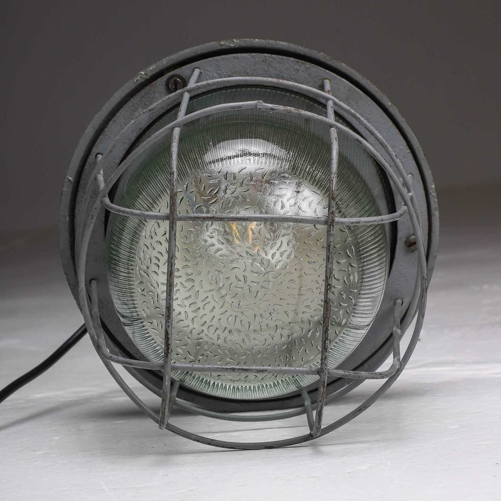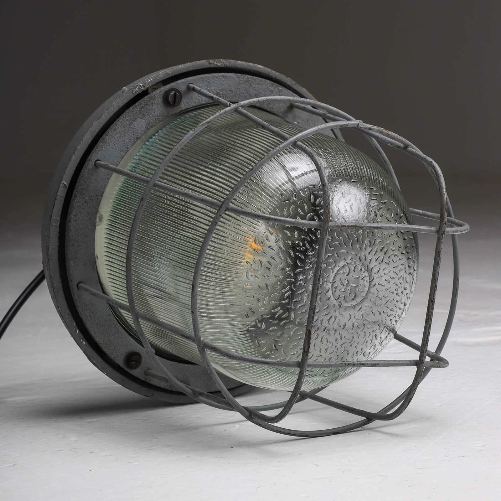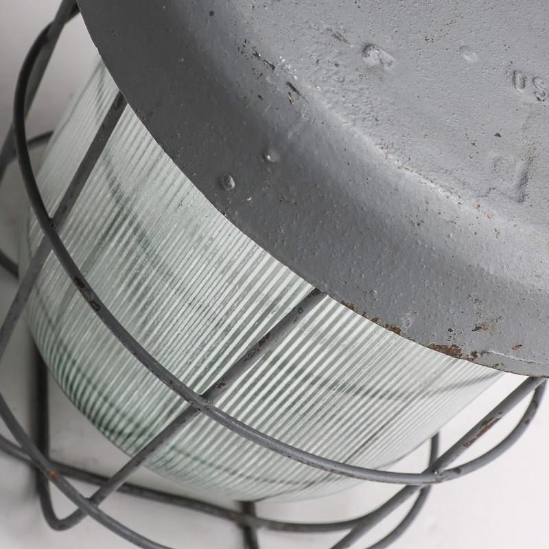 Beautiful contrast again the heavy cast meatal top in original paint paired with the elegant prismatic shade & chunky protective cage.