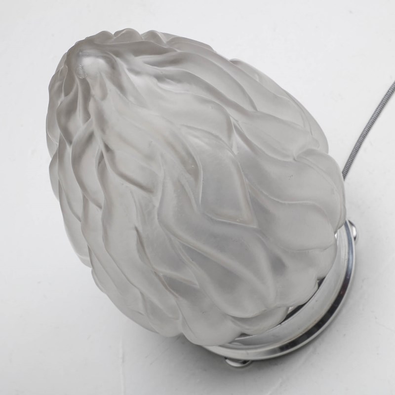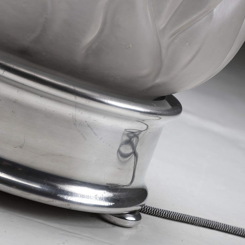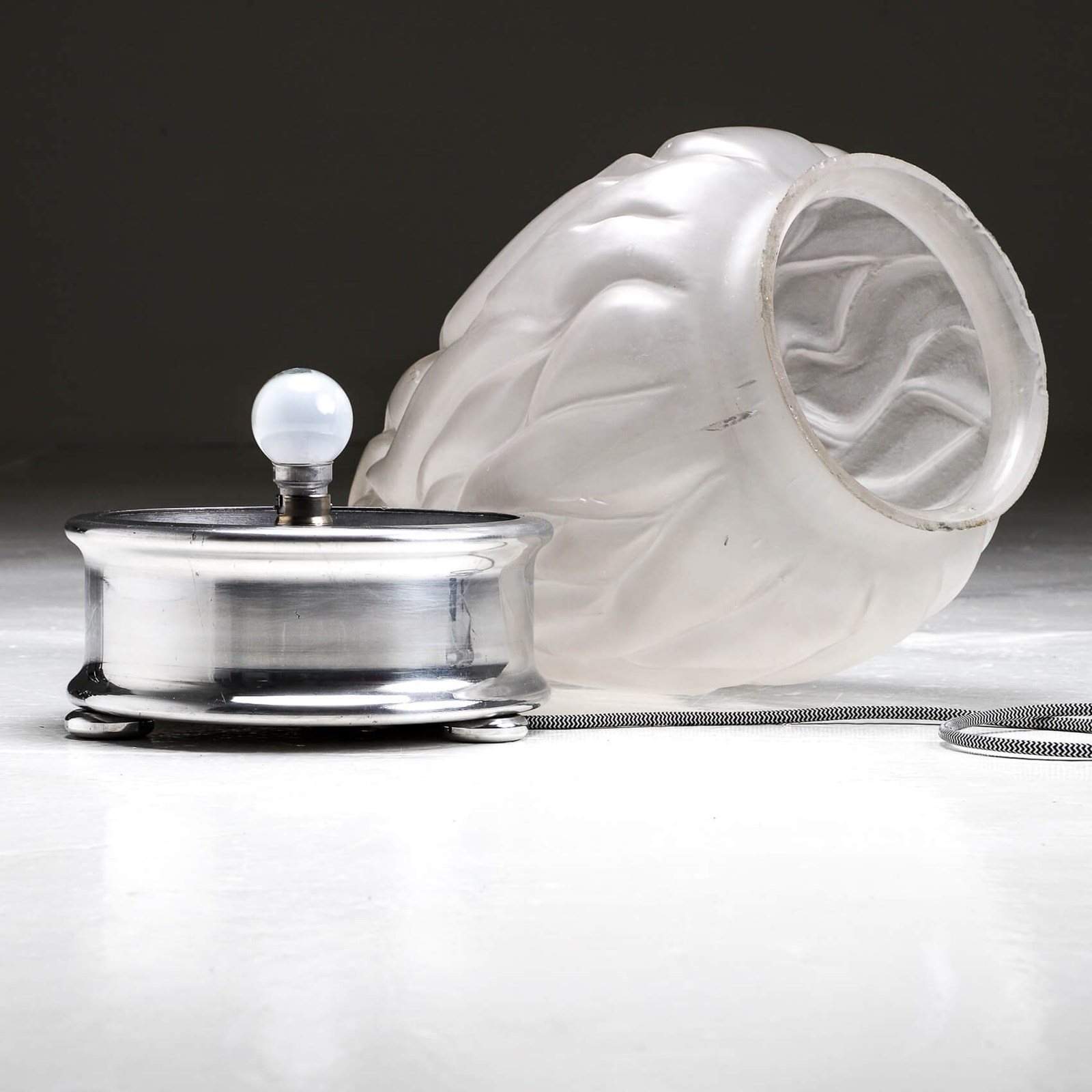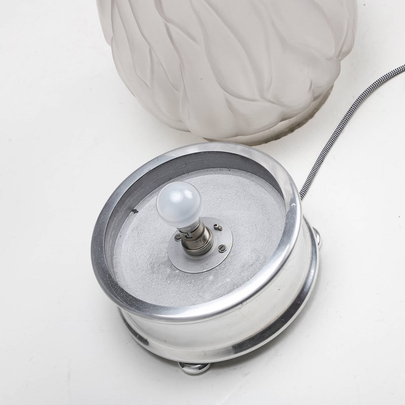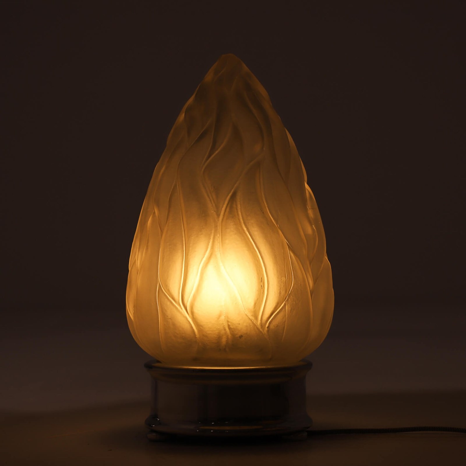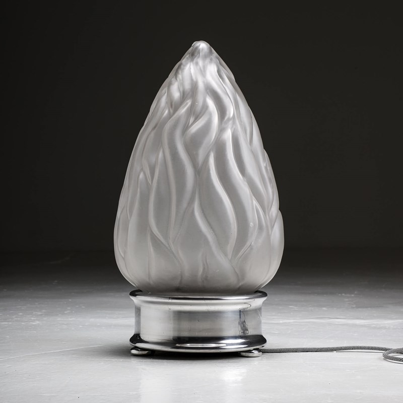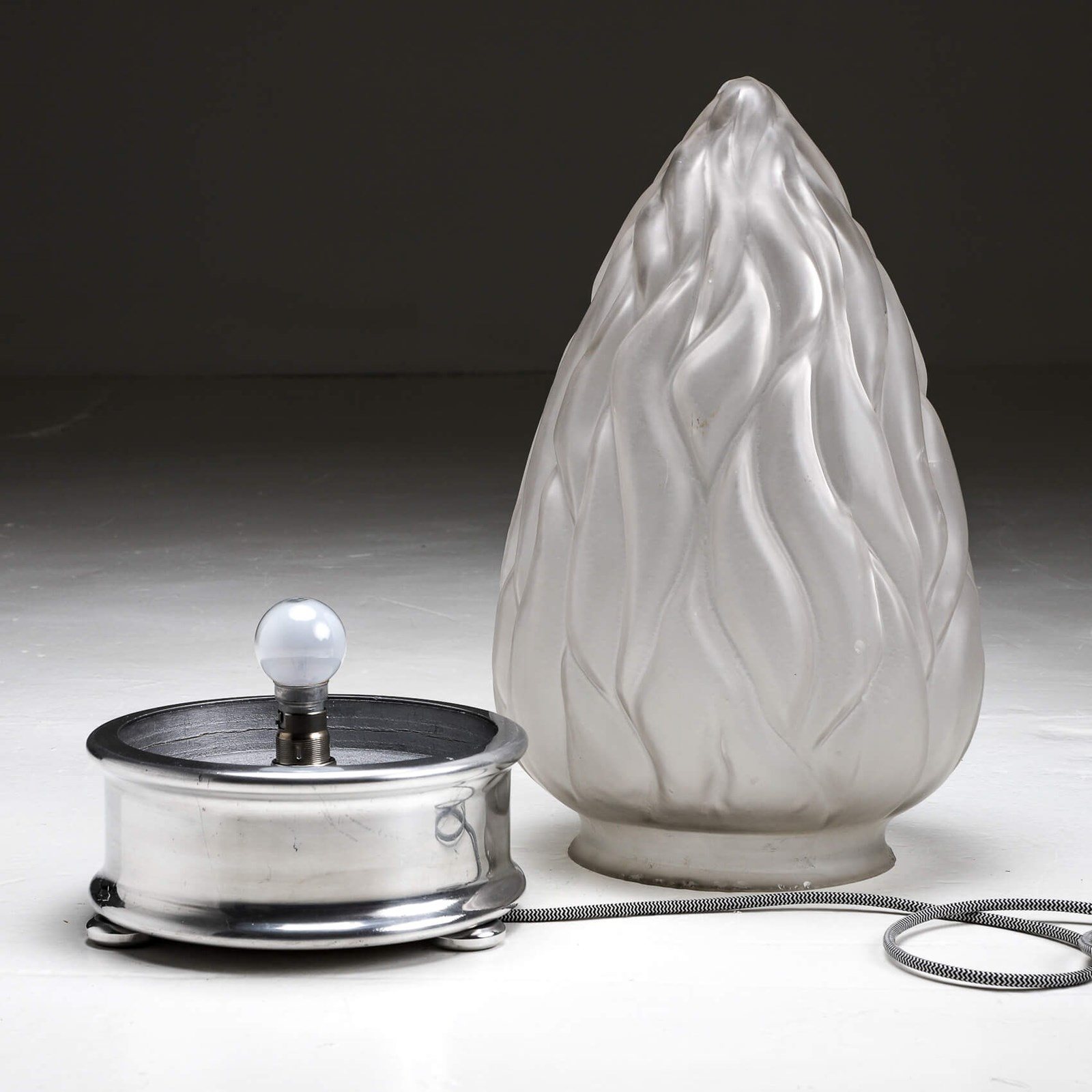 Xl frosted glass flame shade housed in chunky nickel plated round base.