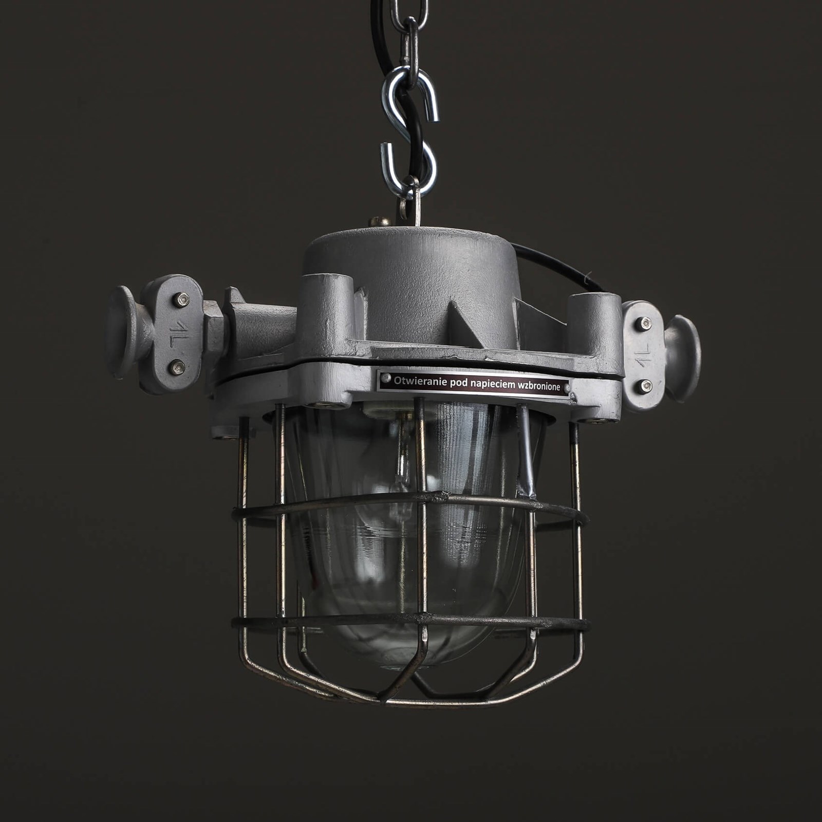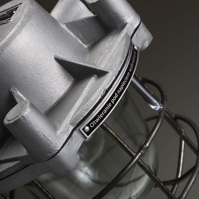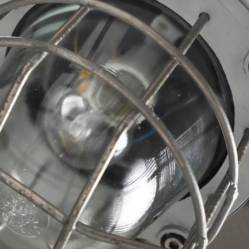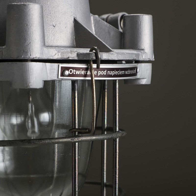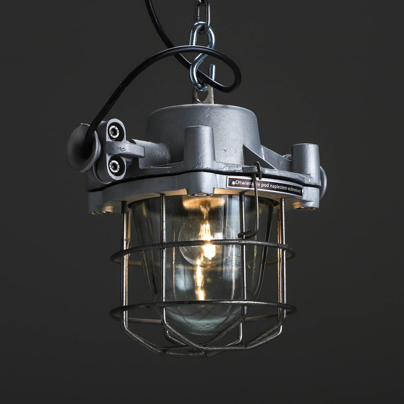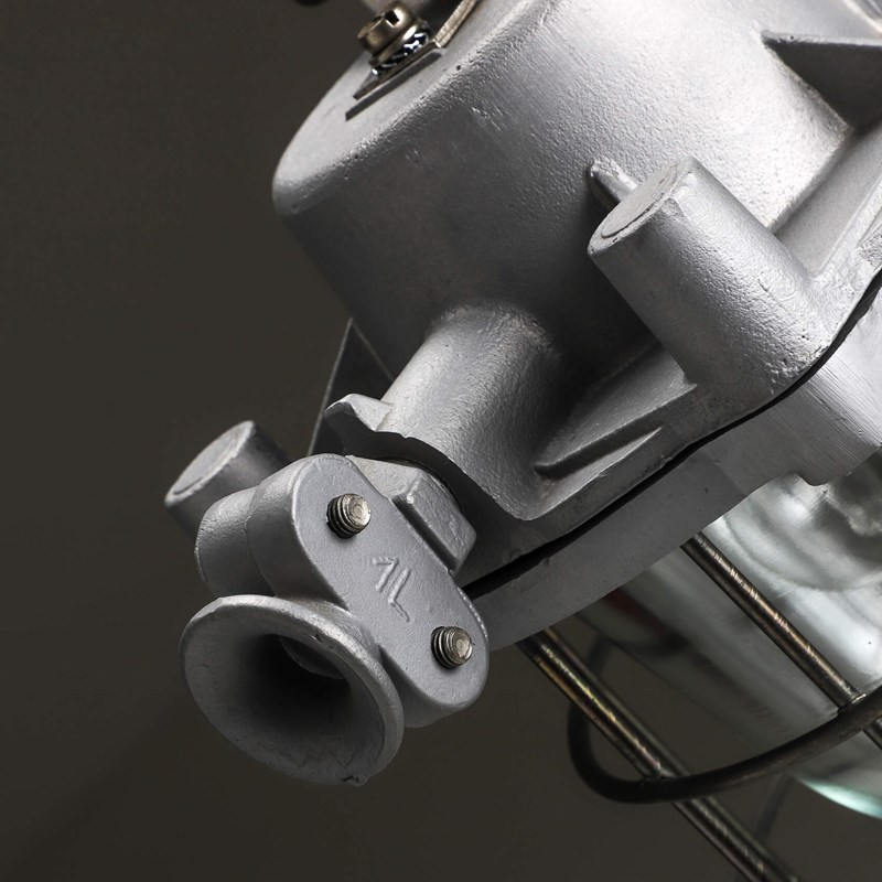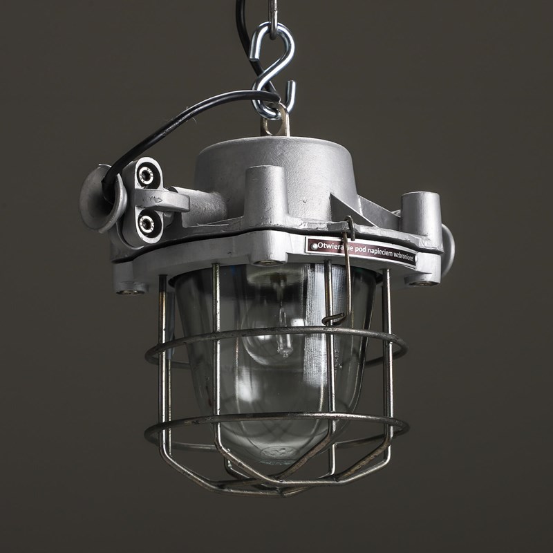 Explosion-proof pendant lights with cast metal top, thick domed glass lens all enclosed by a protective cage.