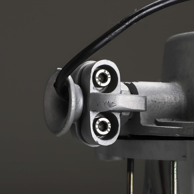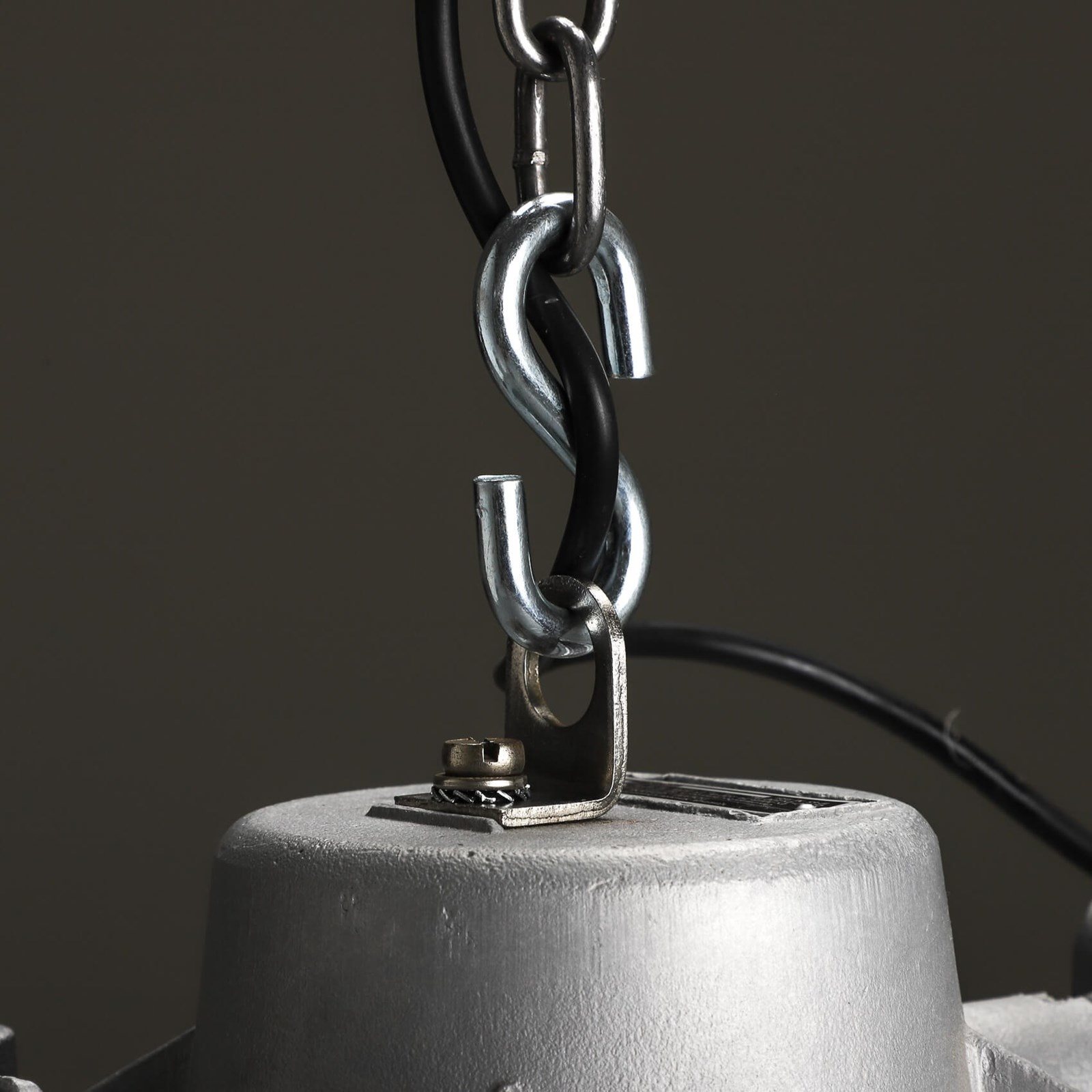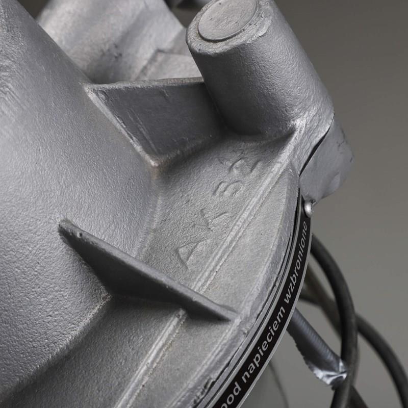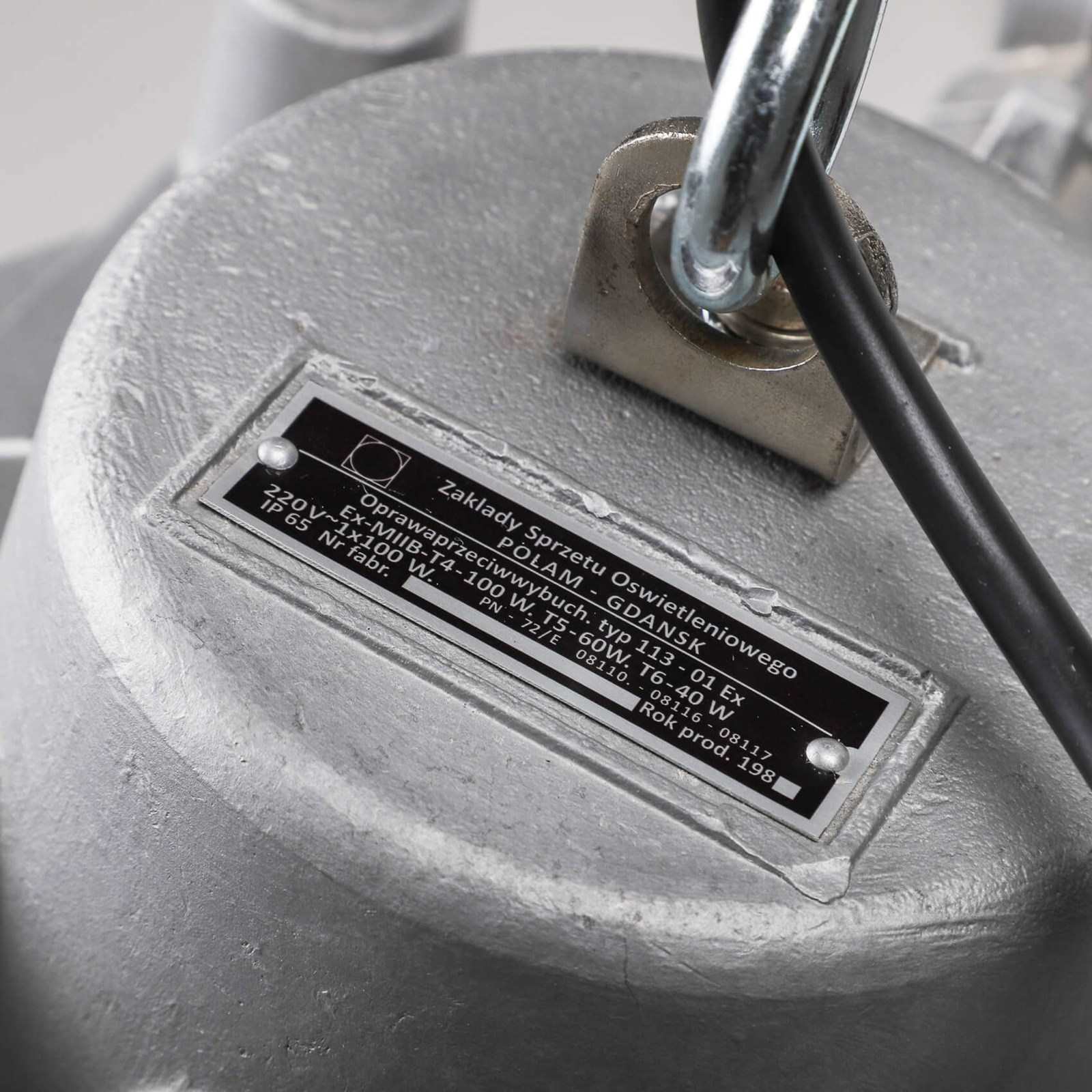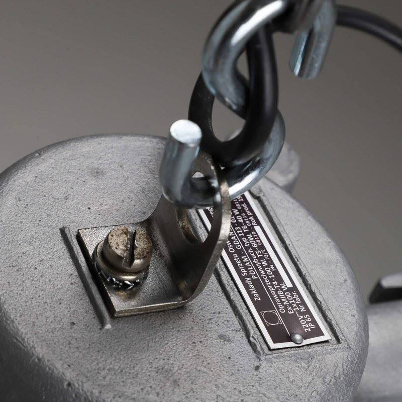 Explosion-proof pendant lights with cast metal top, thick domed glass lens all enclosed by a protective cage.