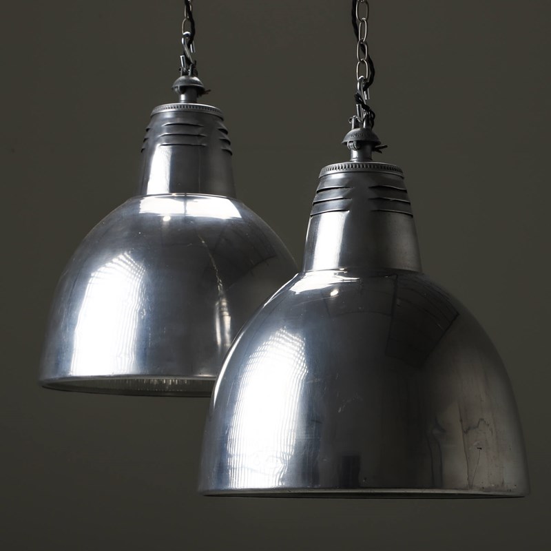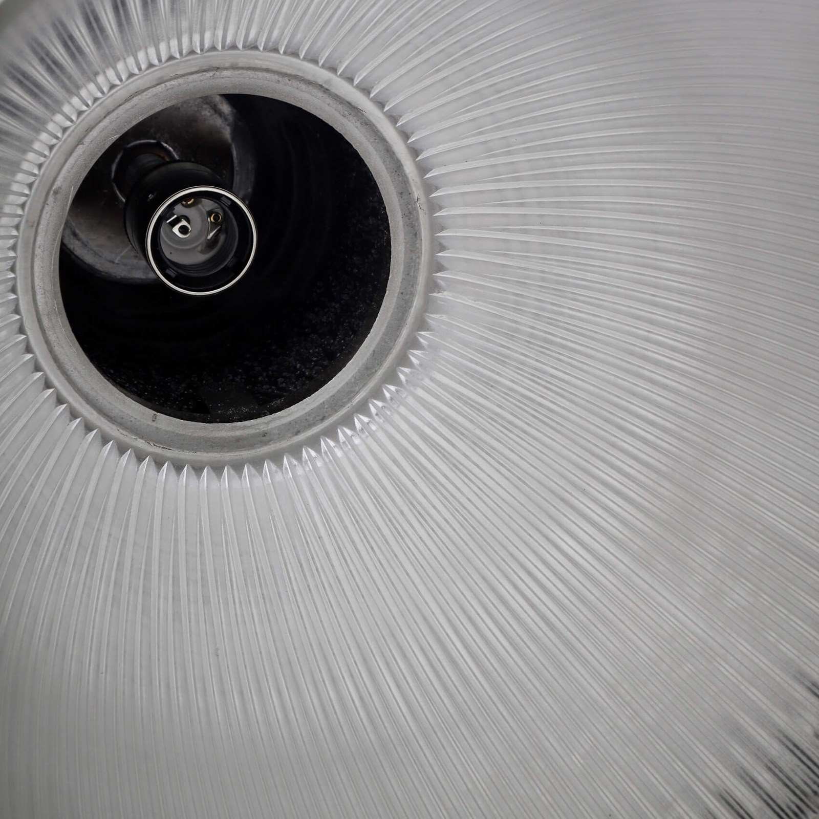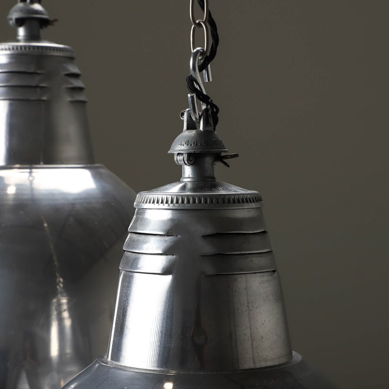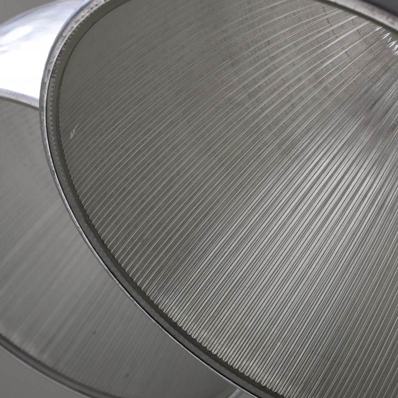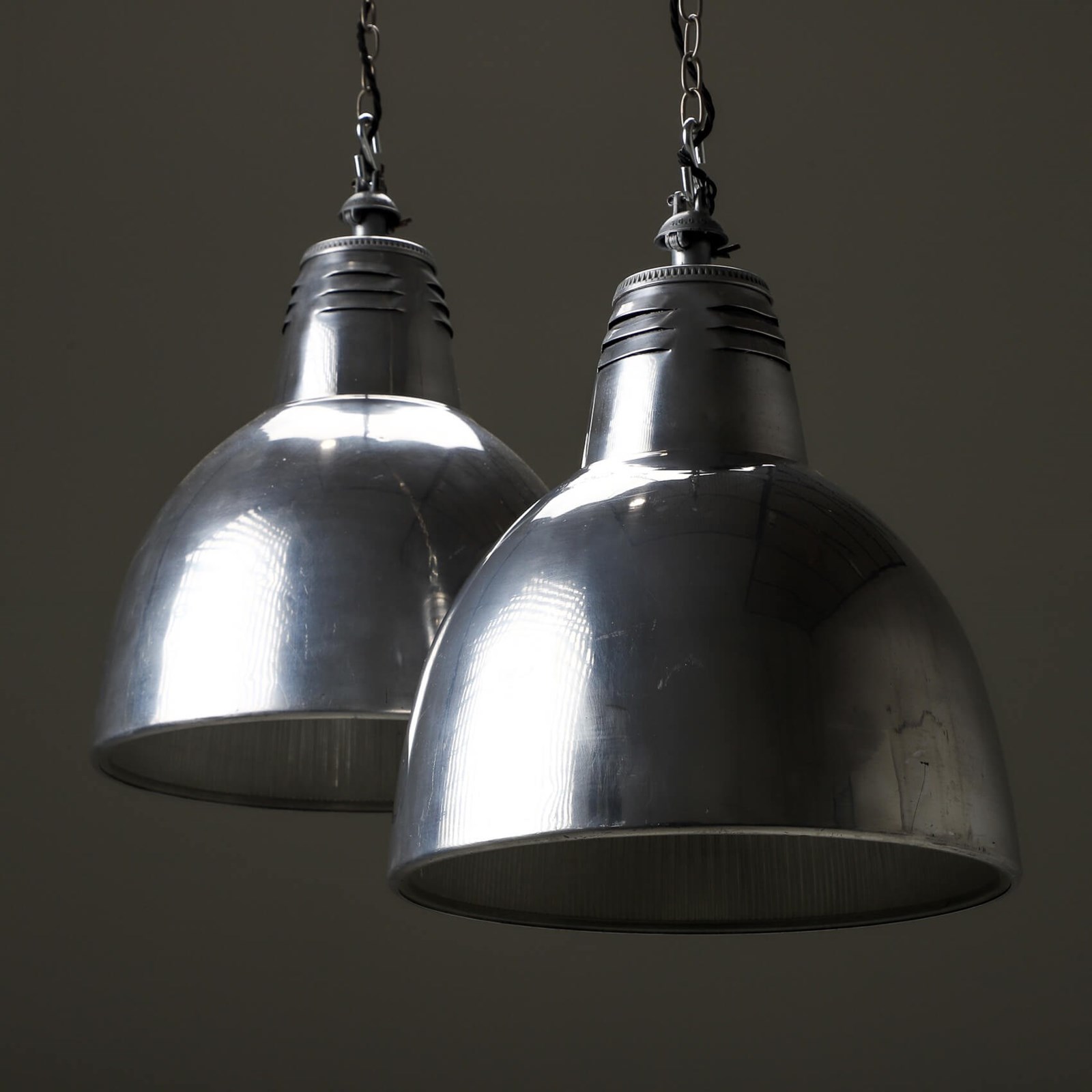 Large polished spun alloy exterior with cast metal gallery & elegant prismatic glass shade.