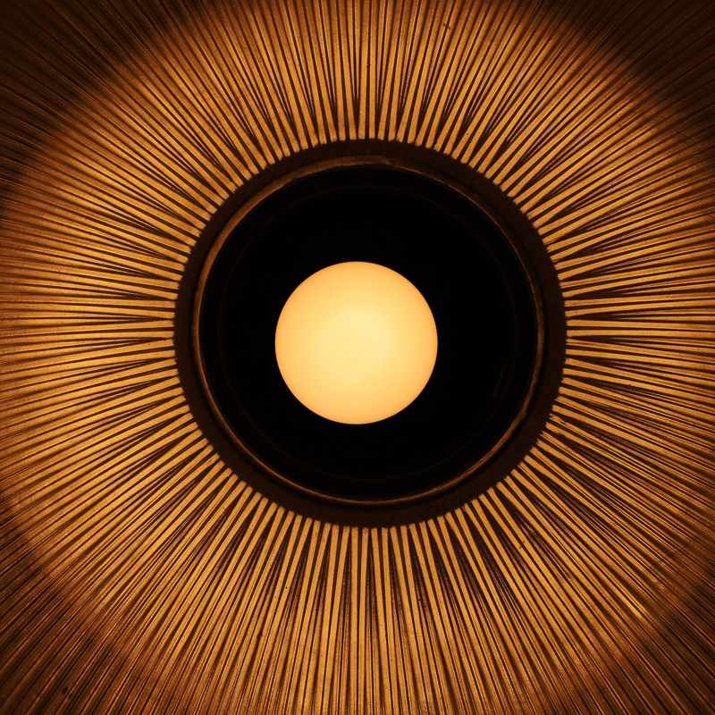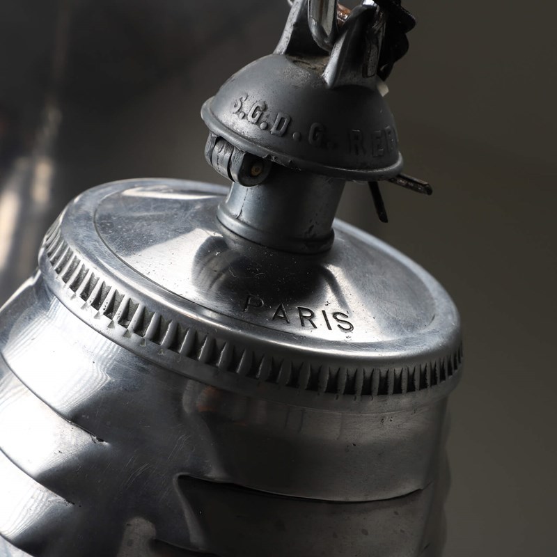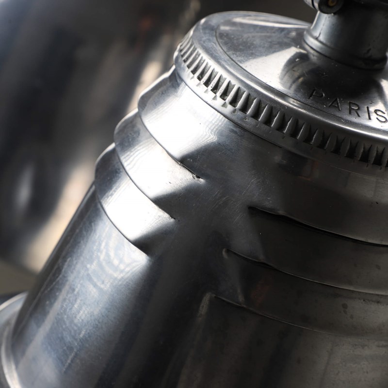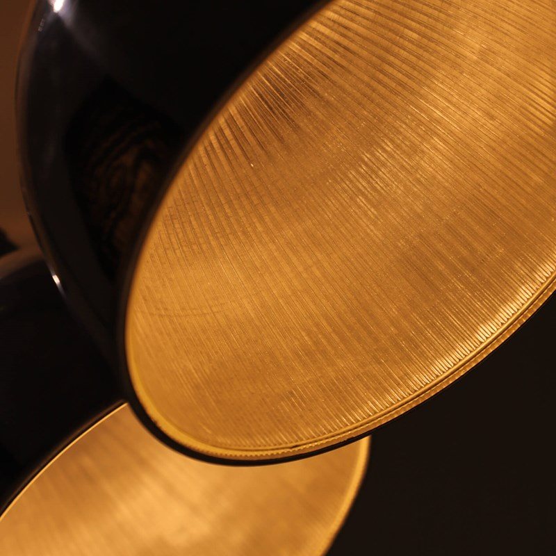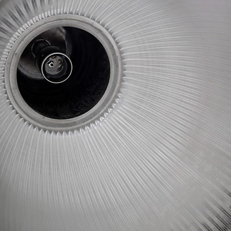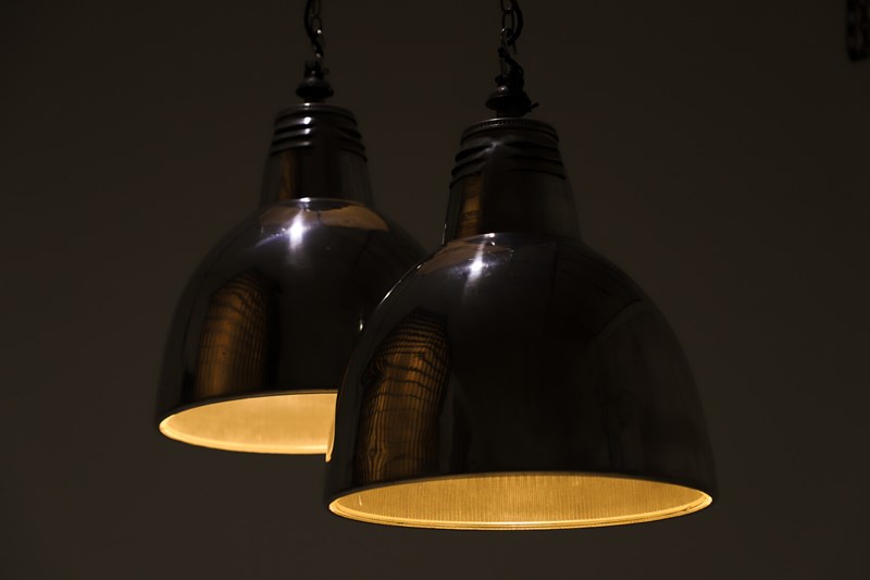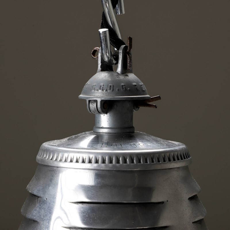 Large polished spun alloy exterior with cast metal gallery & elegant prismatic glass shade.