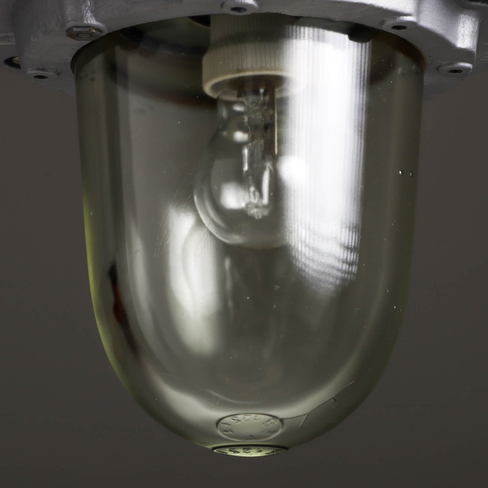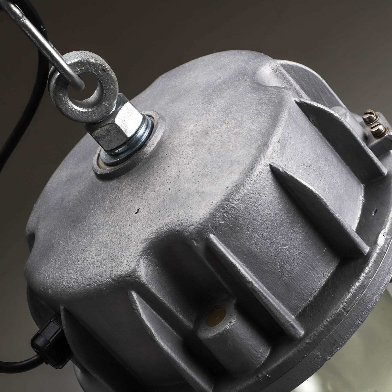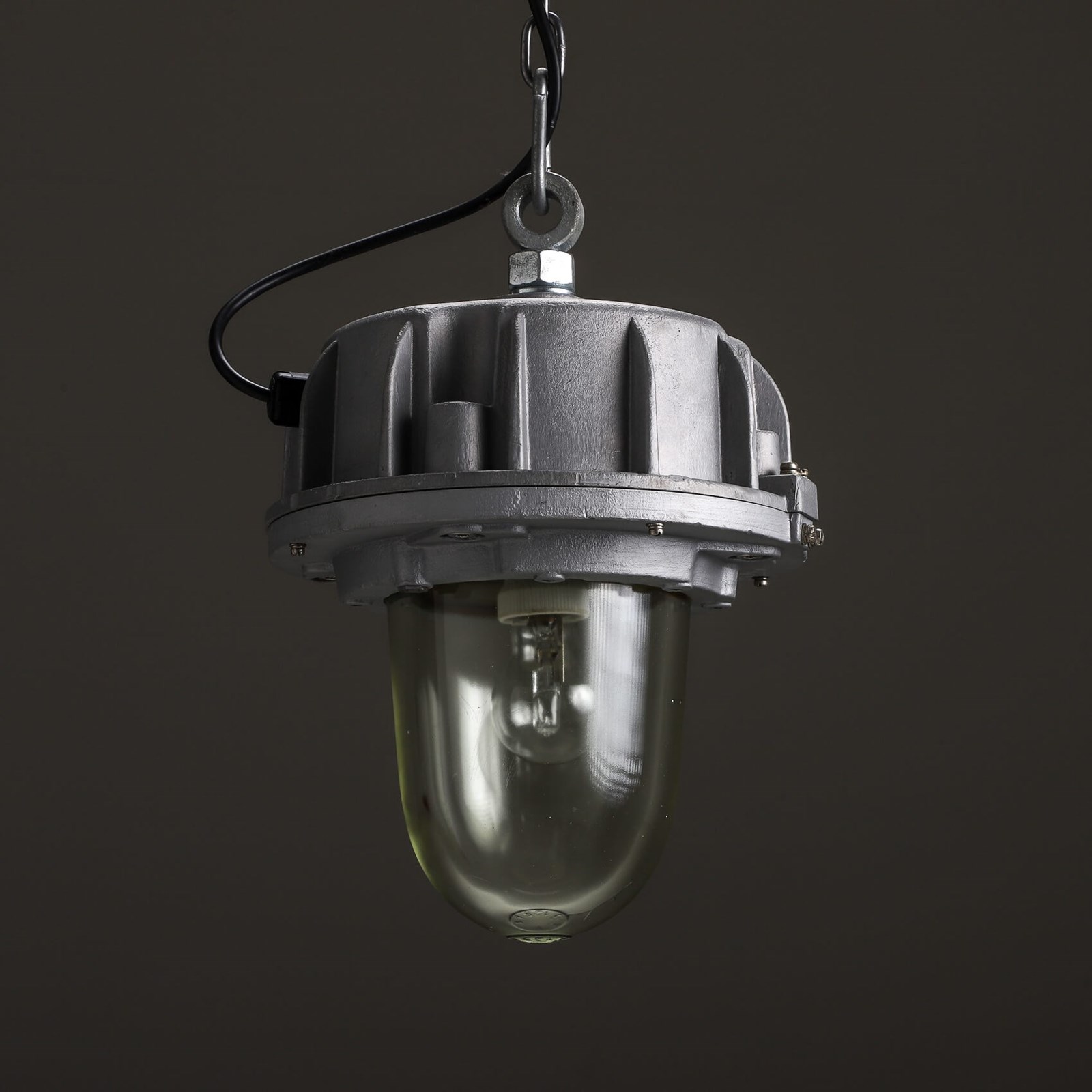 Explosion-proof pendant lights with cast metal top, thick domed glass lens.