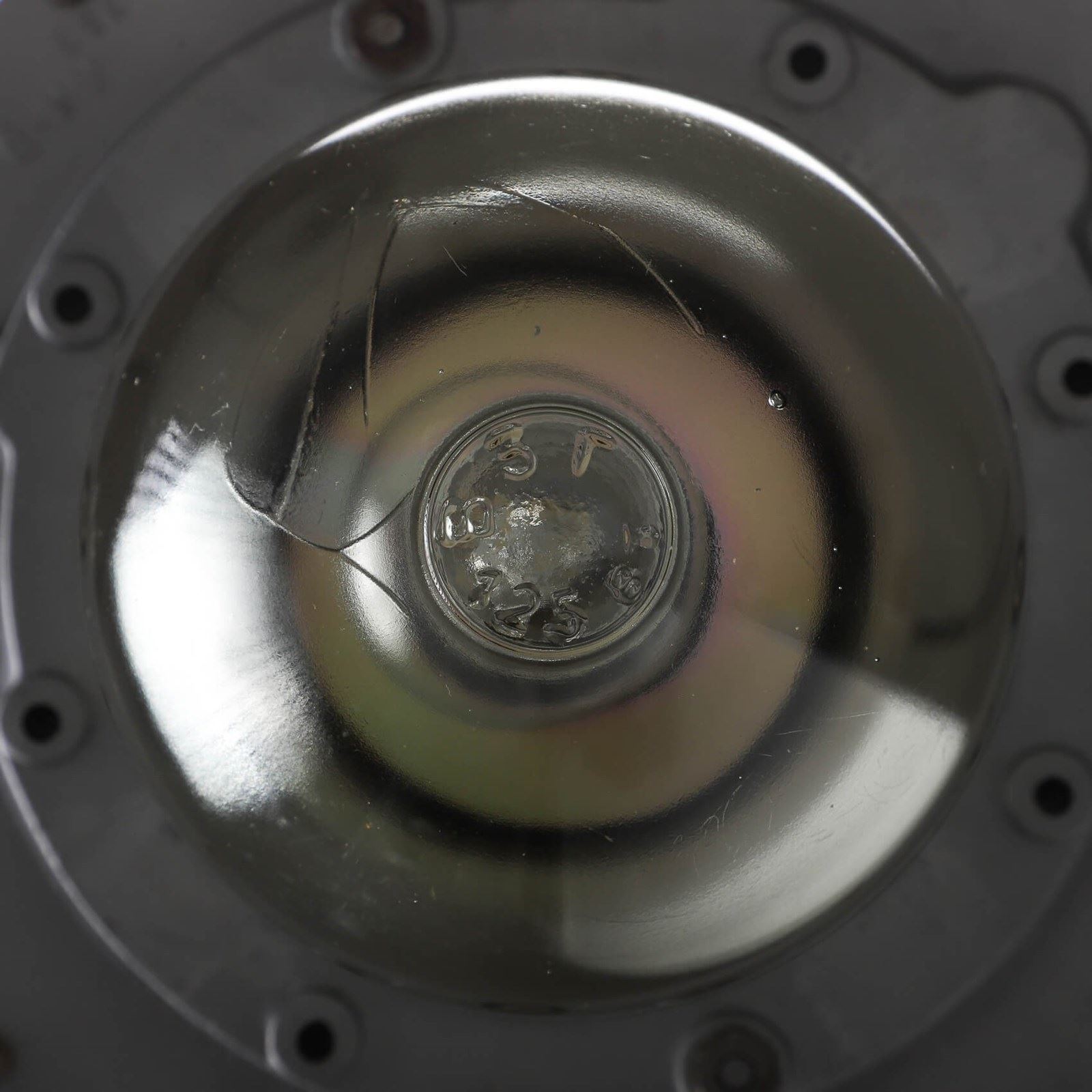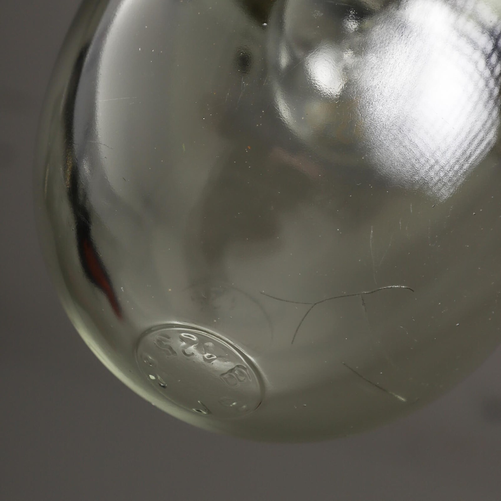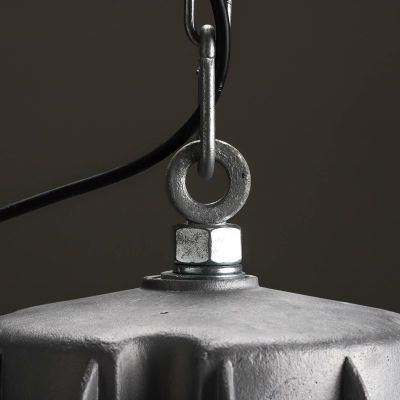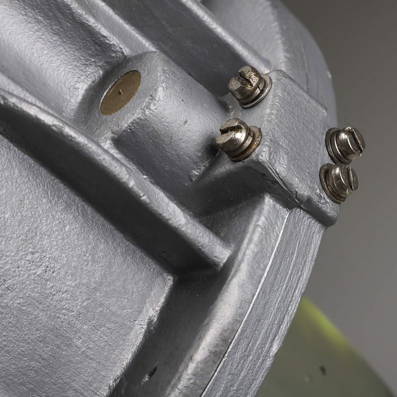 Explosion-proof pendant lights with cast metal top, thick domed glass lens.