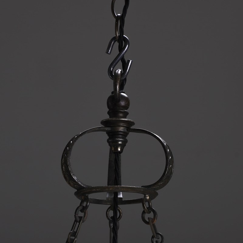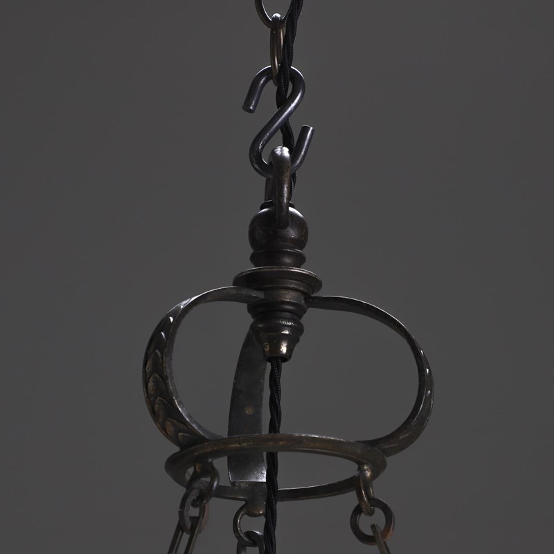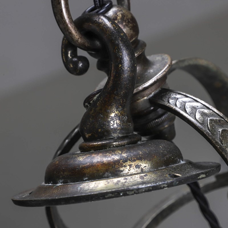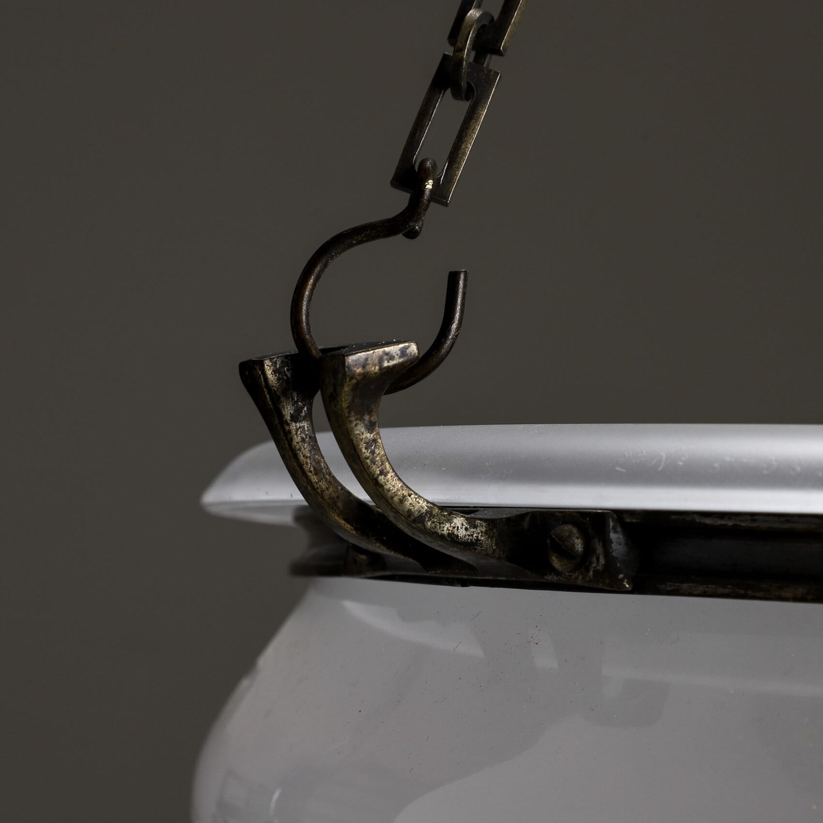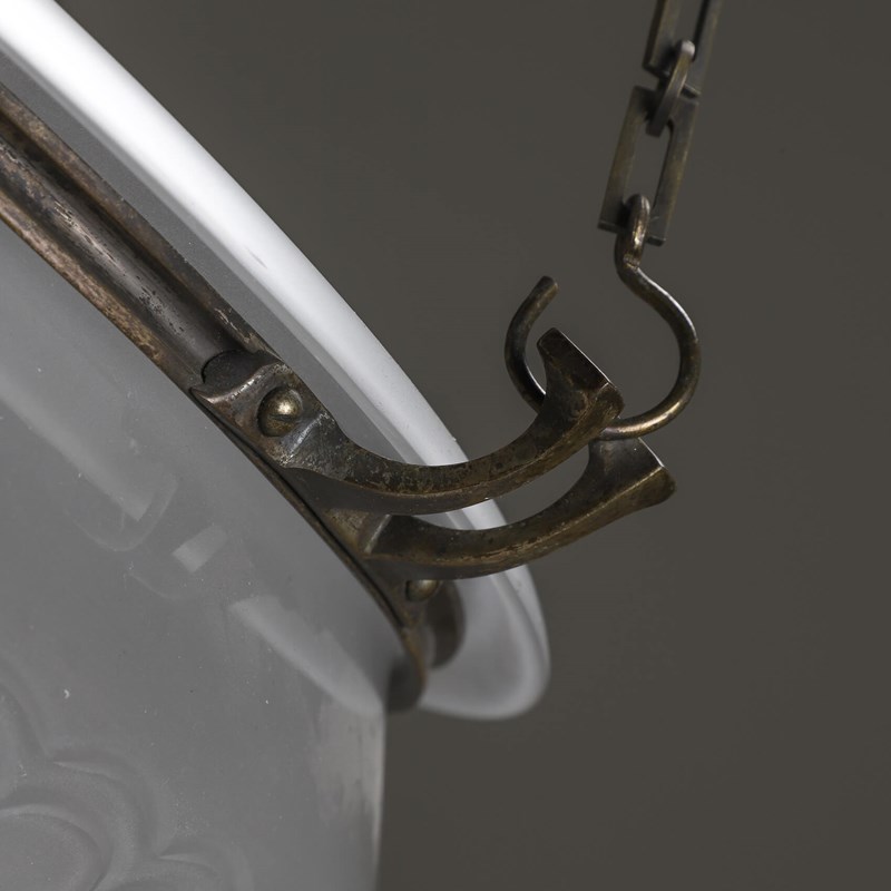 Original aged brass ring with matching three hook hanger & ceiling hook – stamped with makers mark.