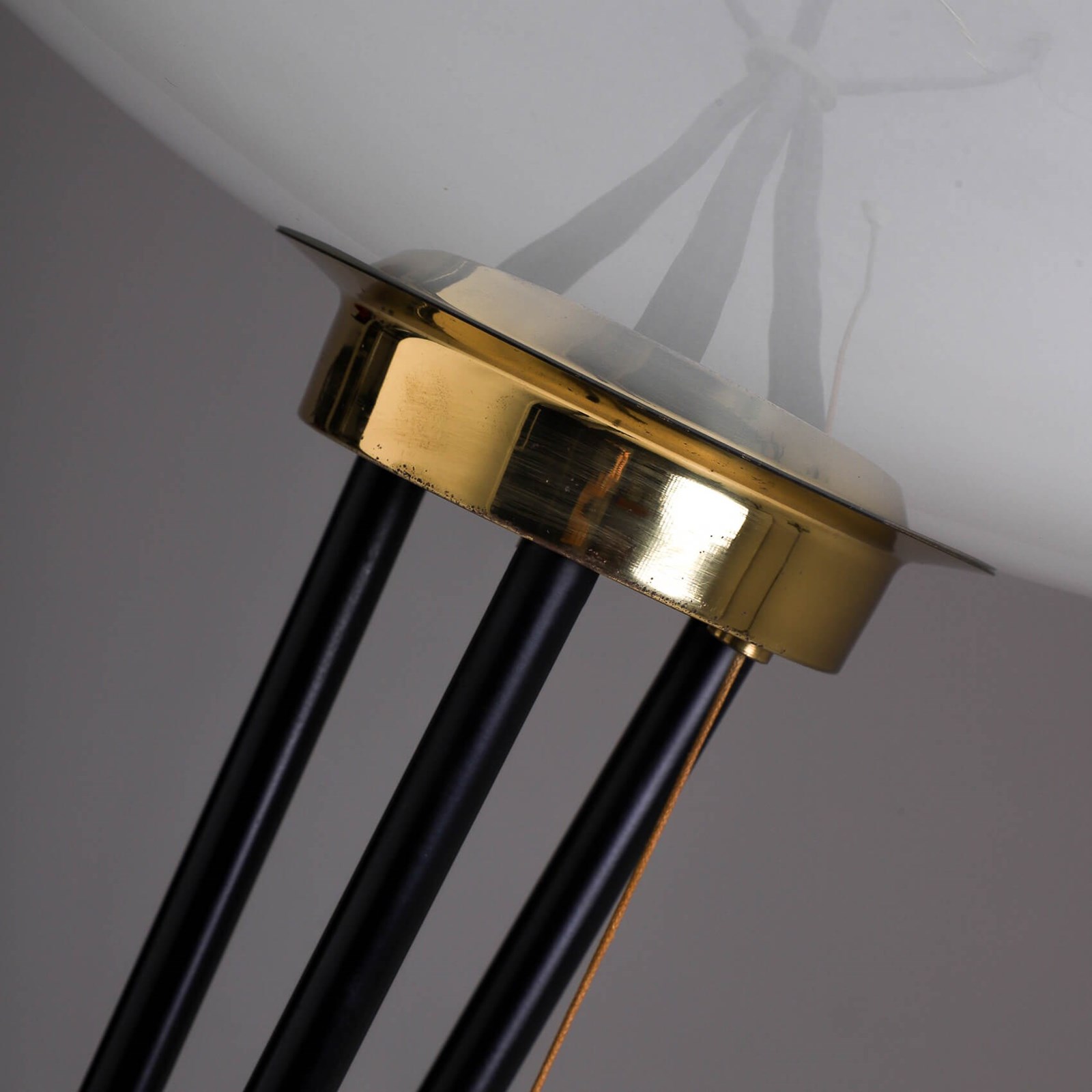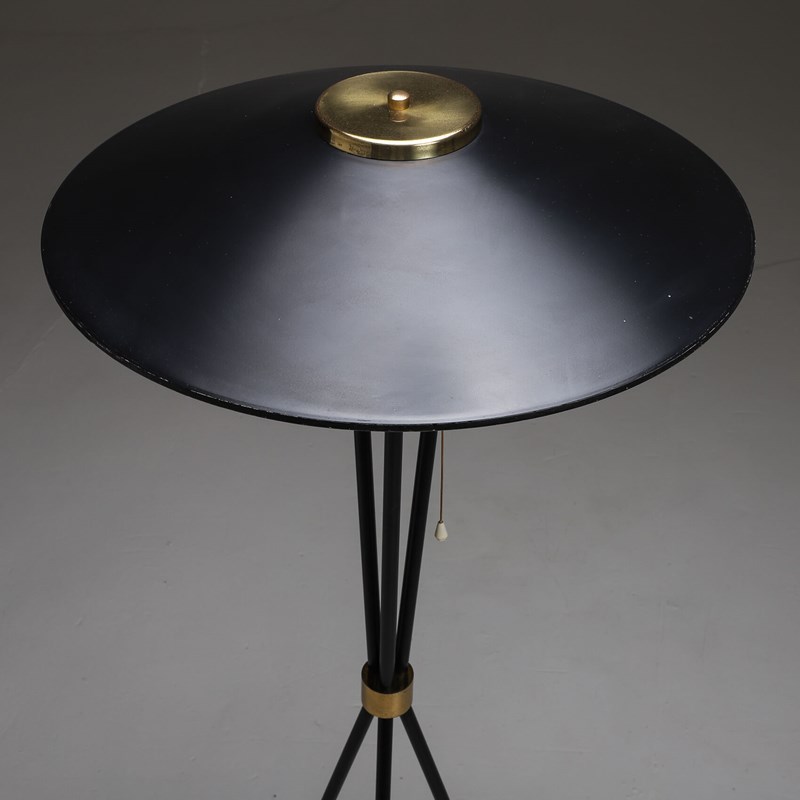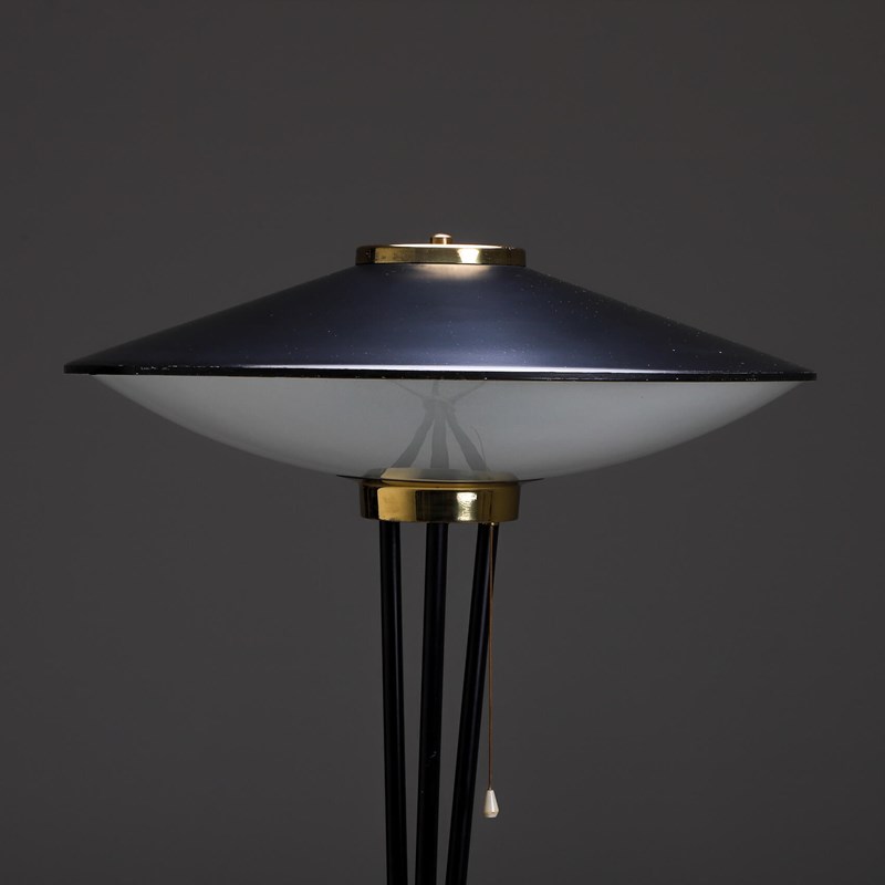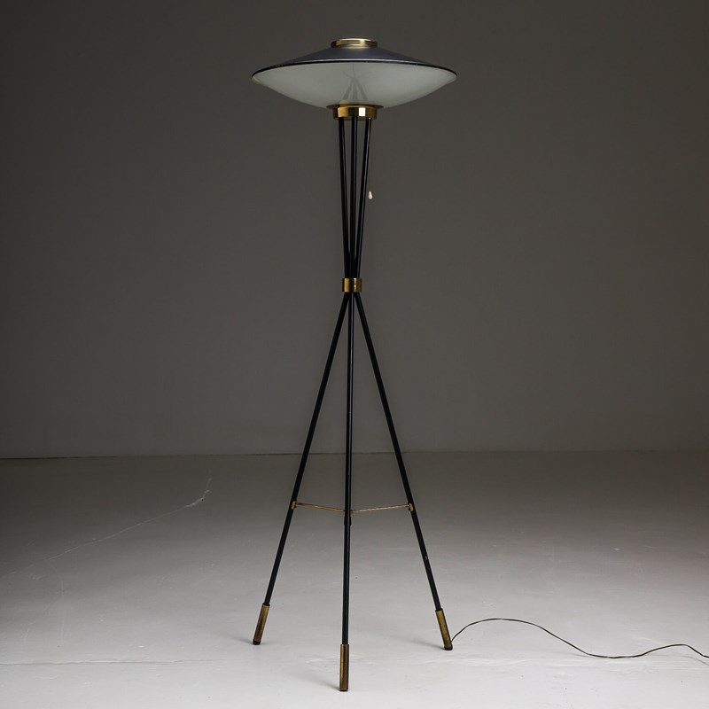 Featuring a black lacquered aluminium shade with frosted glass diffuser, set on an elegant tripod base