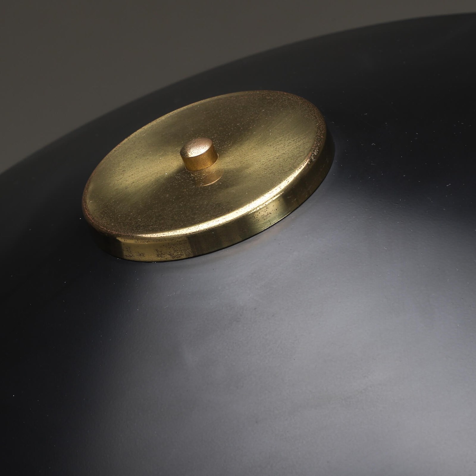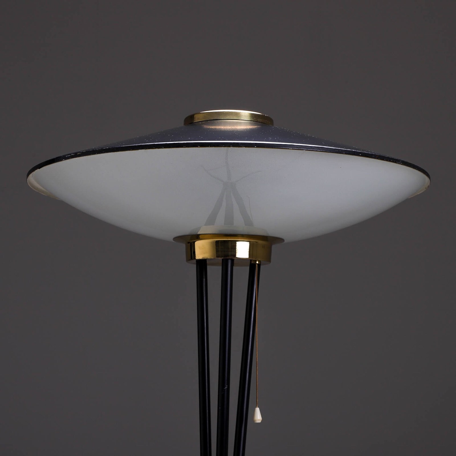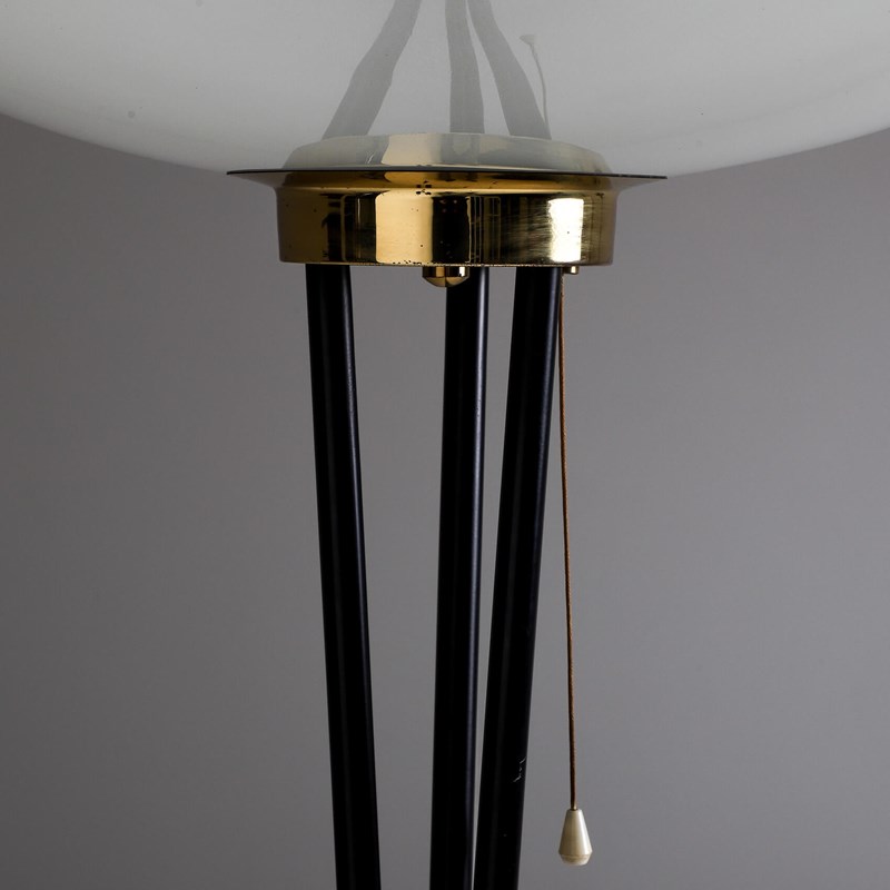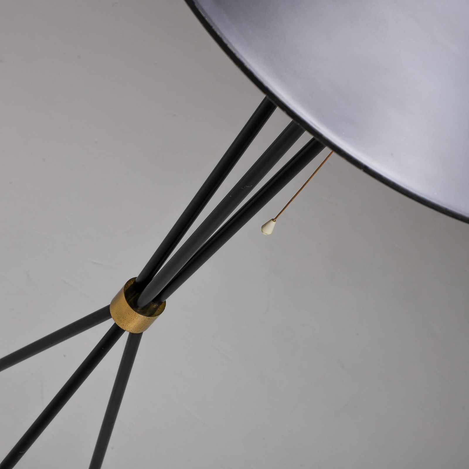 Featuring a black lacquered aluminium shade with frosted glass diffuser, set on an elegant tripod base