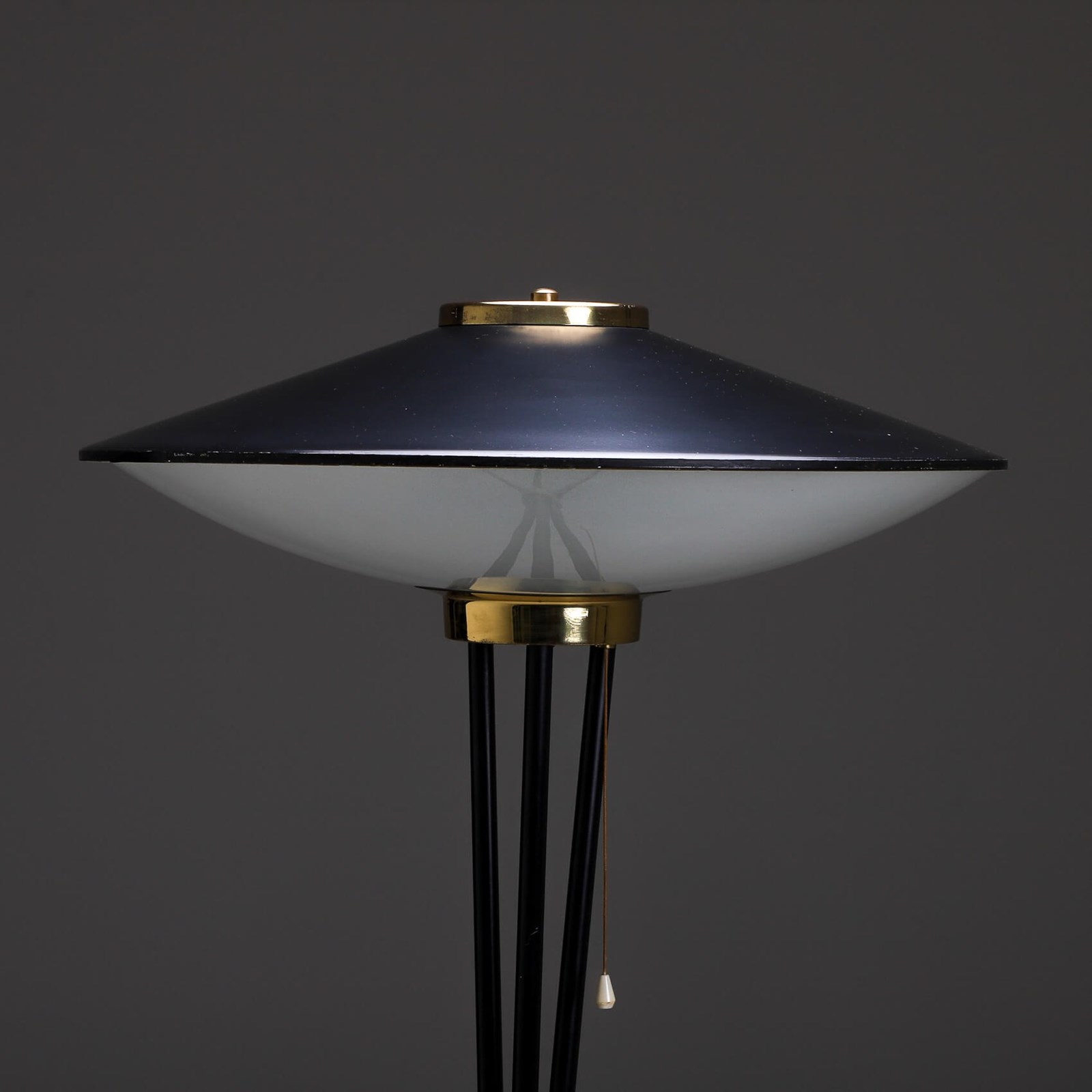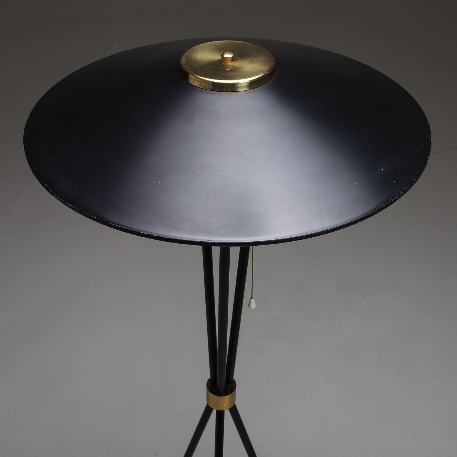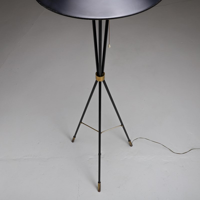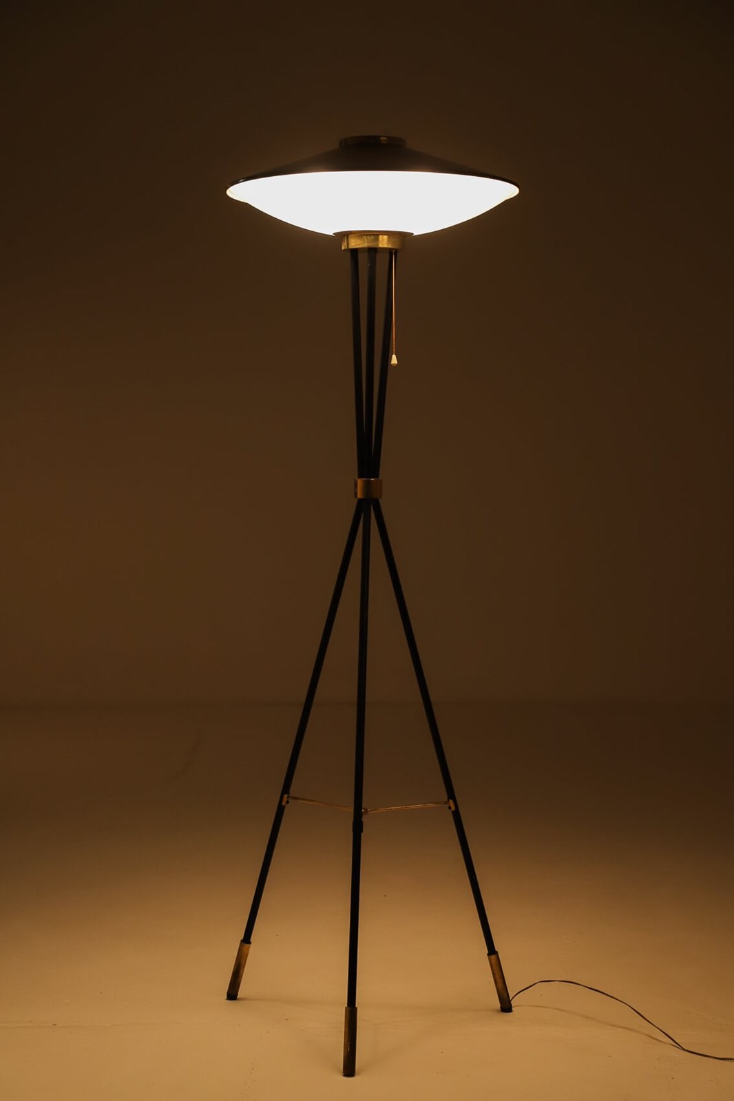 A striking black and brass floor lamp by Stilnovo, showcasing timeless mid-century Italian style.