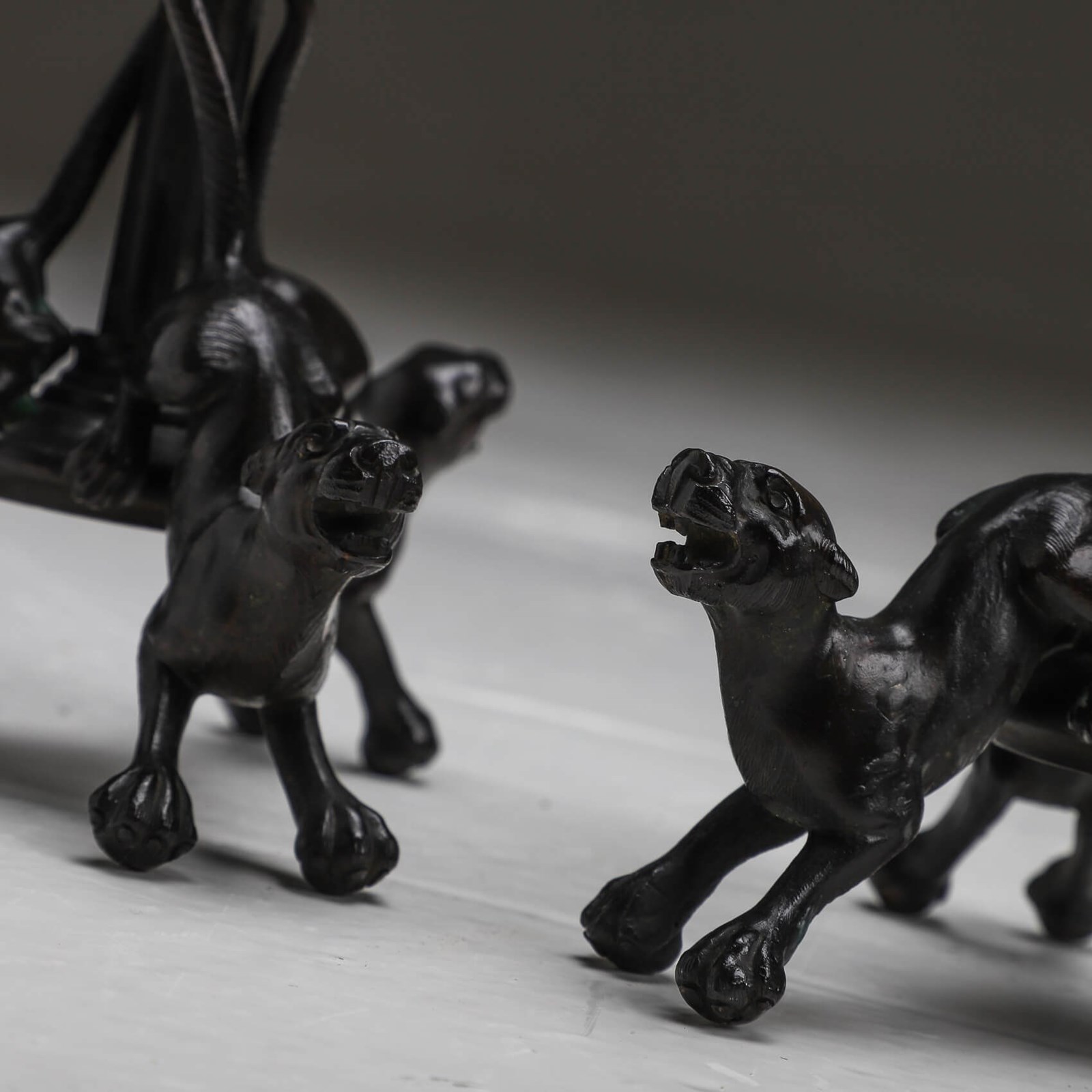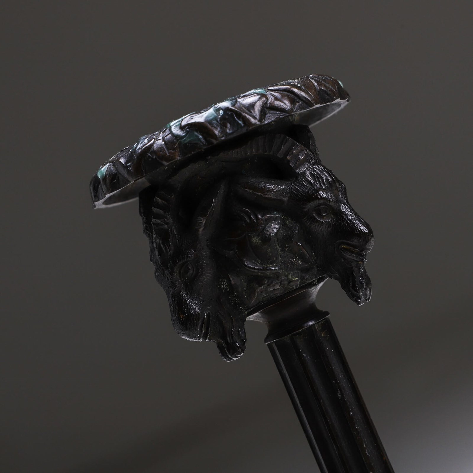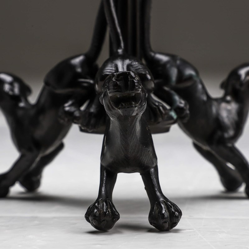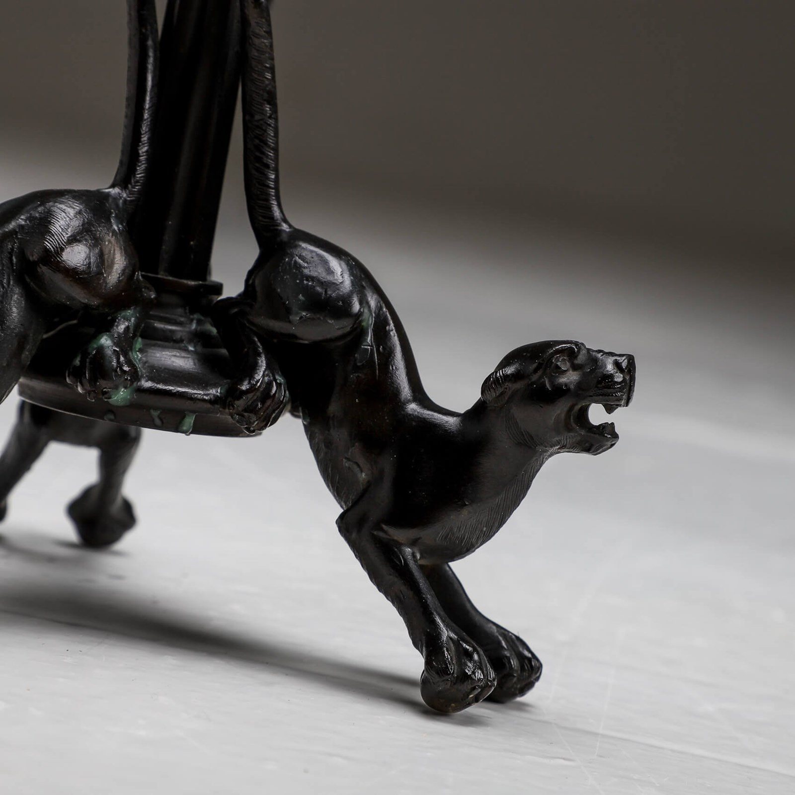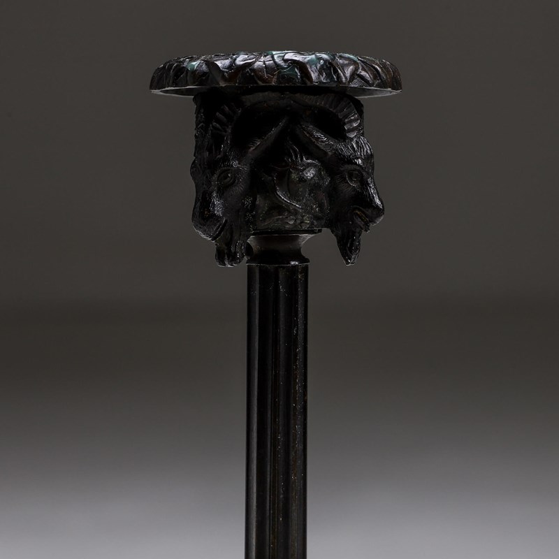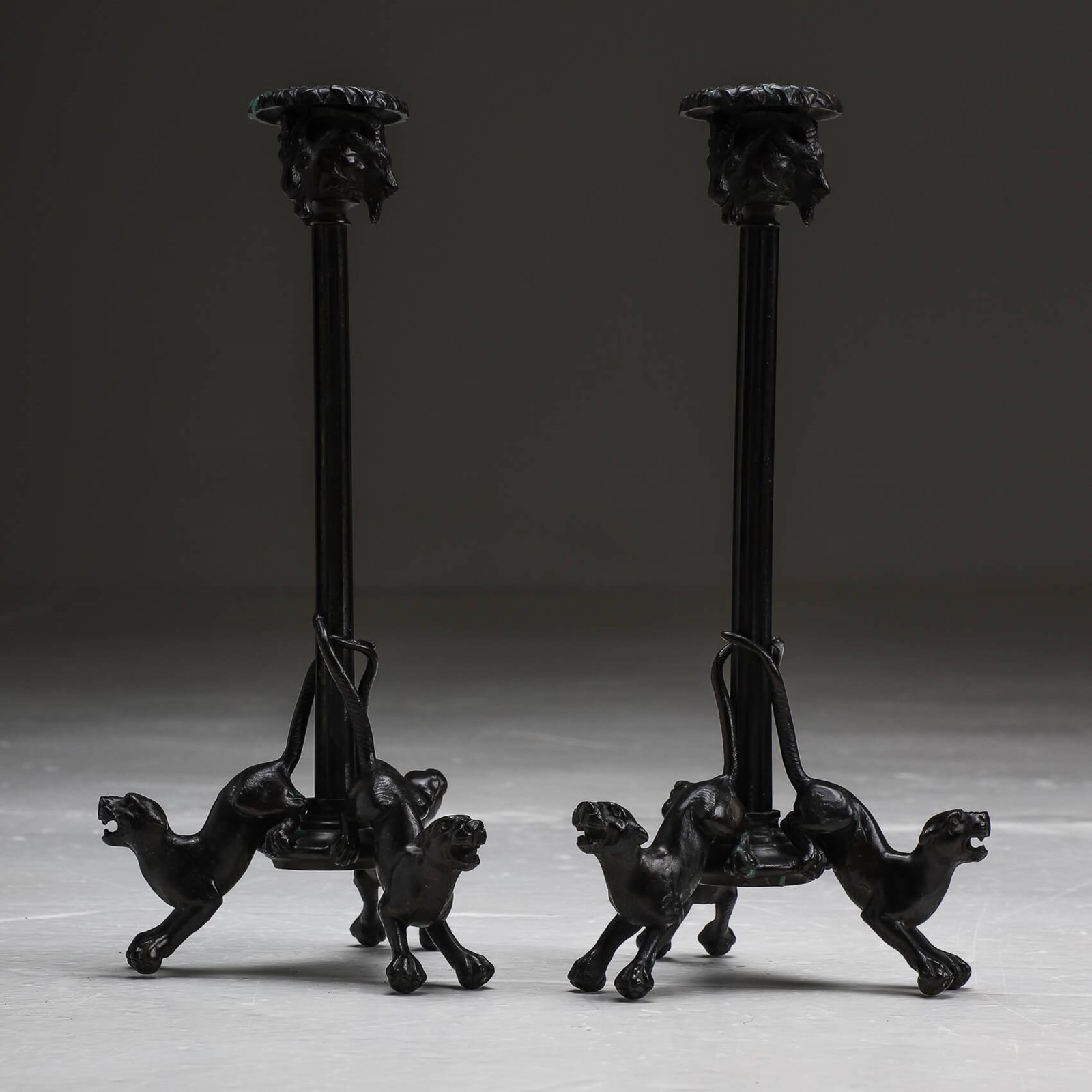 Beautifully executed with exquisite attention to detail, each candlestick features finely modelled goat heads resting upon a fluted column, supported by three pumas forming the tripod base.
