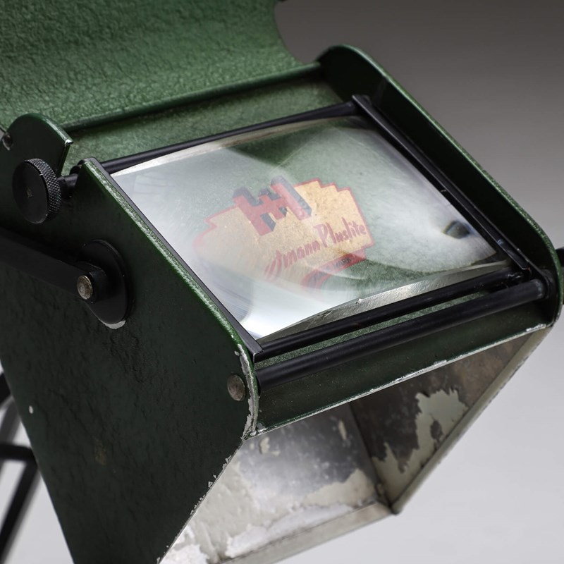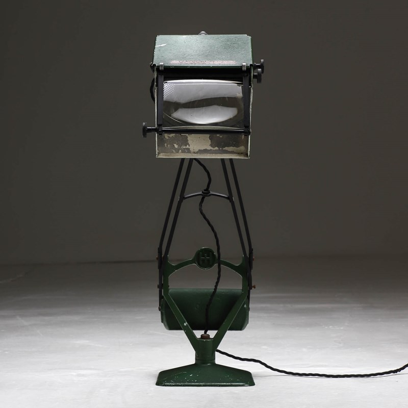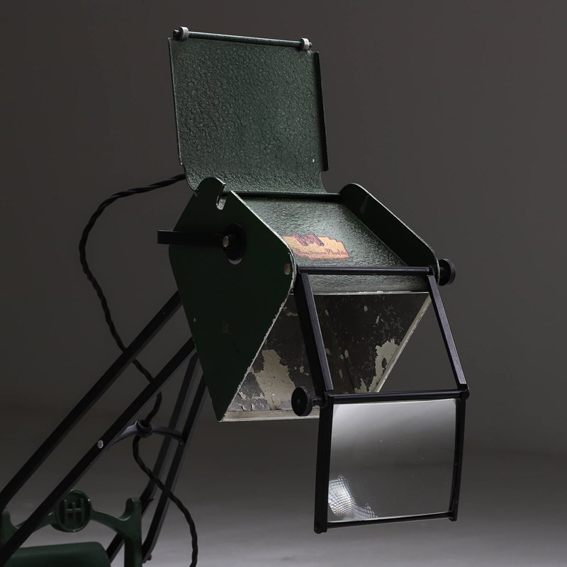 Created as a map reading lamp the unique design features an adjustable magnifying glass and counter balance system that allows extensive adjustment of the lamp. Original labels intact along with makers emblem cast logo to the centre fork.