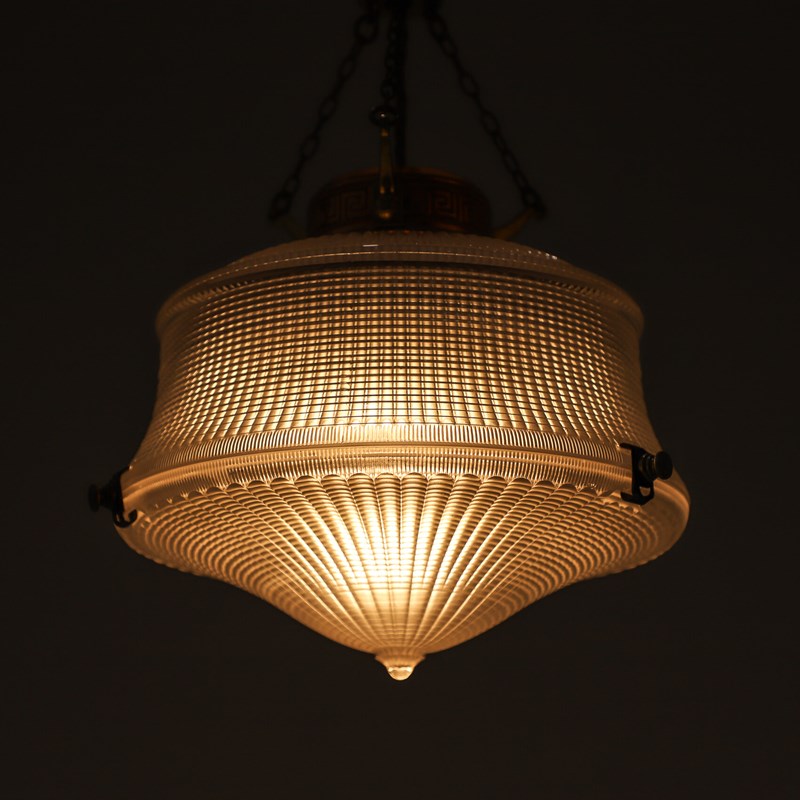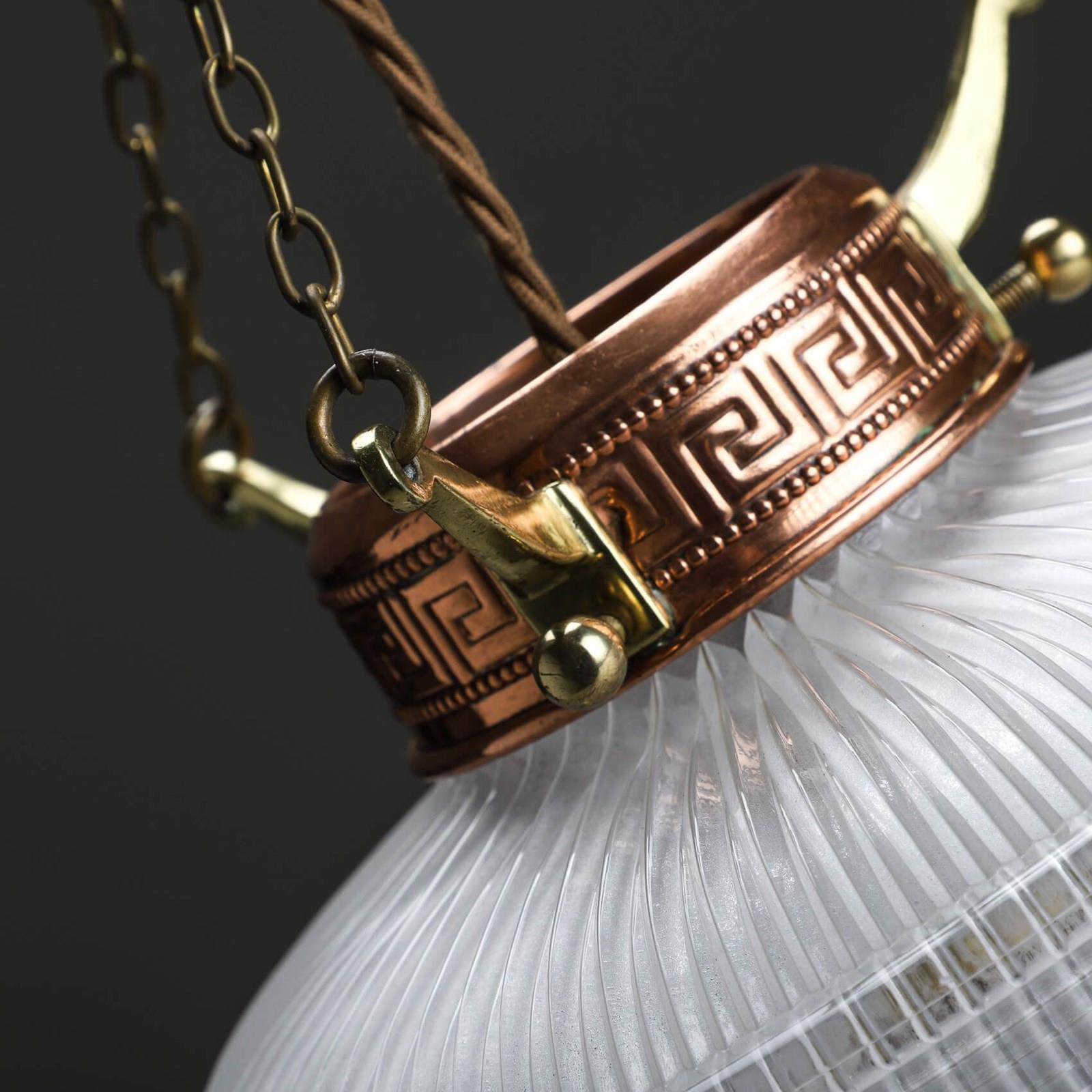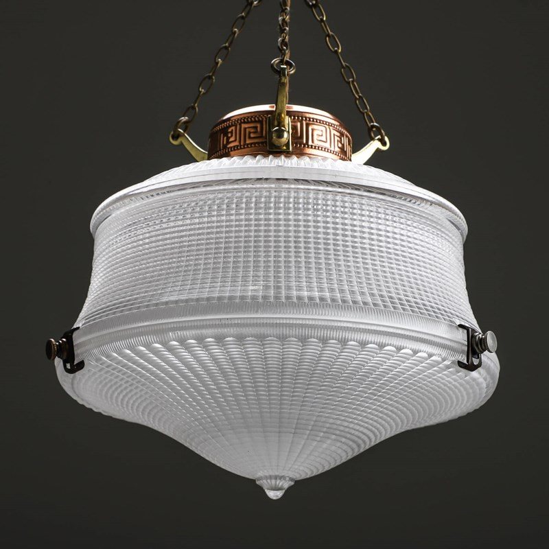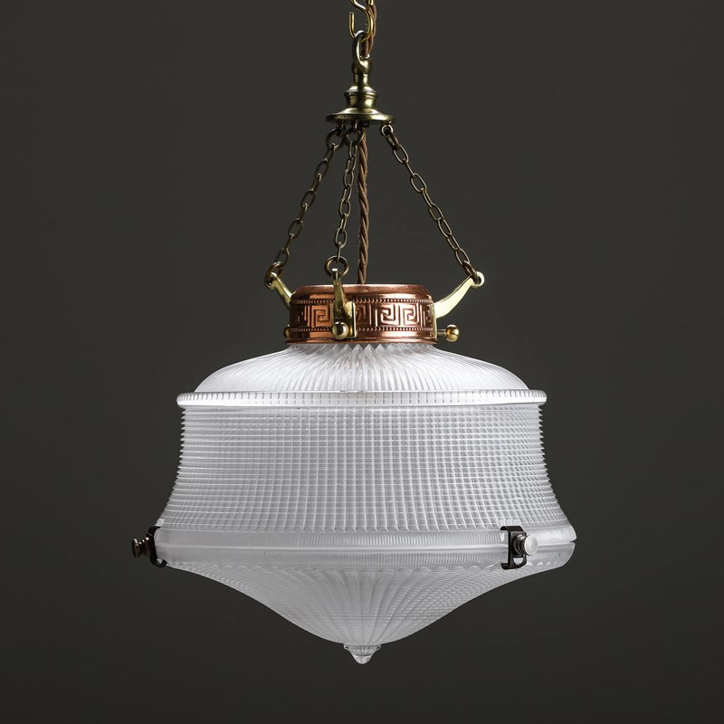 An exceptional and highly sought-after Holophane pendant light, presented with its original elegant copper & brass gallery.
