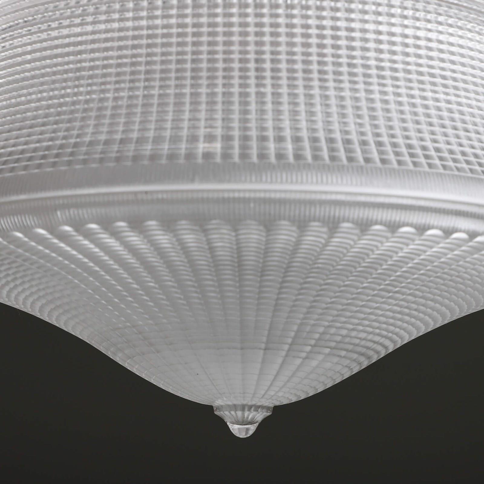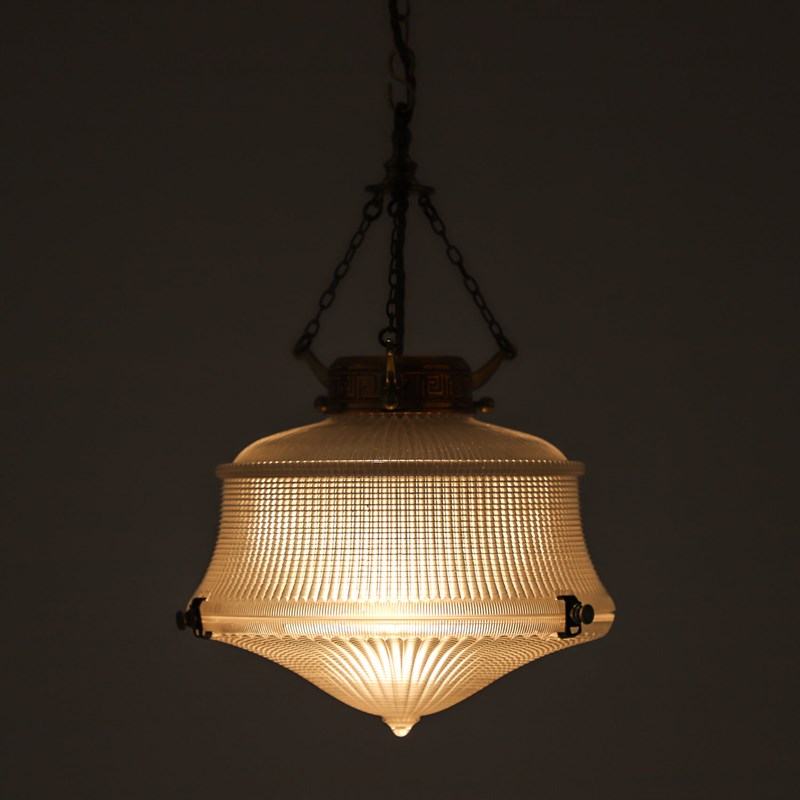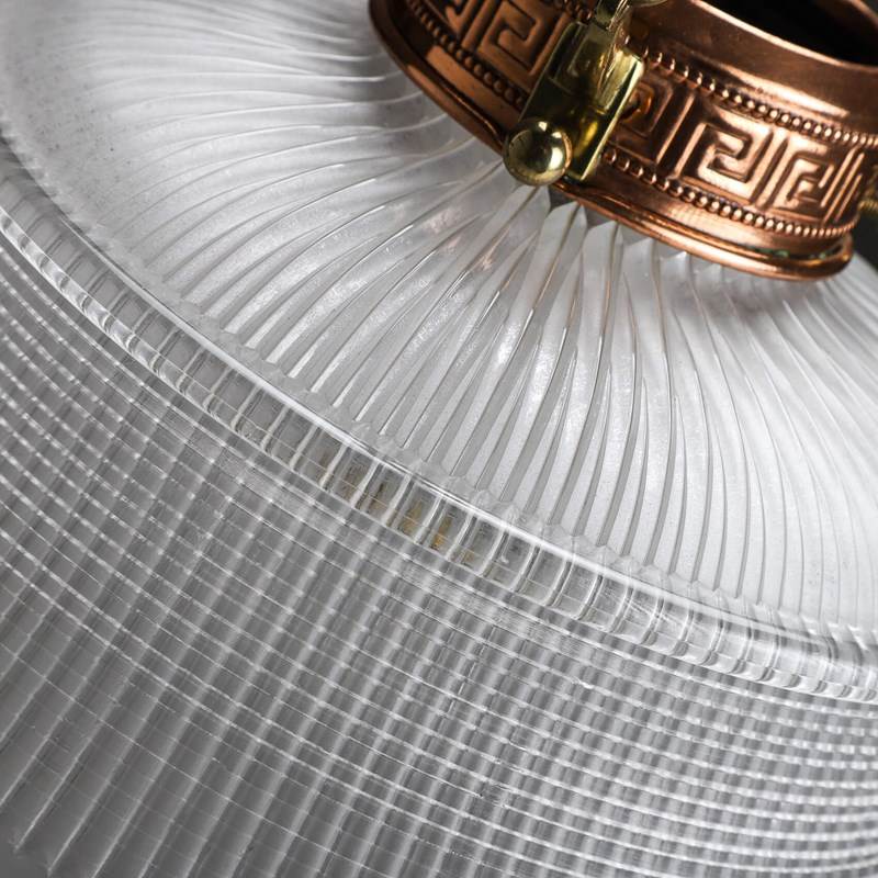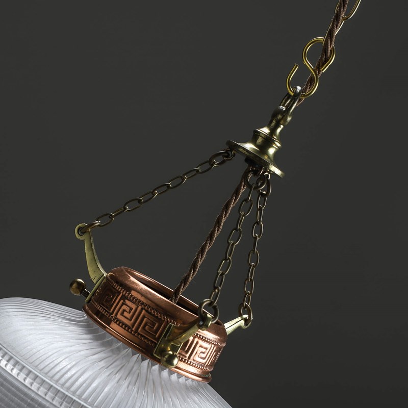 An exceptional and highly sought-after Holophane pendant light, presented with its original elegant copper & brass gallery.