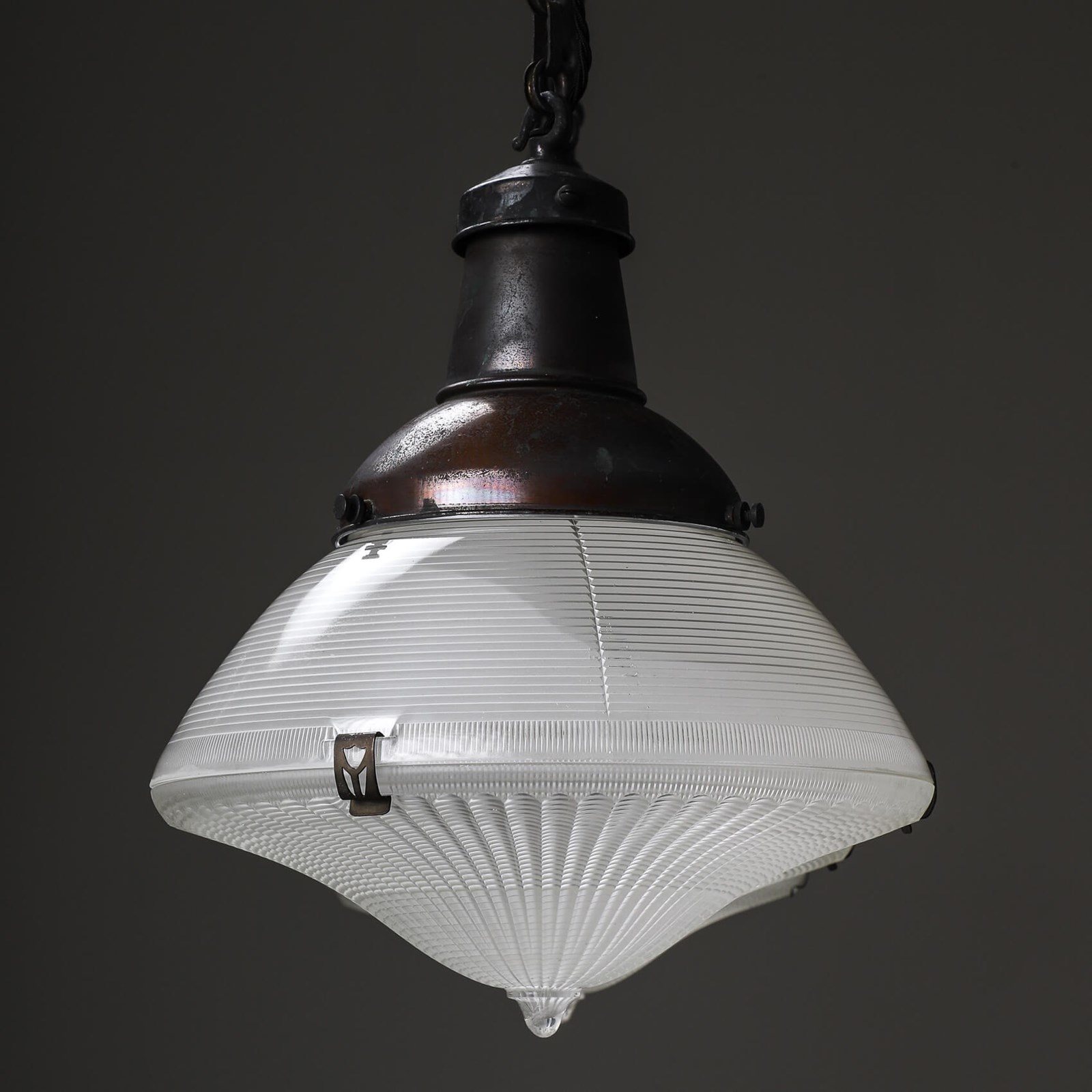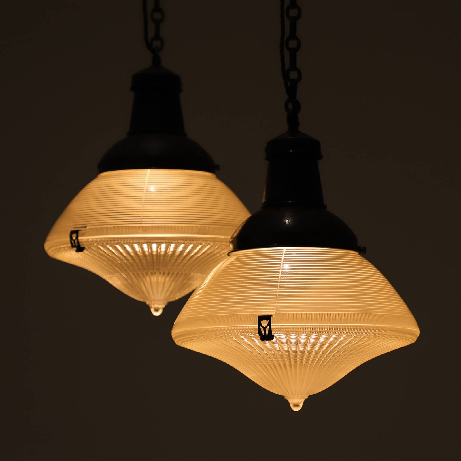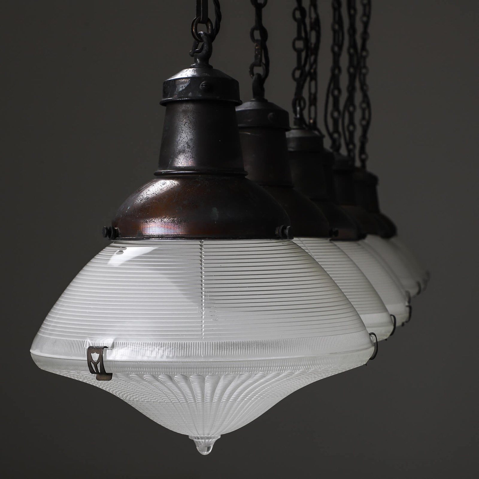 An exceptionally rare collection of original Holophane Focalite pendant lights.