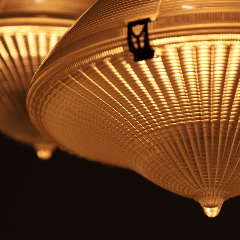 Crafted in the 1930s, each pendant features a two-part prismatic glass enclosure, designed for optimal light diffusion. Complete with original spring clips and aged two-part galleries, all sections are fully stamped and numbered — a true testament to their authenticity and provenance.