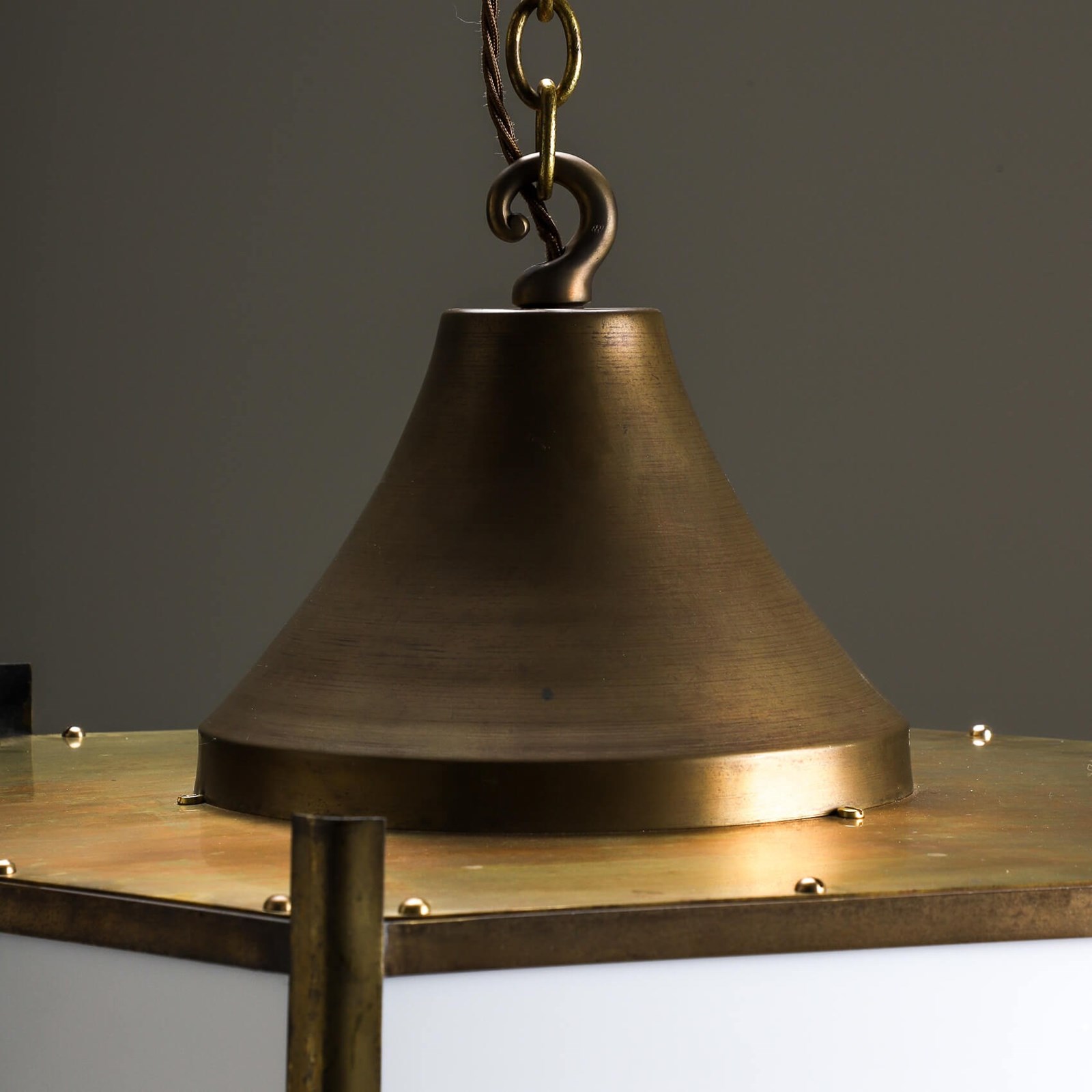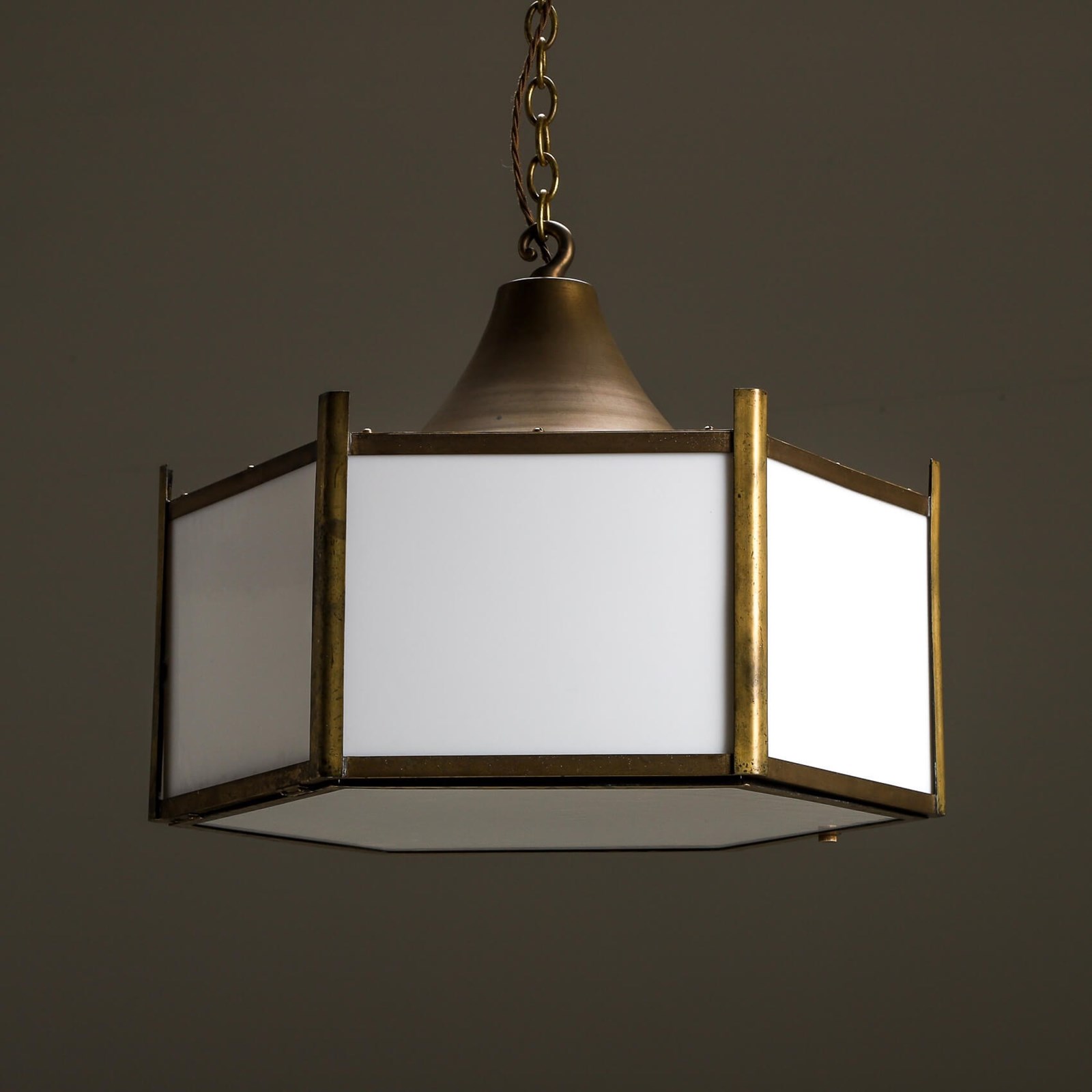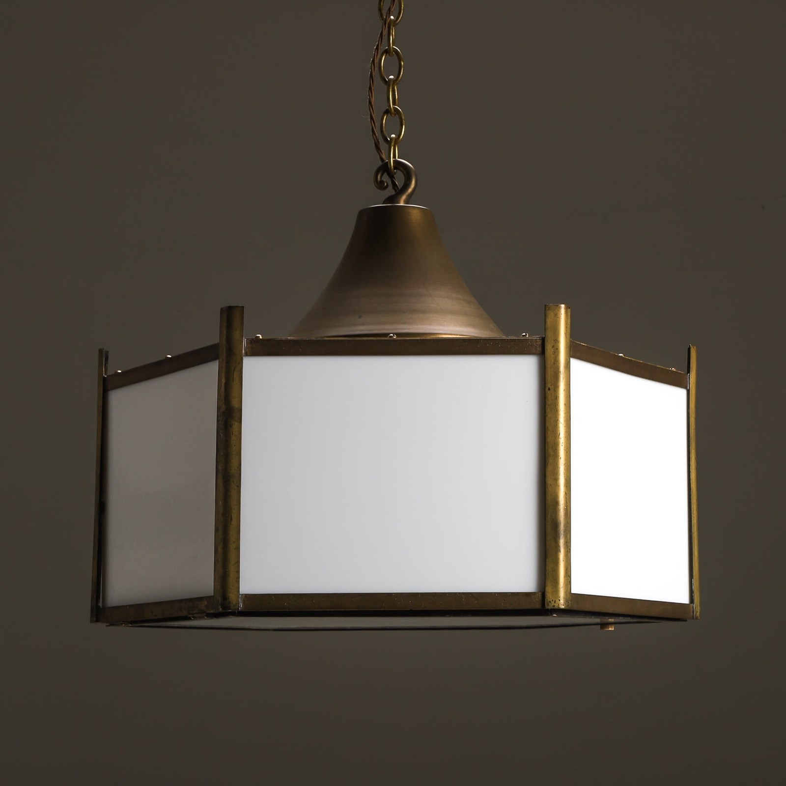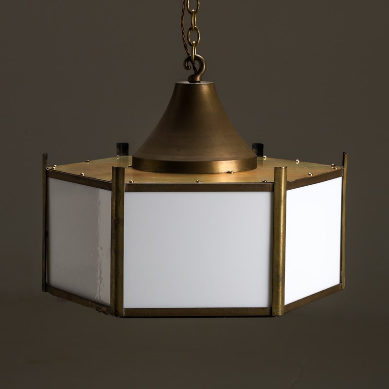 Beautifully crafted from brass & complement with opaline glass panels giving the a soft ambient glow when lit.