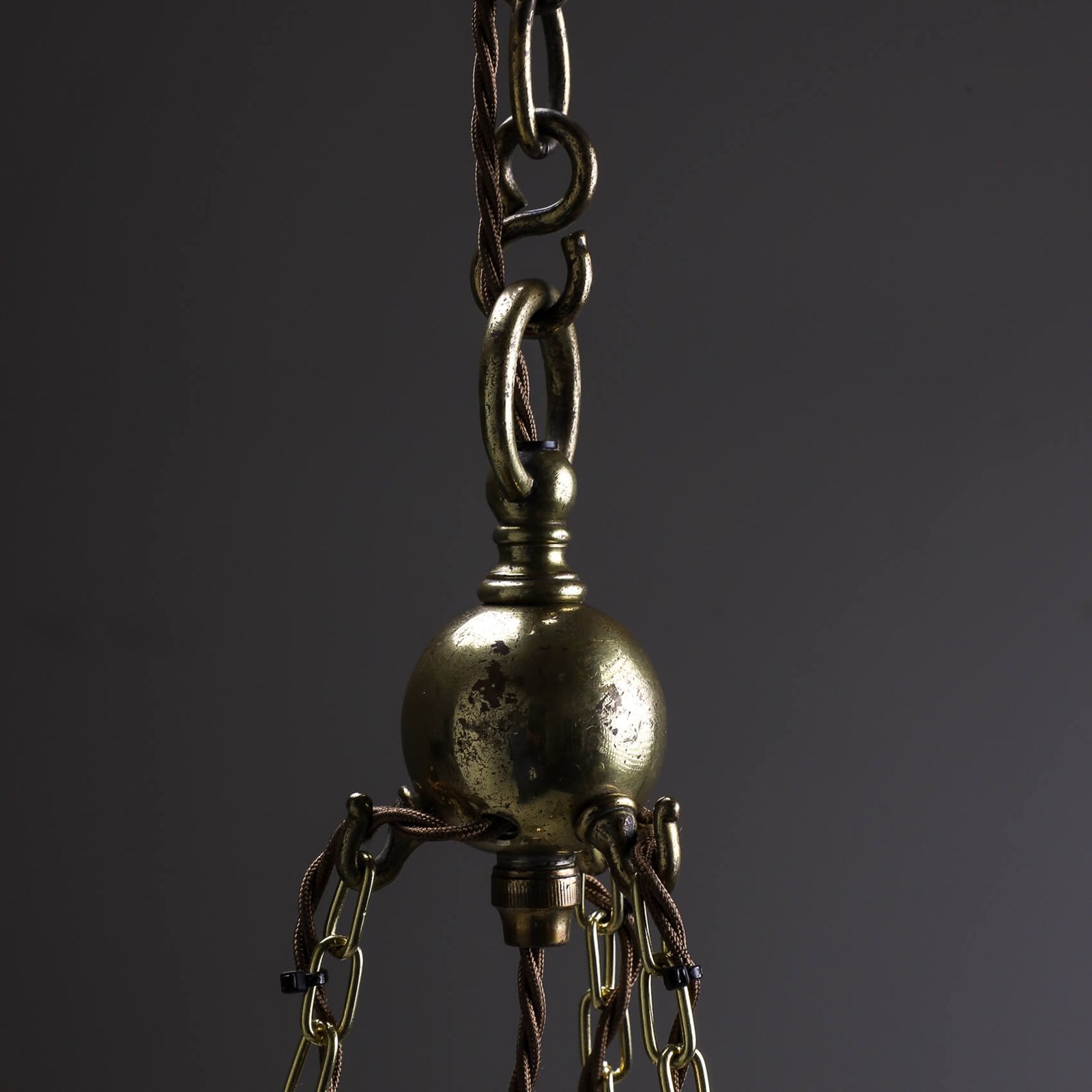 Pristinely presented with original aged brass cage, gallery, chain & 3 way hook.