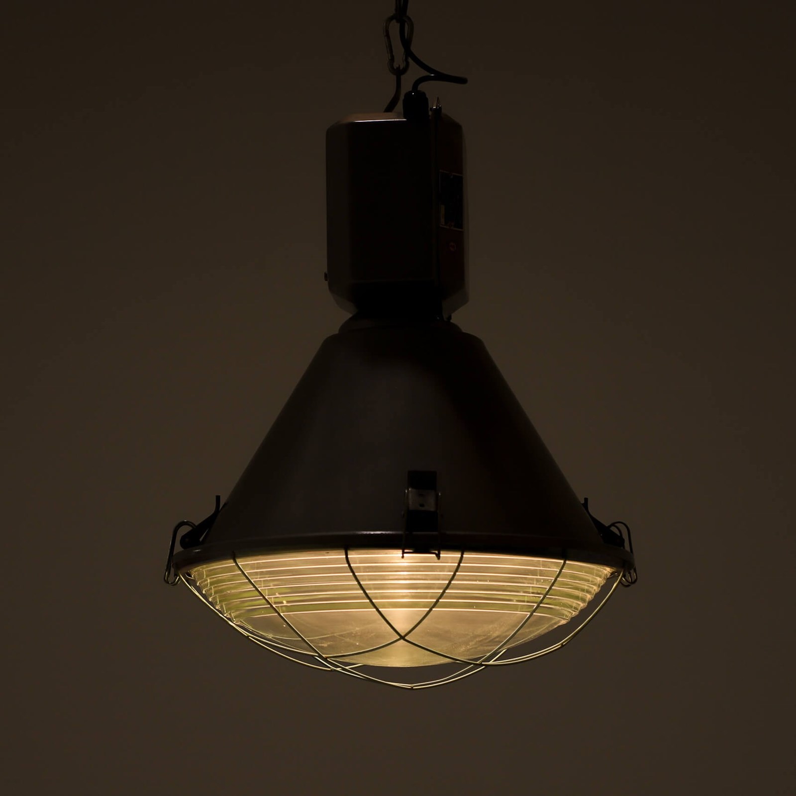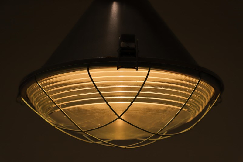 A run of XL industrial pendant lights by Mesko.