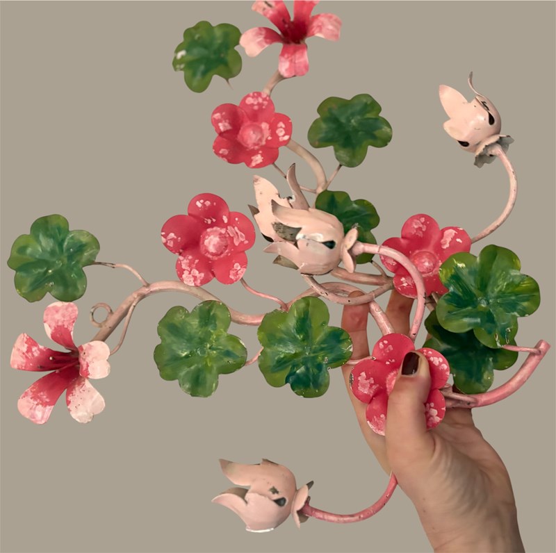 A pair of Italian pink and green painted tole stylised 'Geranium' sconces, 1950s - designed as a pair of serpentine foliate stems set with flowers, the double branches with leaf form bulb holders.