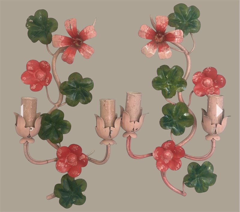 A Pair Of Italian Painted Tole 'Geranium' Sconces, 1950S