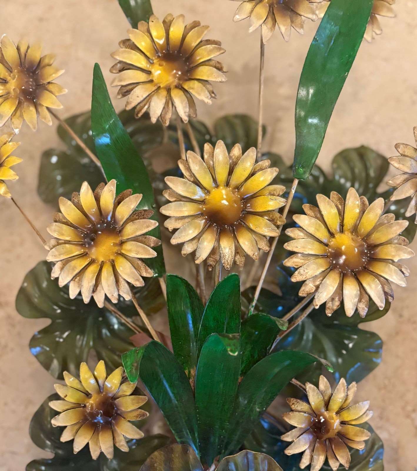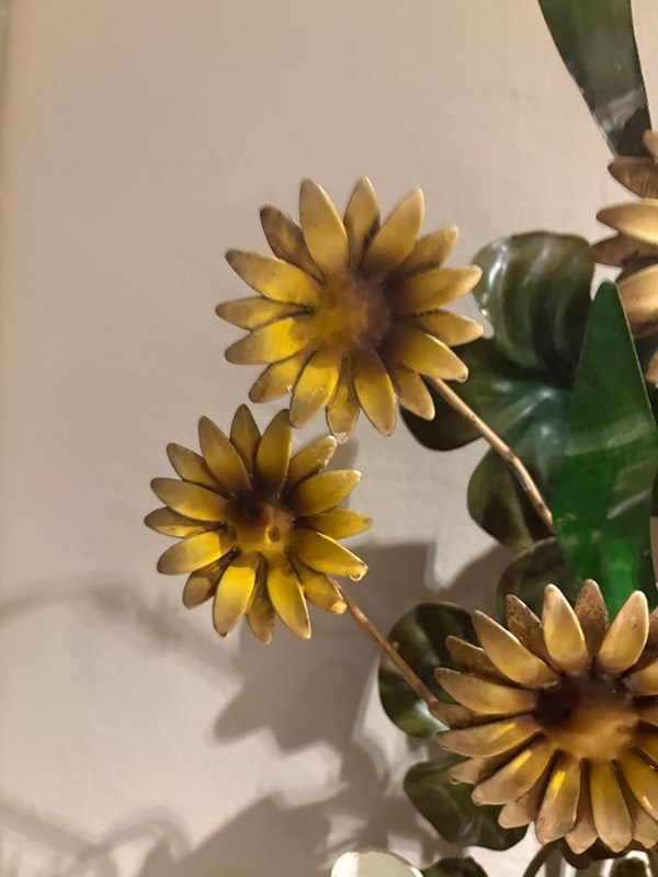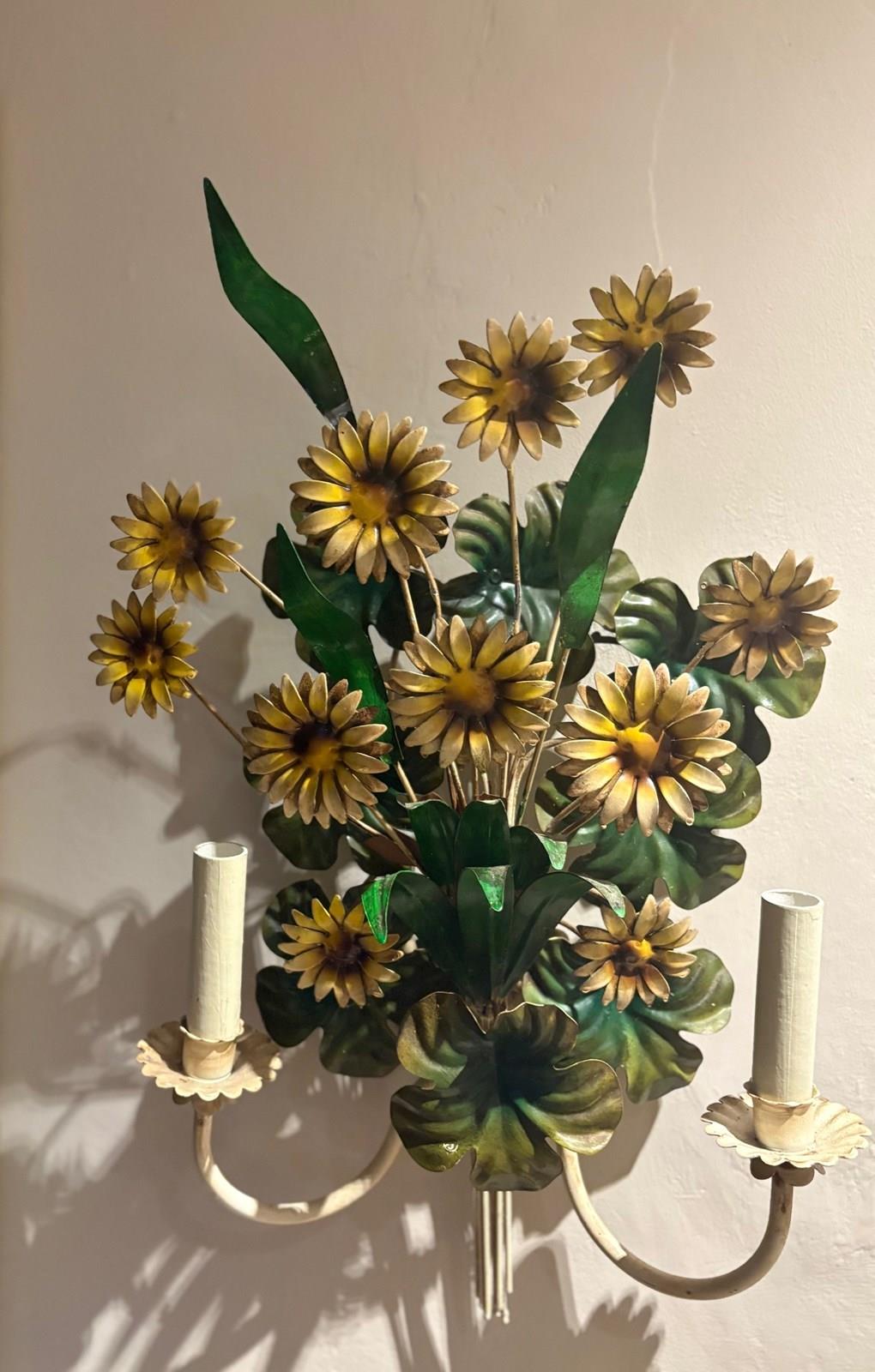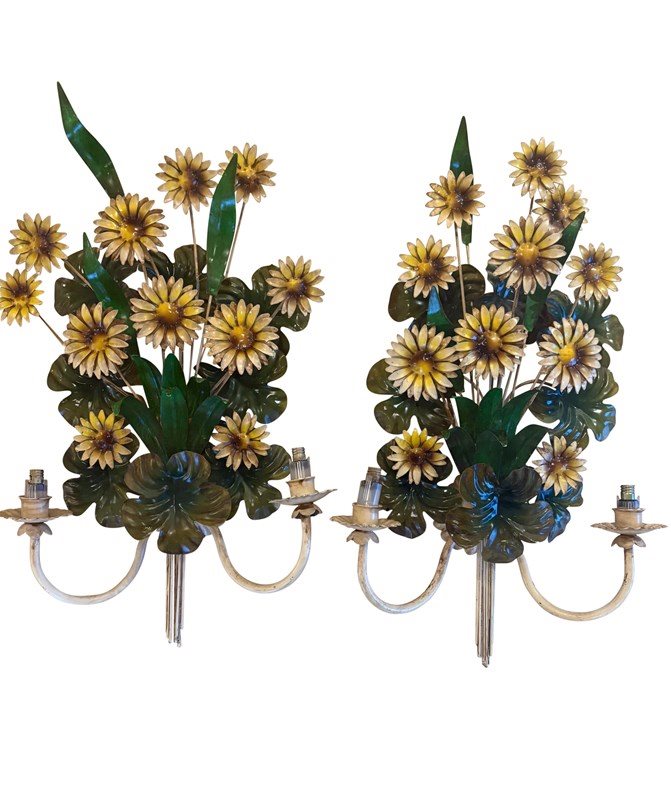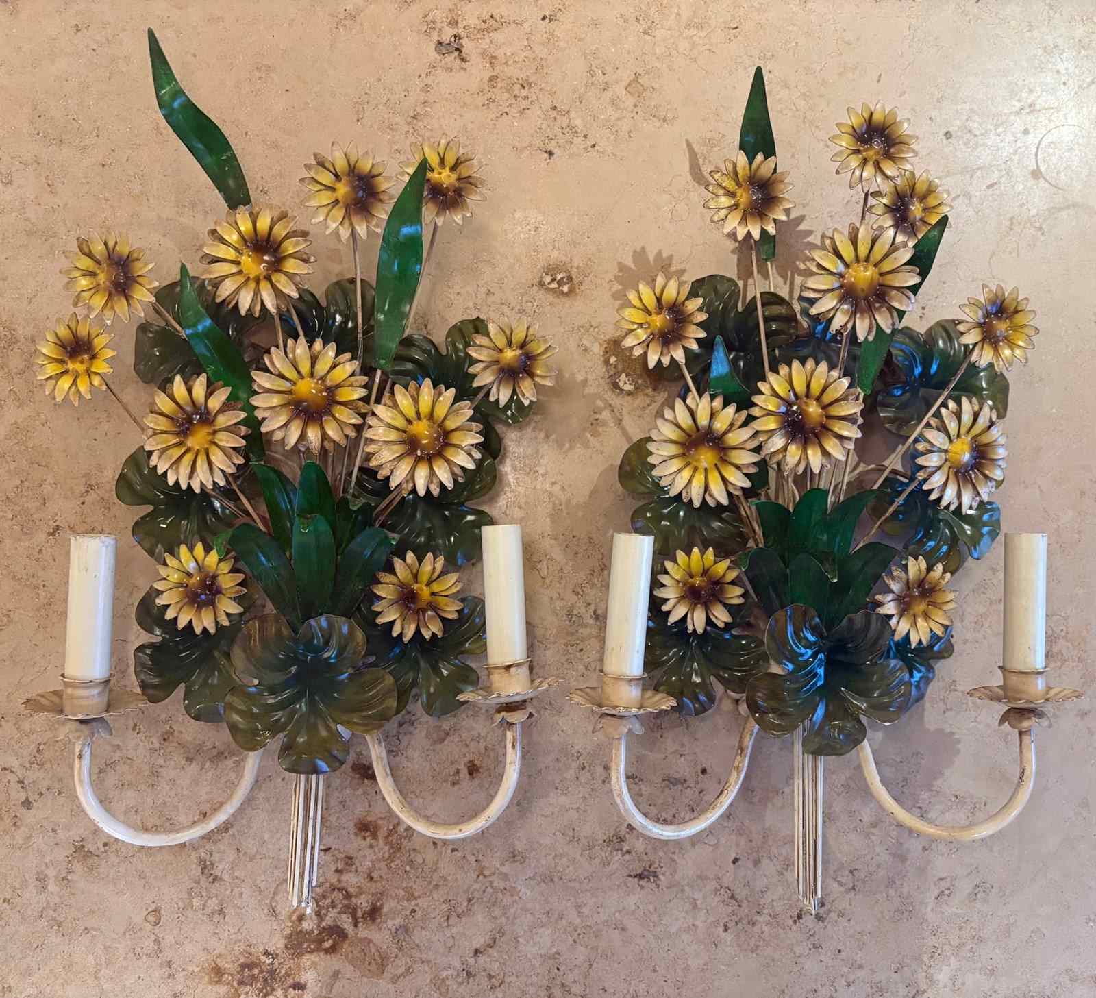 A pair of large Italian painted tole 'Daisy Bouquet' sconces, 1950s - naturalistically designed as generous long stemmed sprays of multi petalled Rudbeckia style flowers amongst tall and scrolling leaves, the twin serpentine branches with scallop edged bulb holder detail. In good overall condition consistent with age with minor paint losses in places but nothing detracting in our opinion. A statement pair of larger sized botanical sconces - scarce in this statuesque size and in this sought after design. Stylish on the wall. Can be wired and PAT tested - please enquire. Equally stunning with candles.