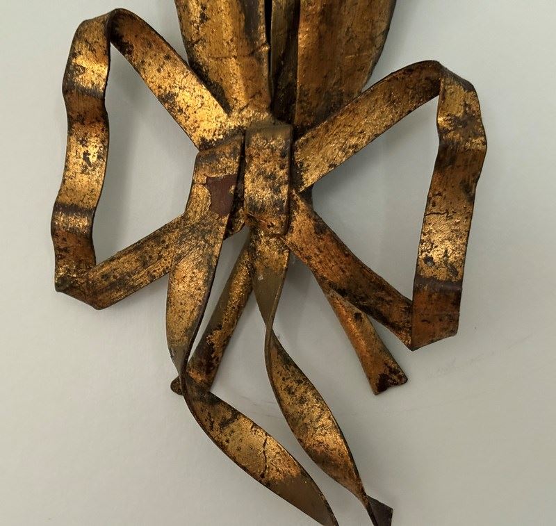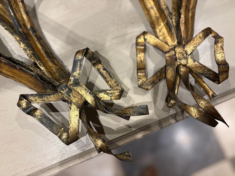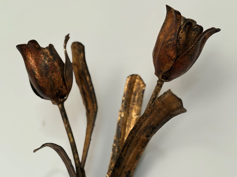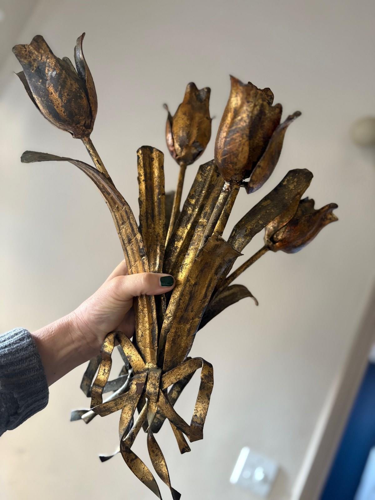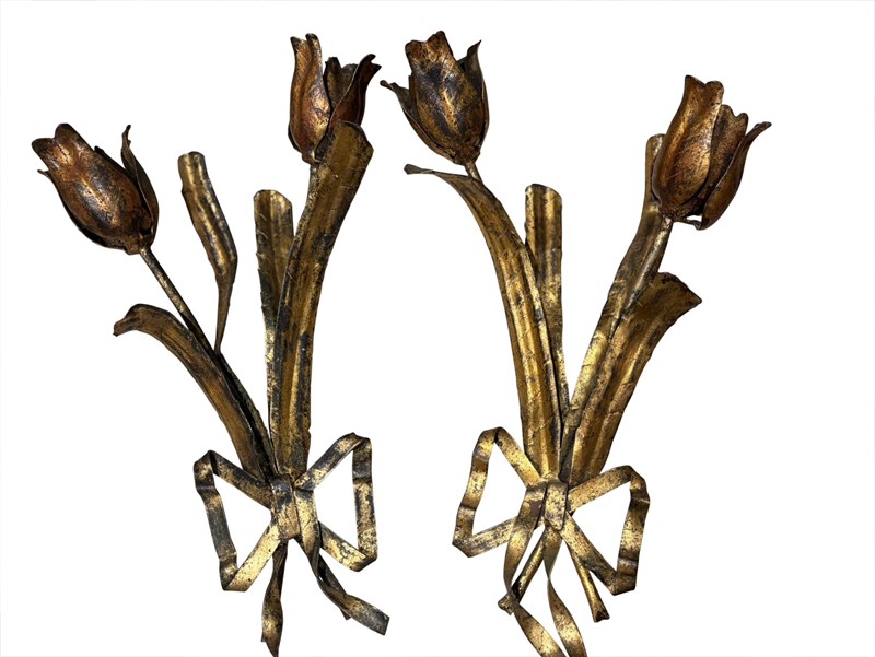 A scarce pair of tole 'hand tied tulip bouquet' wall light sconces, Italian, 1950's - exuberantly designed as naturalistic pairs of tulips tied with gilt bows, the leaves and blooms with detailed venation and subtle traces of lustre paint to petals. In good overall condition throughout commensurate with age and nothing detracting in our opinion. So unusual and scarce in this sought after design, size and condition. Extremely stylish on the wall! Can be rewired and PAT tested with new hand painted cream or gilt bulb holders.