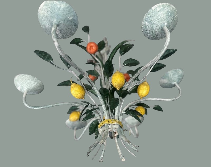 A vintage French six branch painted tole 'Citrus' chandelier - naturalistically designed as fruiting leafy branches loosely gathered and 'tied' at the base with metal twine, the branches set throughout with an abundance of bright lemons and oranges, the serpentine branches terminating with bulb holders of open saucer form, hand painted throughout with speckled paint detail adding depth, original ceiling rose present.