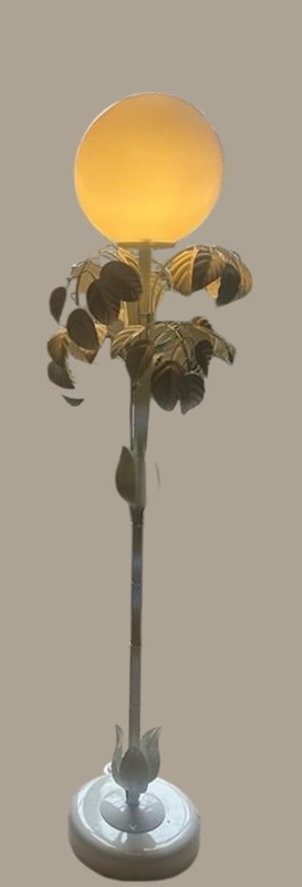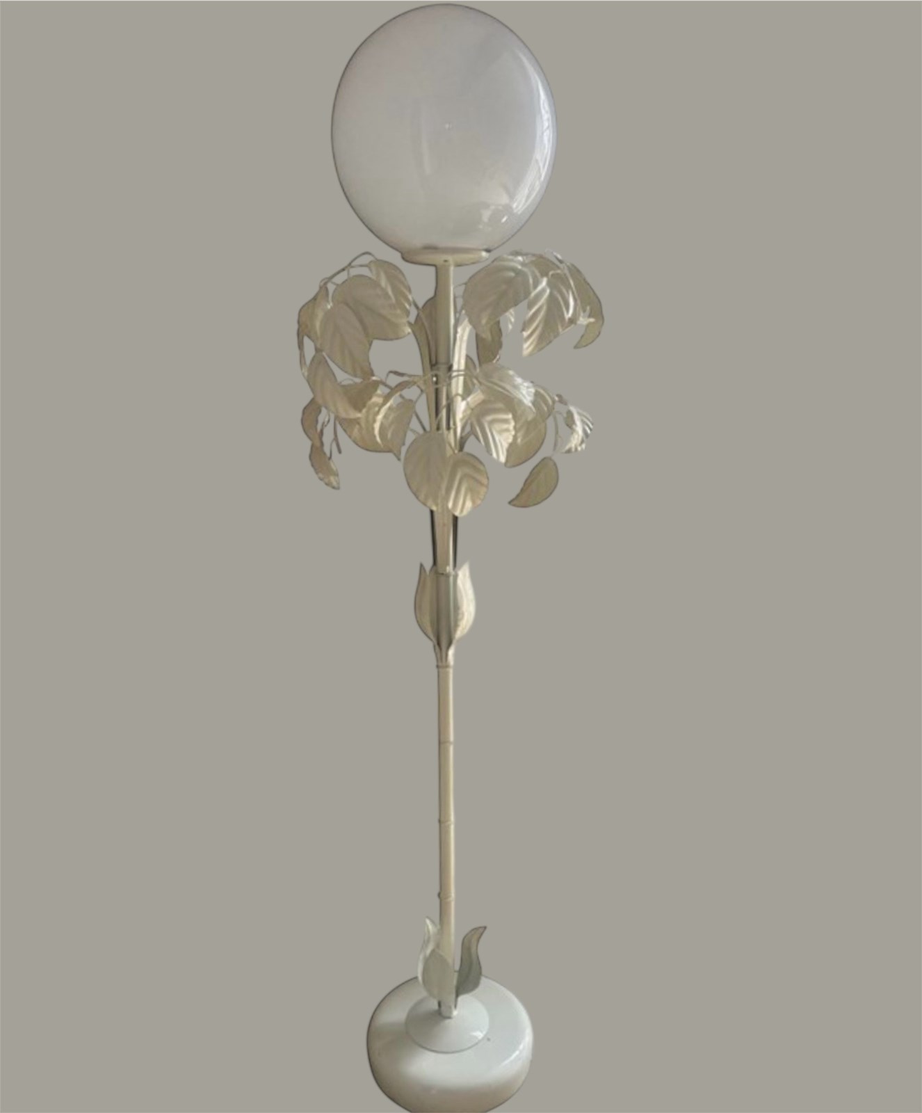An Italian painted tole 'leafy' floor lamp by Sergio Terzani, circa 1970 - naturalistically designed as a leafy canopy with plenty of movement below a large opaque glass globe shade, the 'trunk' in the form of a bamboo cane. Rewired with matching twisted silk 'switched' flex and PAT tested - ready to install.