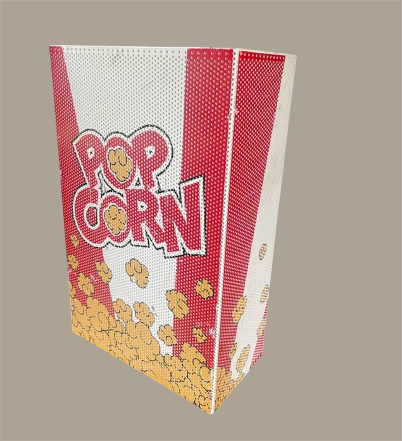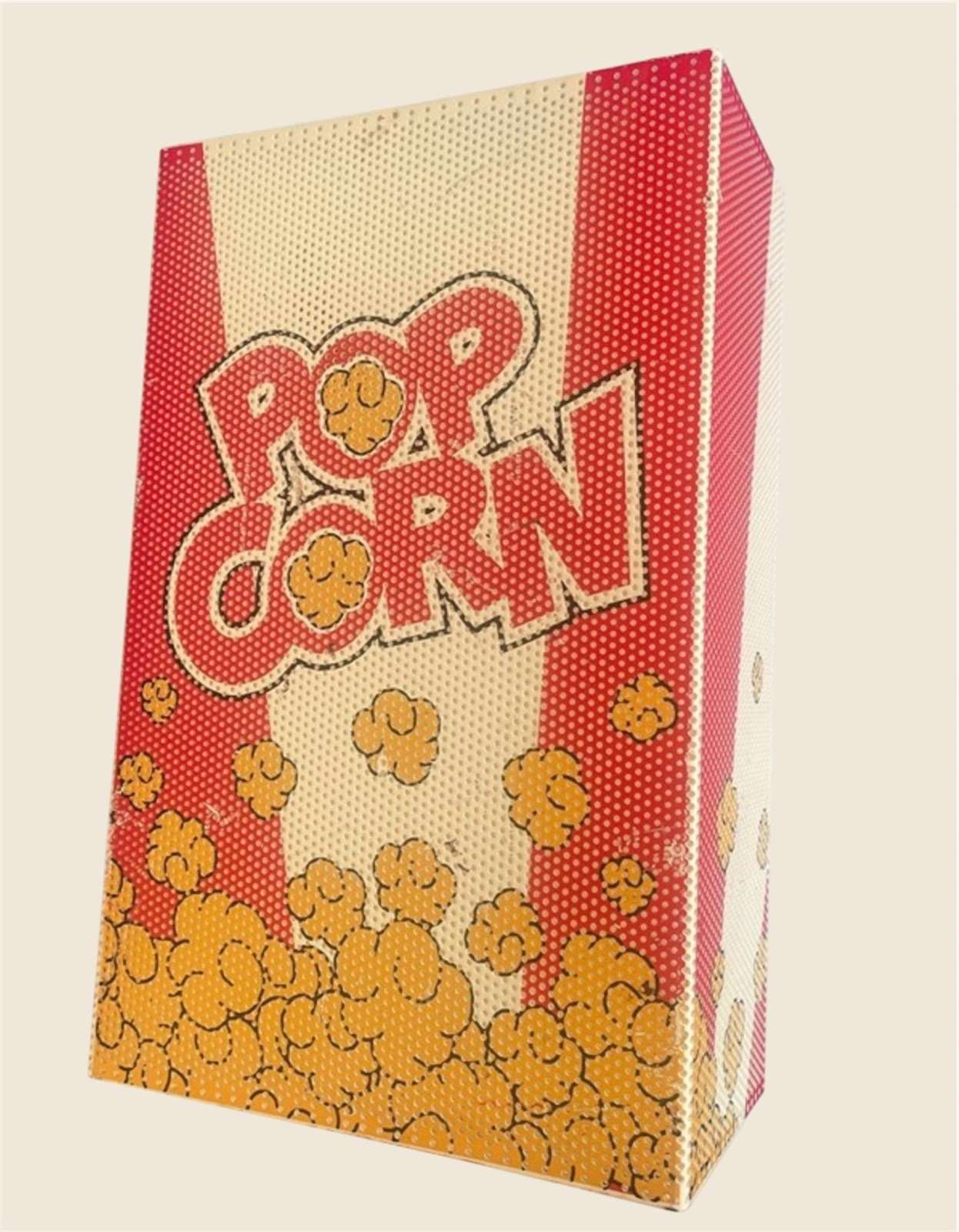 A large & original Pair of Disney pop art metal & lucite 'Pop Corn' movie theatre wall lights, made in Canada, 1970s. A rare find, these substantial feature wall lights are an original bespoke design for Walt Disney World Resorts & removed during refurbishment works. Designed as giant cartons of pop corn, the lucite interior with ceramic double bulb fitting for up and down lighting, the exterior of perforated metal printed in red, white and yellow, with original labels 'fabrique au Canada and Underwriters Laboratories Inc.' with stamped issue number and design number present, with integral backplate fixings. Original wiring present but will need rewiring and PAT testing ready for install. Please enquire. A fabulous, bespoke statement design. Stunning on the wall! Well made and in great condition commensurate with age. Ideal for any Pop Art or Disney fan!