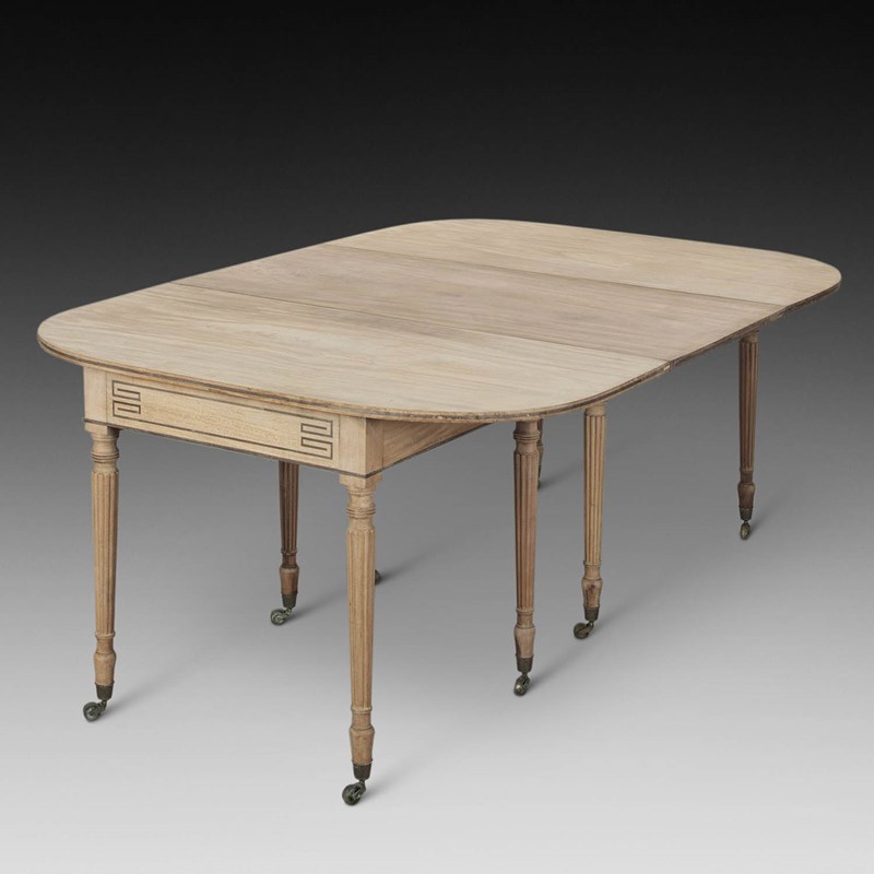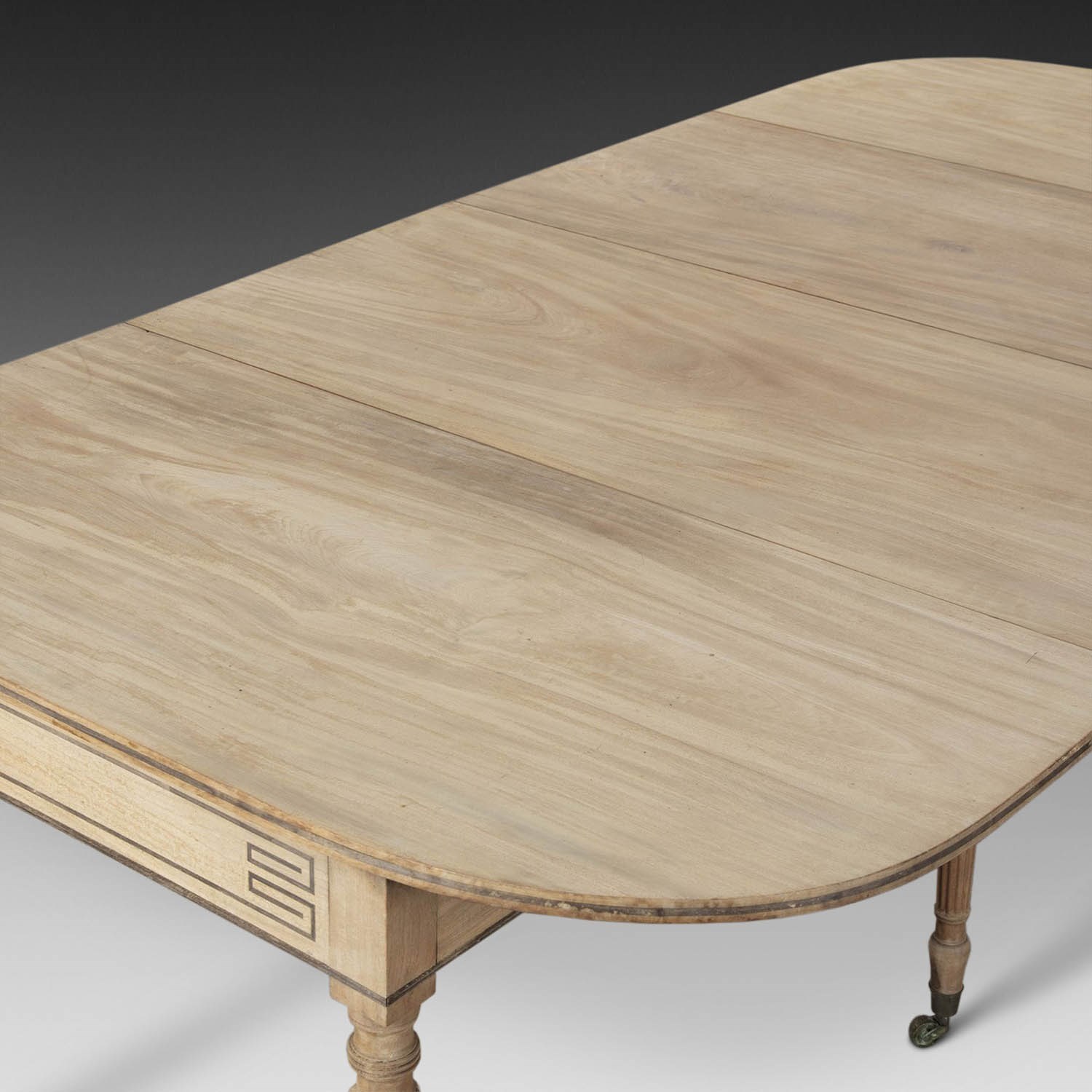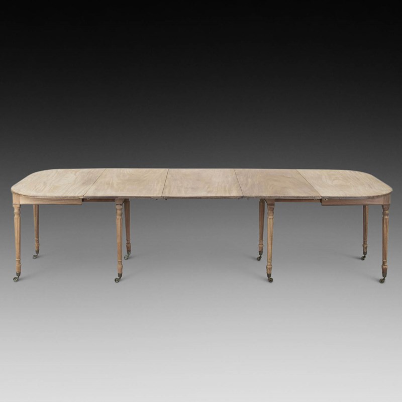 With a bleached finish, it stands elegantly on its fine turned and reeded legs that retain their original castors. Also the table has an additional three bleached mahogany leaves, when fully assembled, allows the table to seat eight comfortably.