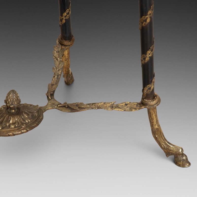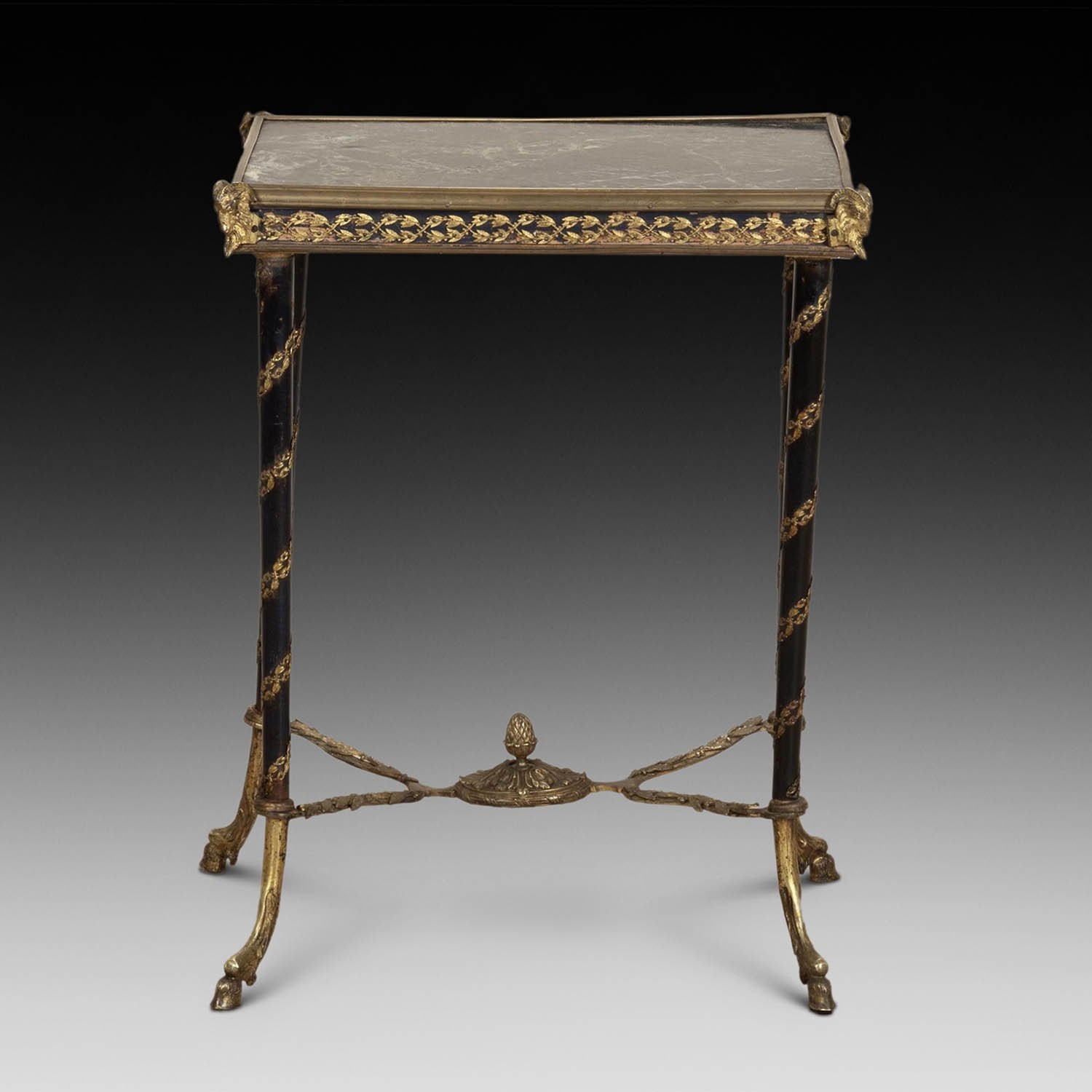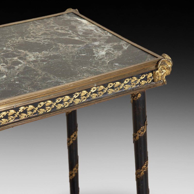 This unique table stands on four turned and swept legs that have brass decoration with the base finished with a quality hoof foot. The decorative base stretcher Is made of solid brass with a pineapple finial to the centre. The top is finished with a green and black marble which has brass mouldings around the edge and a solid cast brass rams heads to each corner.